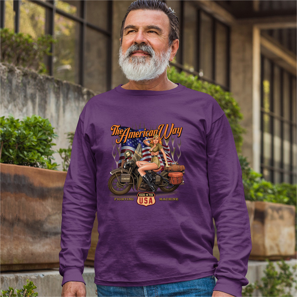 A print featuring a beautiful pin-up girl in leather boots sitting on a U.S. military motorcycle. There is the American Flag in the background and the words "The American Way" above it. At the bottom of the picture there is a shield which says: "made in the USA". "Fighting Machine" is written under the motorcycle's wheels. A great choice for a motorcycle enthusiast.