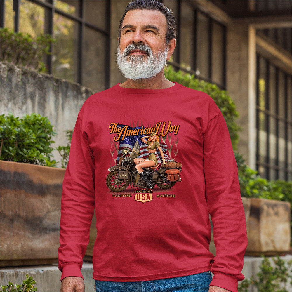 A print featuring a beautiful pin-up girl in leather boots sitting on a U.S. military motorcycle. There is the American Flag in the background and the words "The American Way" above it. At the bottom of the picture there is a shield which says: "made in the USA". "Fighting Machine" is written under the motorcycle's wheels. A great choice for a motorcycle enthusiast.