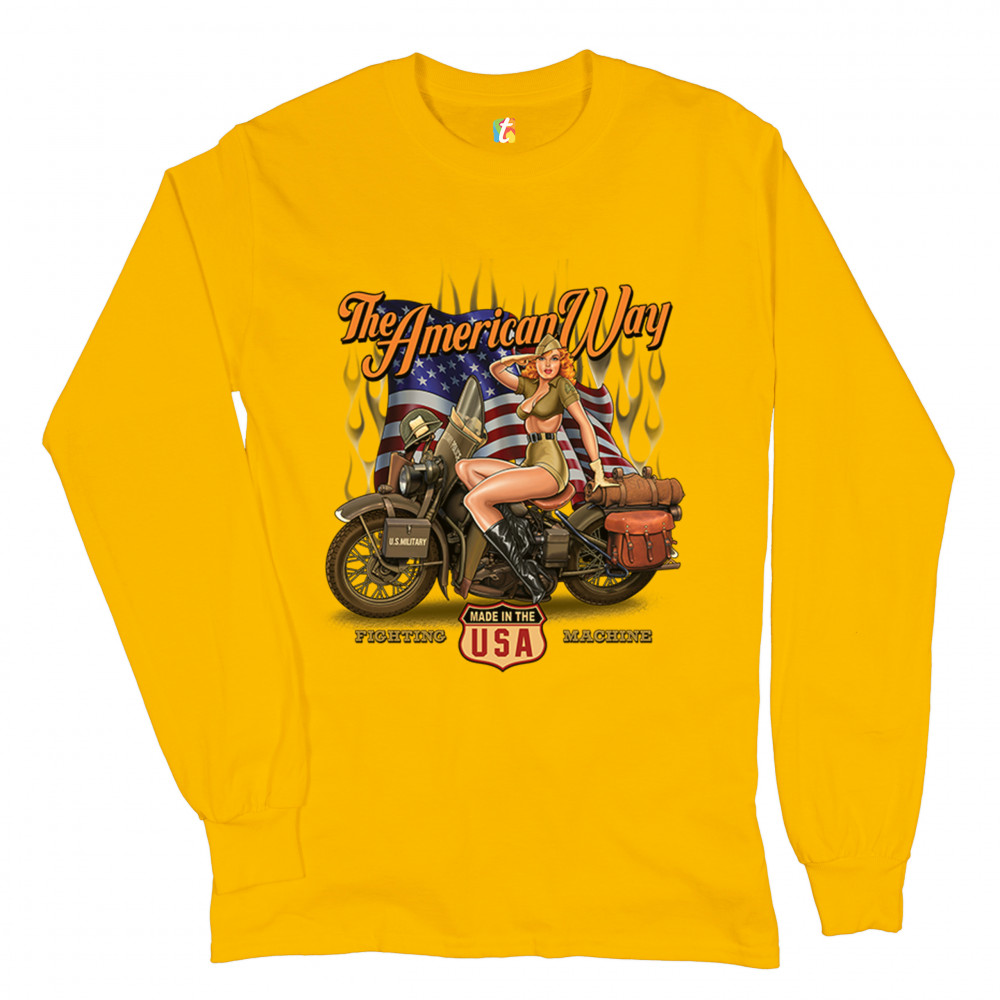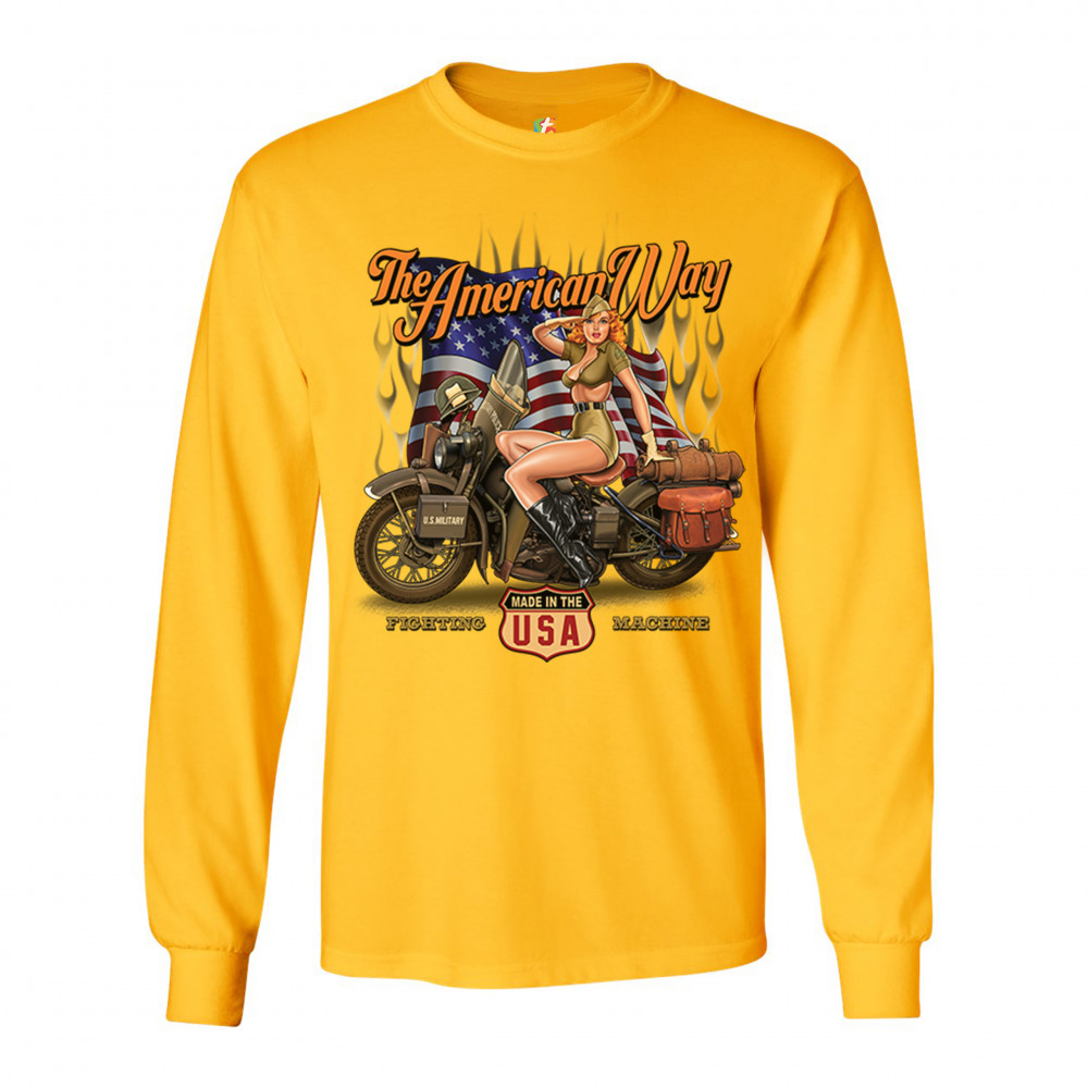 A print featuring a beautiful pin-up girl in leather boots sitting on a U.S. military motorcycle. There is the American Flag in the background and the words "The American Way" above it. At the bottom of the picture there is a shield which says: "made in the USA". "Fighting Machine" is written under the motorcycle's wheels. A great choice for a motorcycle enthusiast.