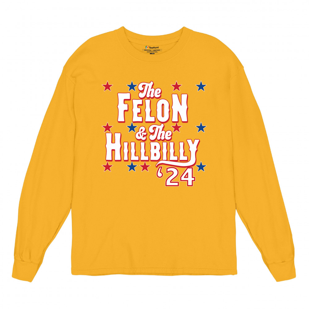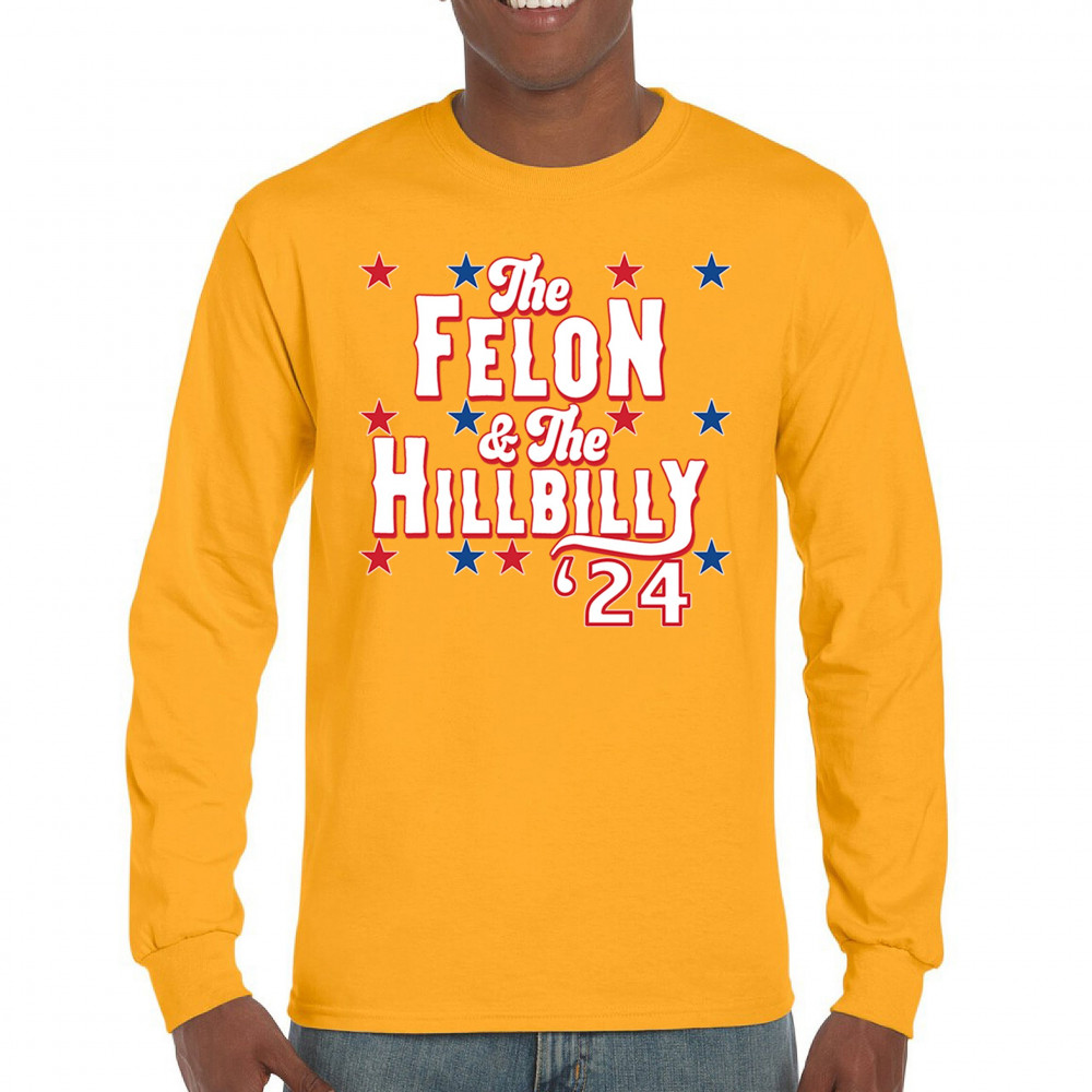 Humorous pro-Trump and Vance design for the 2024 election. "The Felon & The Hillbilly '24" captures conservative pride and humor in one bold statement.