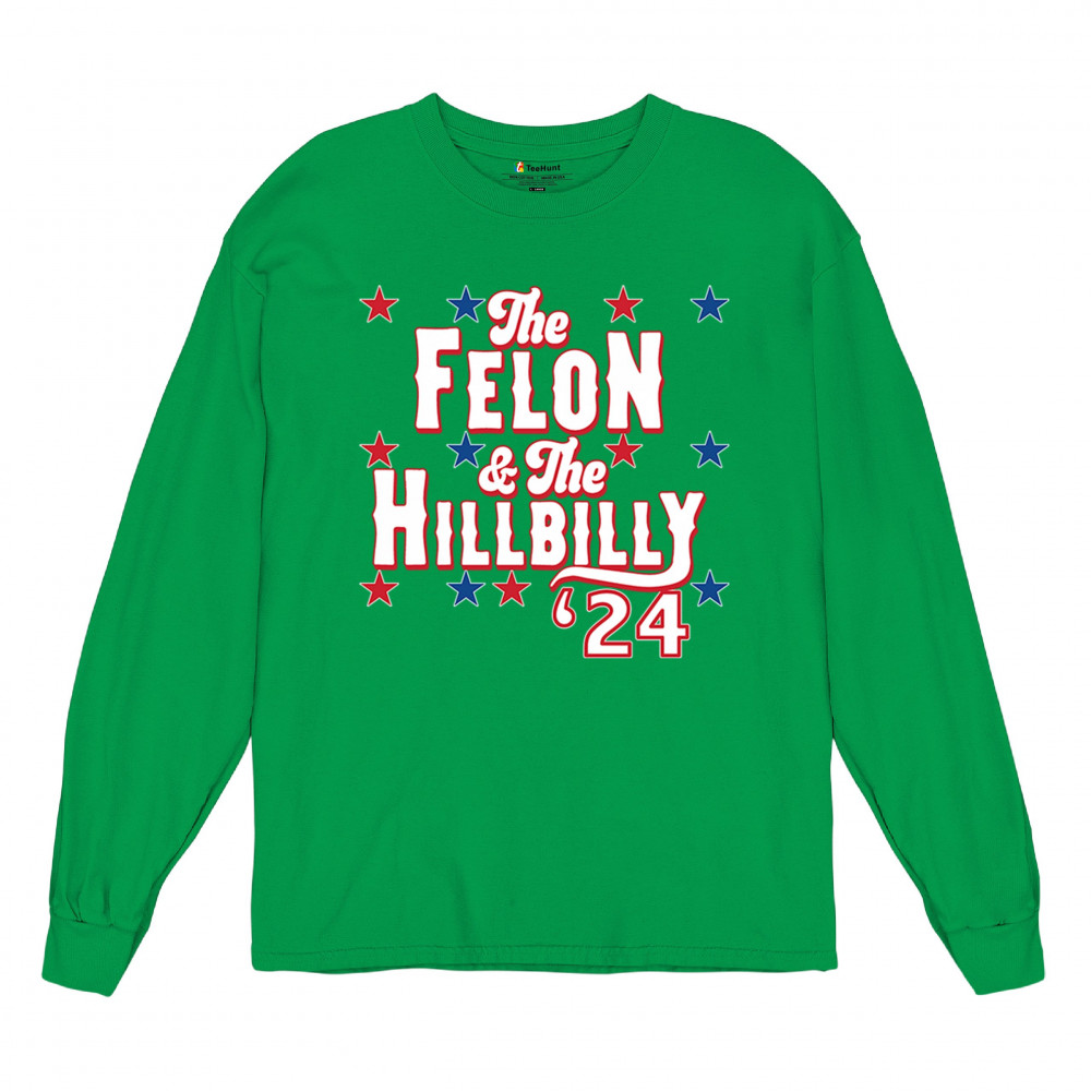 Humorous pro-Trump and Vance design for the 2024 election. "The Felon & The Hillbilly '24" captures conservative pride and humor in one bold statement.