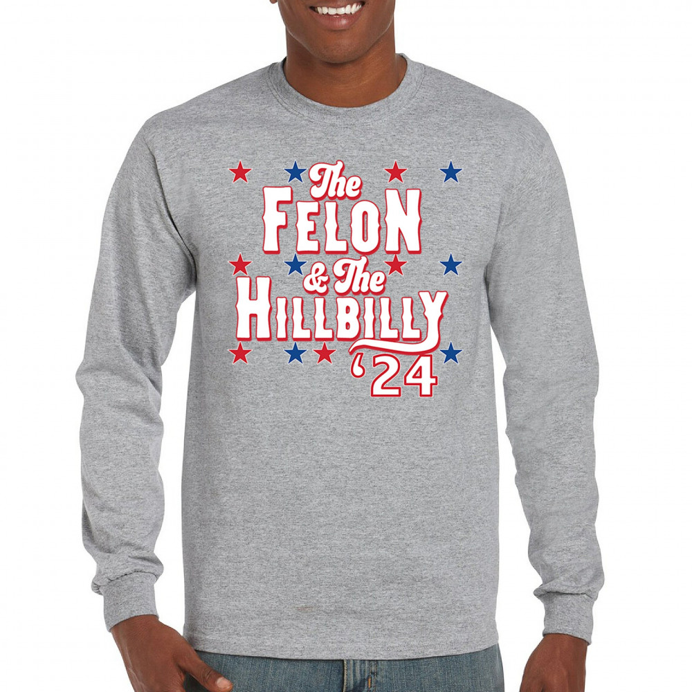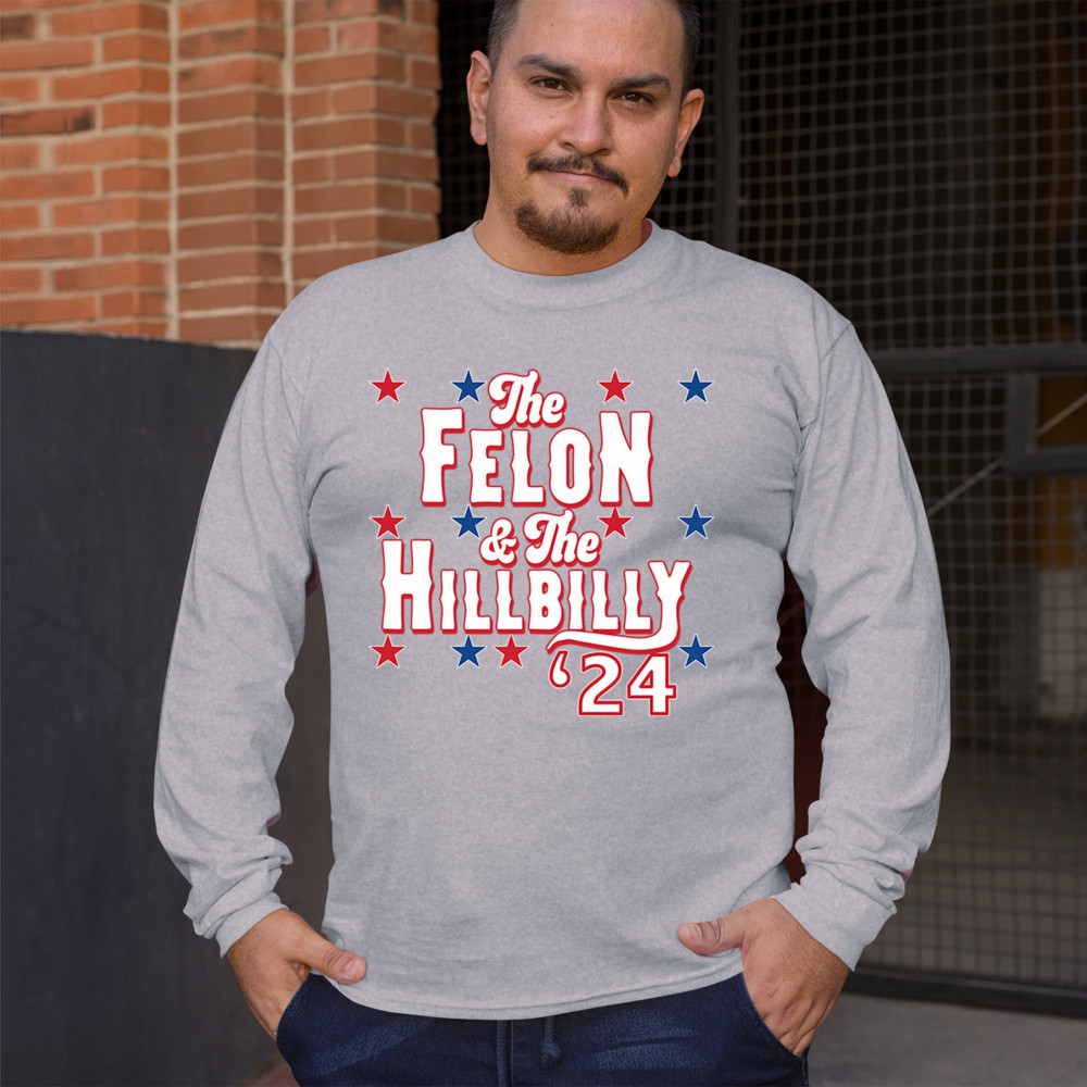 Humorous pro-Trump and Vance design for the 2024 election. "The Felon & The Hillbilly '24" captures conservative pride and humor in one bold statement.