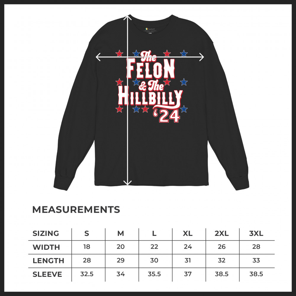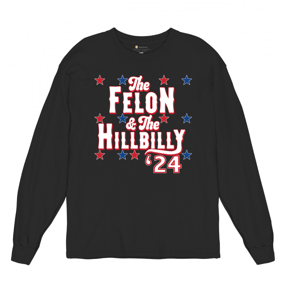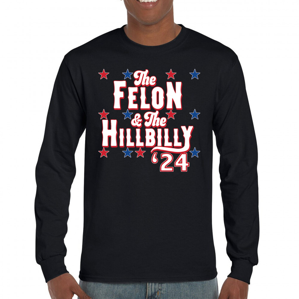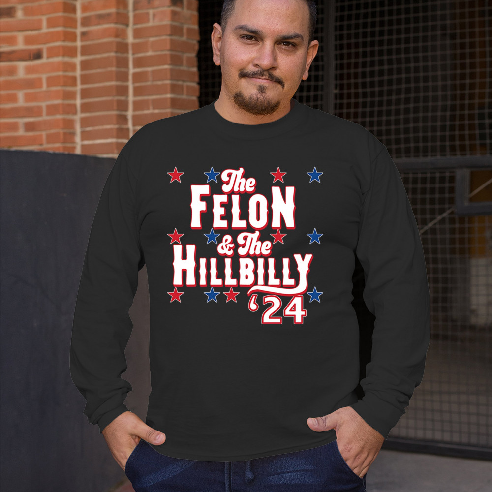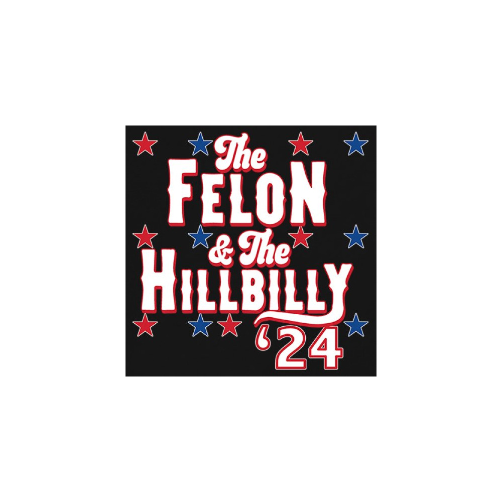Humorous pro-Trump and Vance design for the 2024 election. "The Felon & The Hillbilly '24" captures conservative pride and humor in one bold statement.