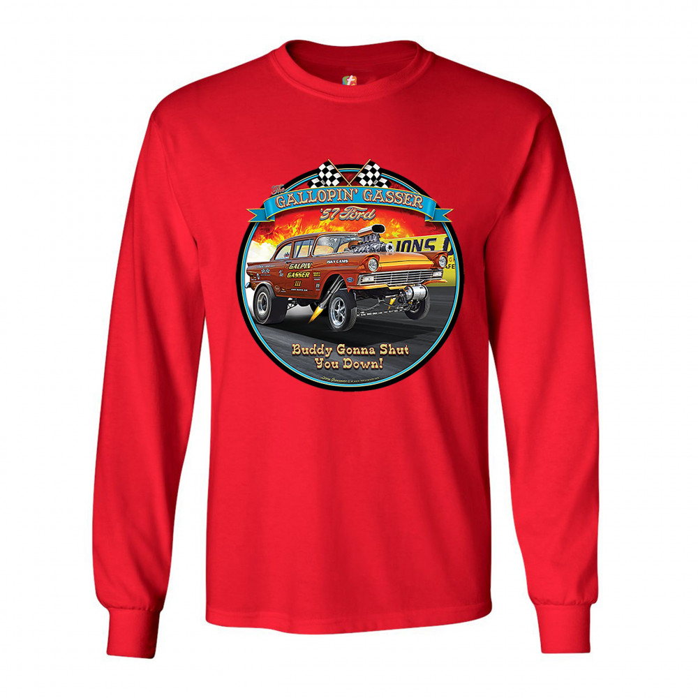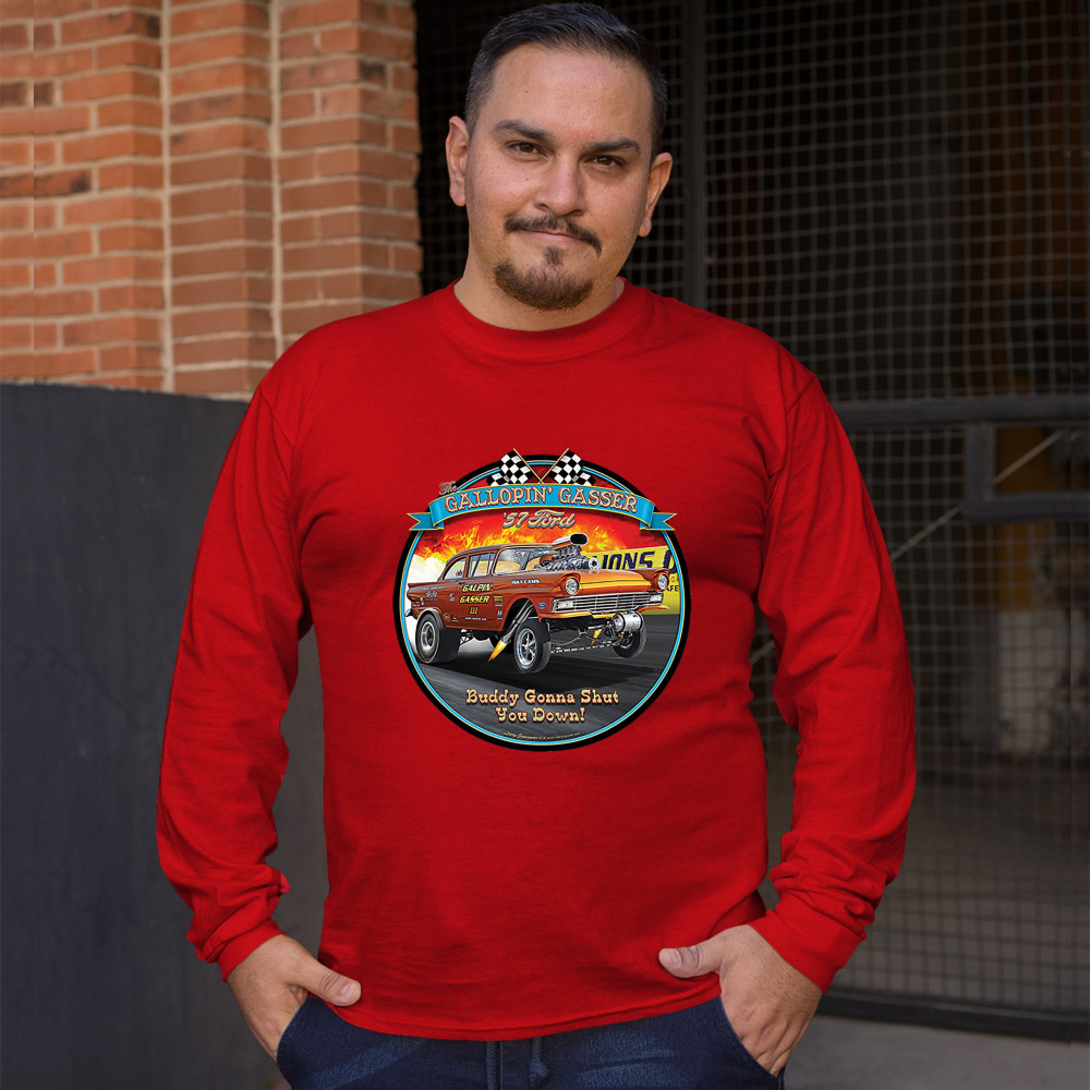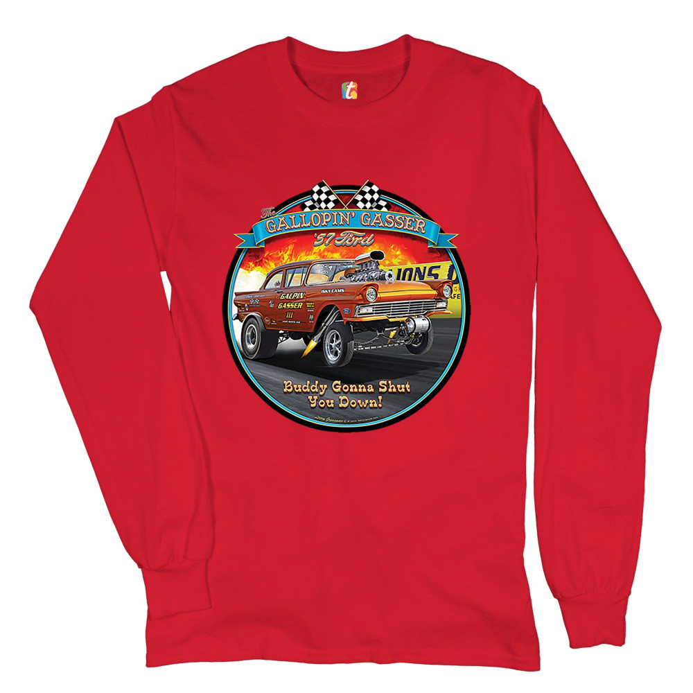 A print featuring a supercharged Ford Gasser sprinting on it's rear wheels in a drag race leaving burning tracks behind it. The print also features a pair of racing flags and says: "The Gallopin' Gasser '57 Ford" and "Buddy Gonna Shut You Down!". A great