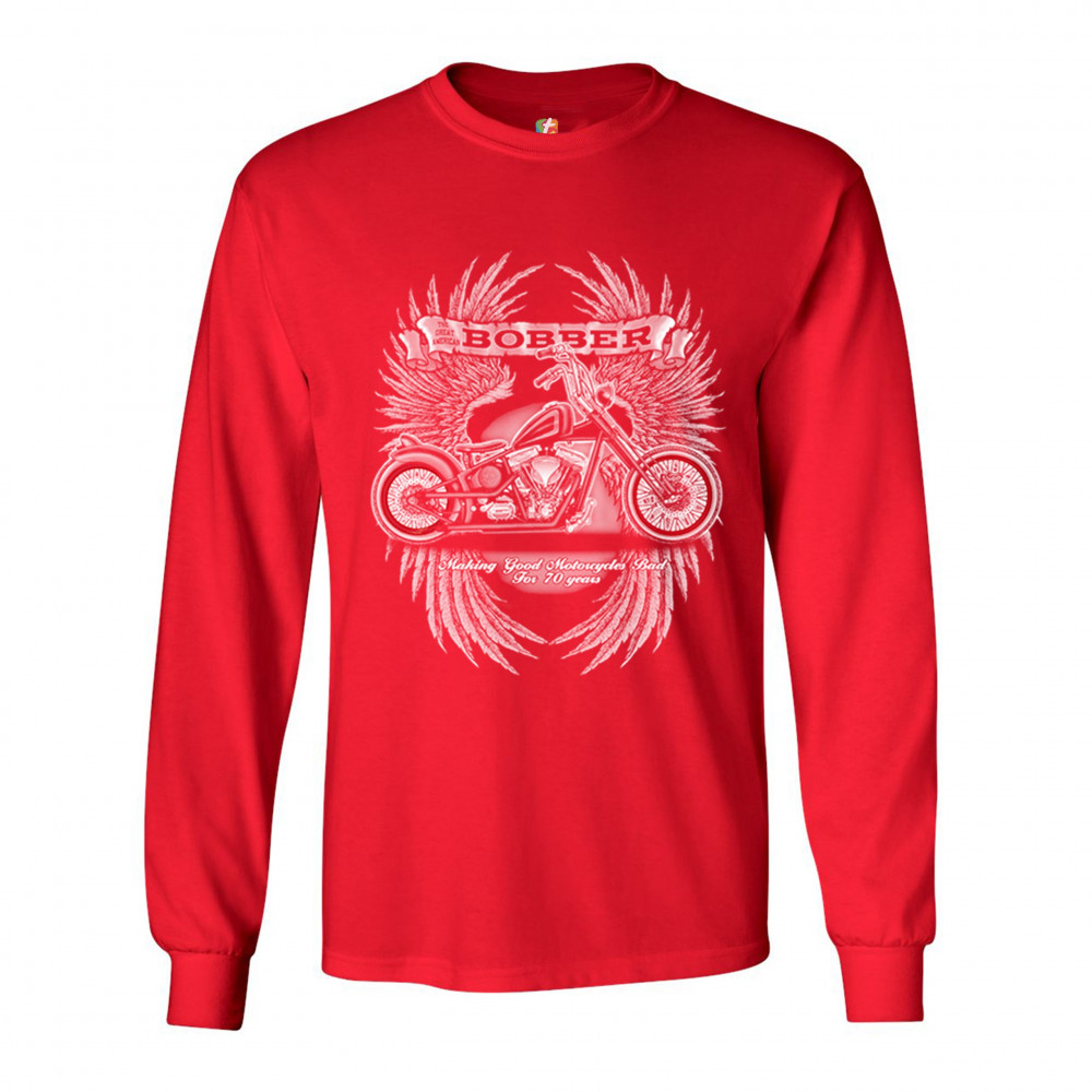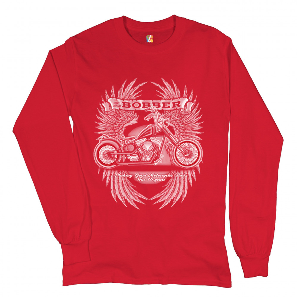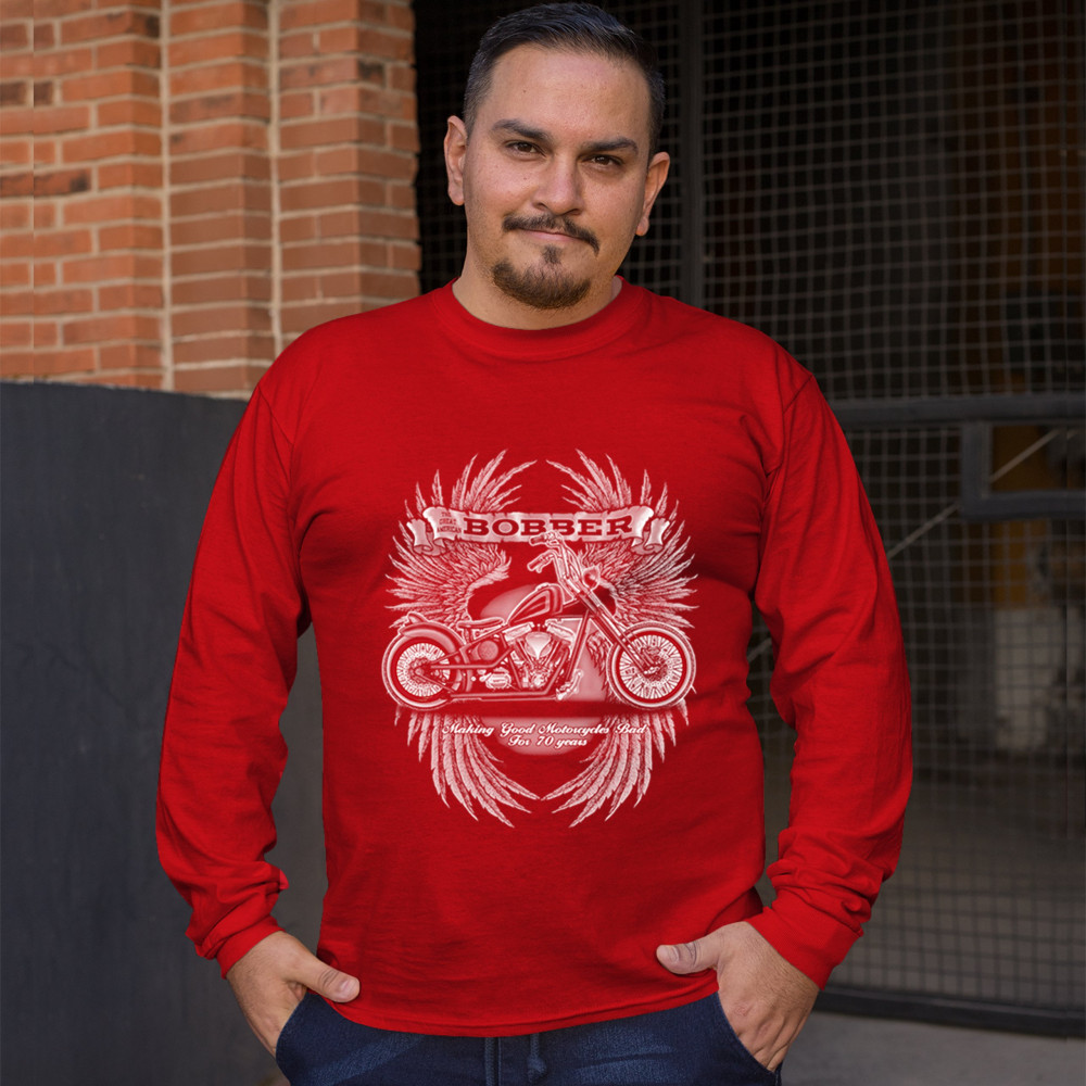 A print featuring a bobber motorcycle and a pair of wings in the background. At the top there is a stripe with "The great American bobber" written on it. At the bottom the print says: "making good motorcycles bad for 70 years". A great choice for a motorc