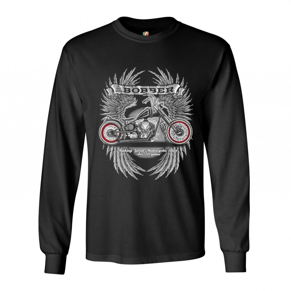 A print featuring a bobber motorcycle and a pair of wings in the background. At the top there is a stripe with "The great American bobber" written on it. At the bottom the print says: "making good motorcycles bad for 70 years". A great choice for a motorc