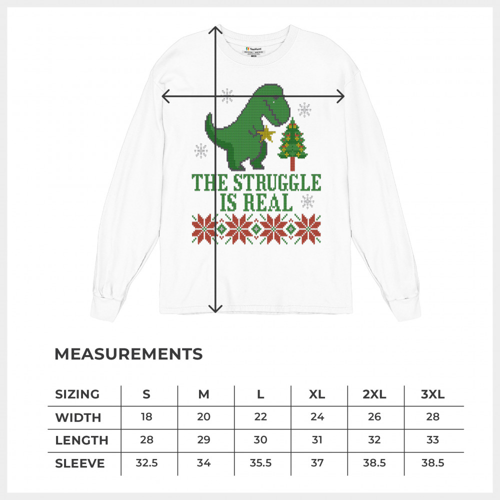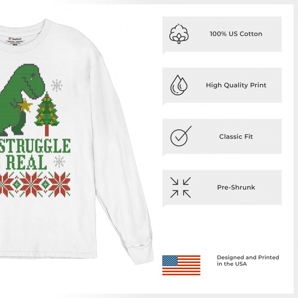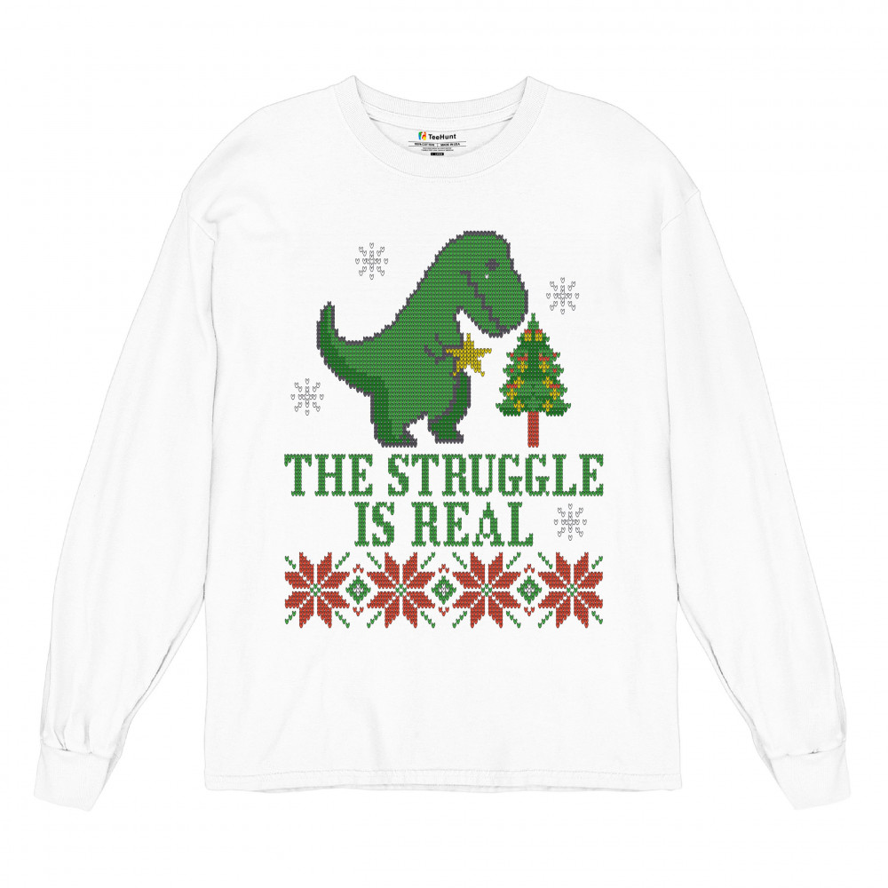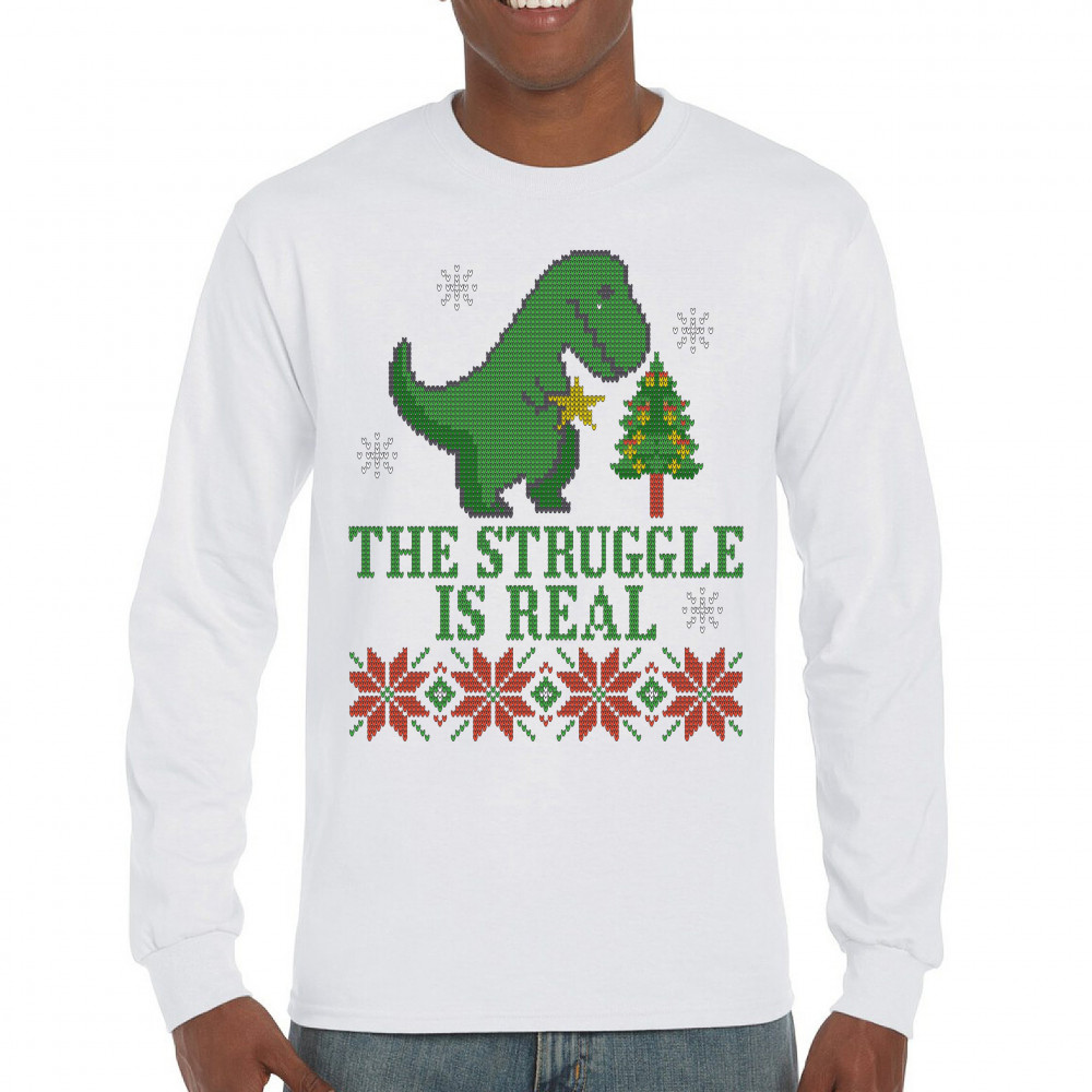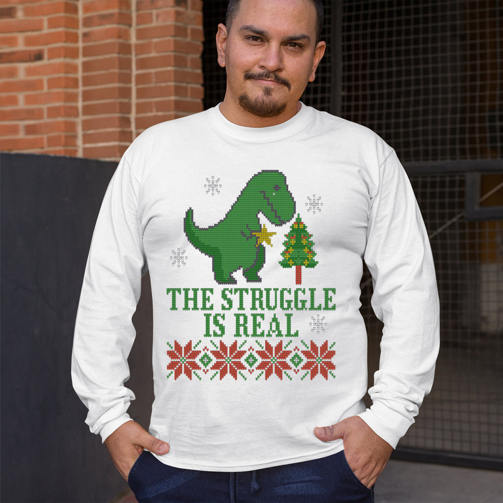 A funny print saying: "The Struggle Is Real" and featuring a sad tyrannosaurus rex holding a toy star in it's short hands standing by a Christmas tree. The print is decorated as an ugly sweater. Amazing choice to make people smile and spread positive vibe