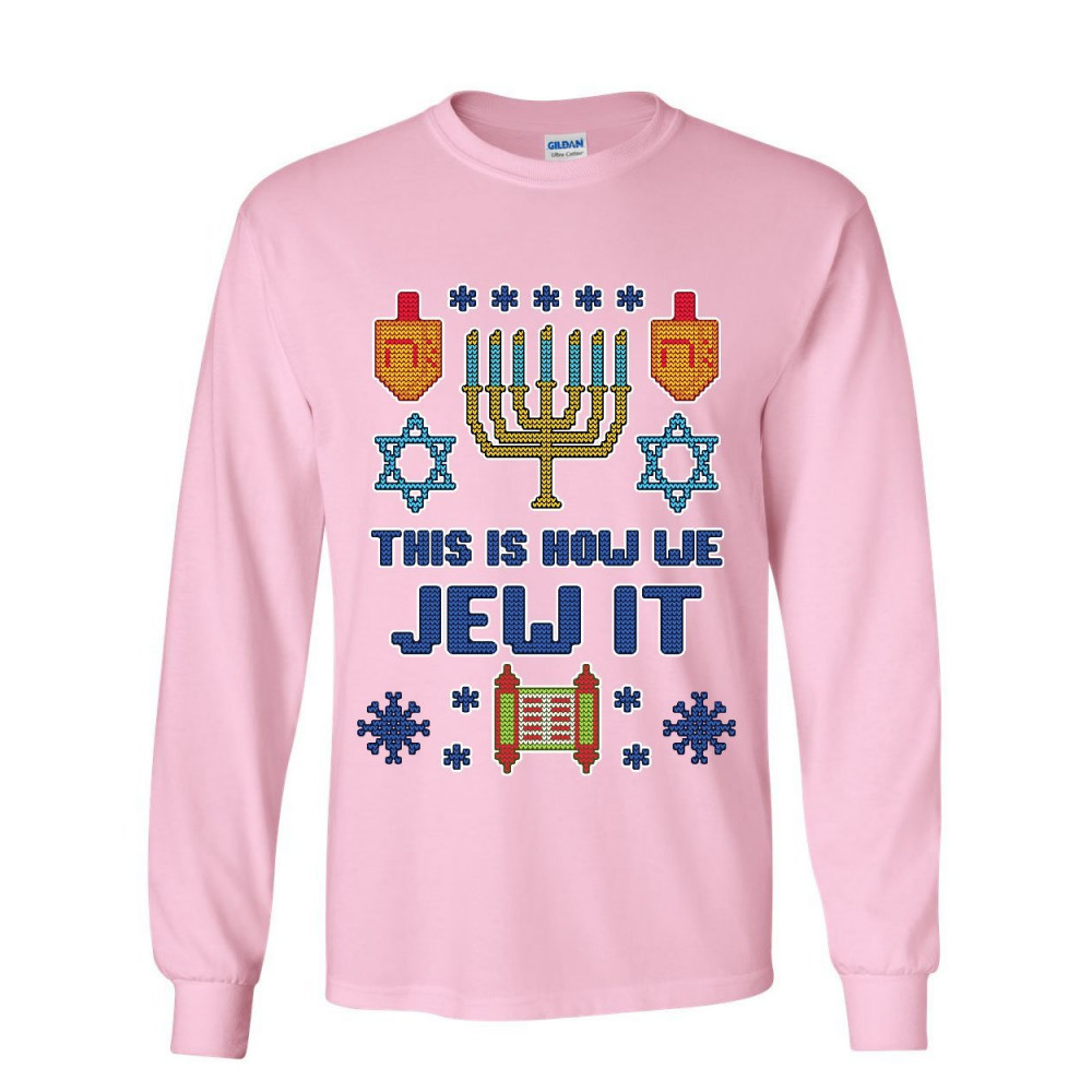 THIS IS HOW WE JEW IT UGLY SWEATER this is how we jew it ugly long sleeve t-shirt hannukah torah menorah funny tee light pink