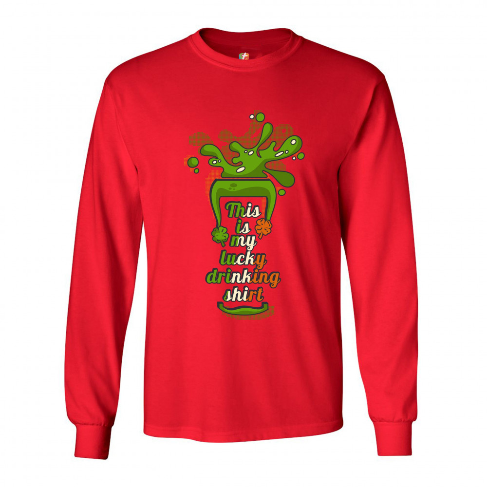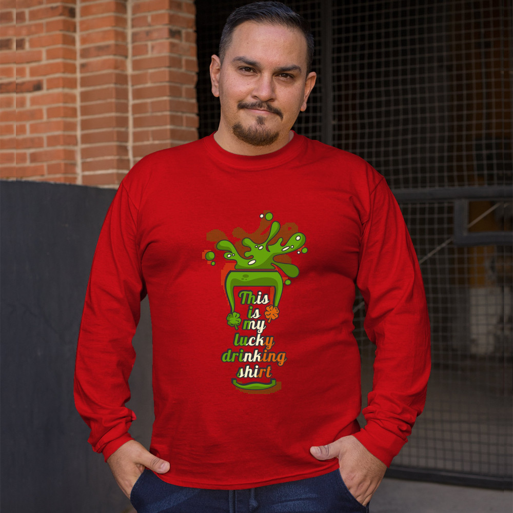 A print featuring a silhouette of a glass with beer spilling out of it. Inside the glass there is a text: "This is my lucky drinking shirt" in the colors of the flag of Ireland. A great choice to wear on March 17 to celebrate the St. Patrick's Day and sho