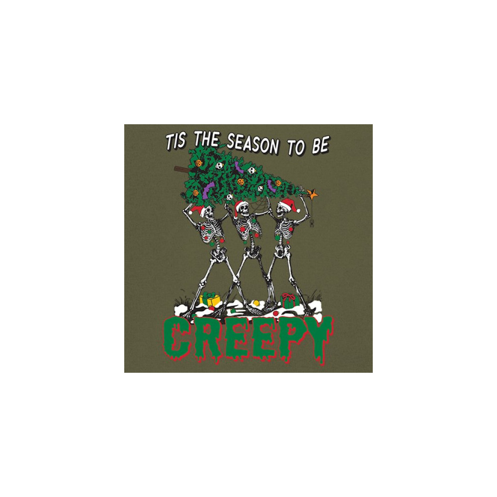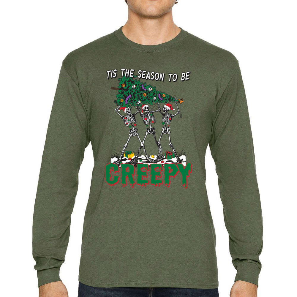 "Tis the Season to Be Creepy" combines holiday cheer with a hauntingly fun twist. This creative design features skeletons donning Santa hats as they carry a spooky Christmas tree decorated with eerie ornaments. Perfect for holiday gatherings, Secret Santa gifts, or themed parties, this design celebrates the festive and the macabre. Embrace the jolliest and creepiest bunch this season with this standout apparel.