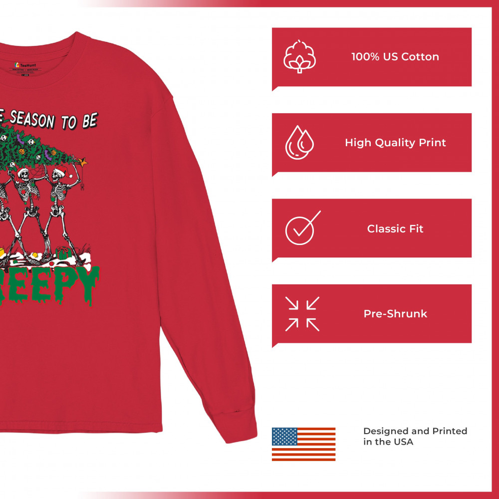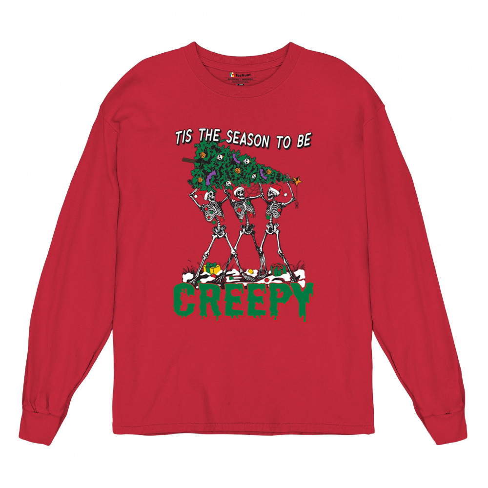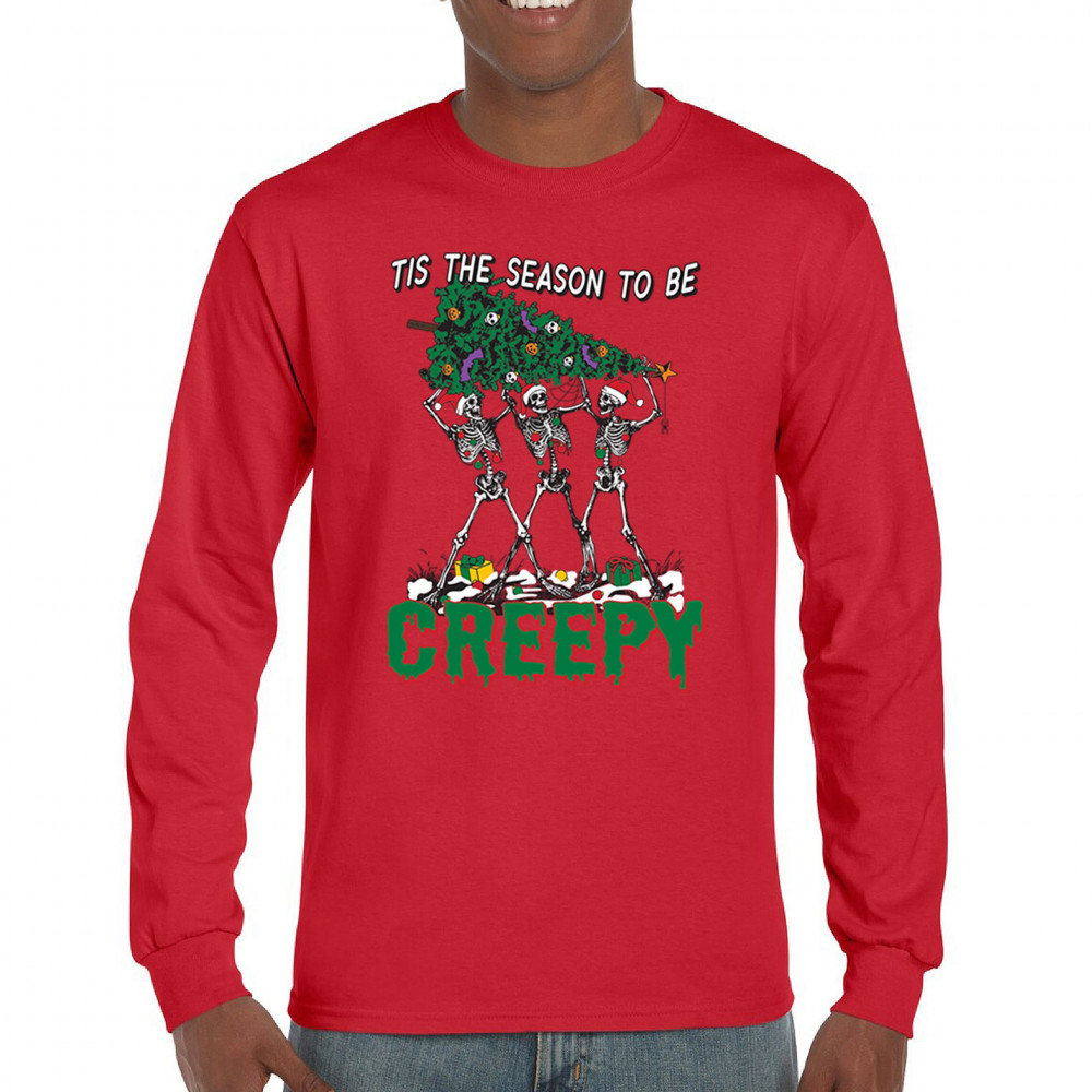 "Tis the Season to Be Creepy" combines holiday cheer with a hauntingly fun twist. This creative design features skeletons donning Santa hats as they carry a spooky Christmas tree decorated with eerie ornaments. Perfect for holiday gatherings, Secret Santa gifts, or themed parties, this design celebrates the festive and the macabre. Embrace the jolliest and creepiest bunch this season with this standout apparel.