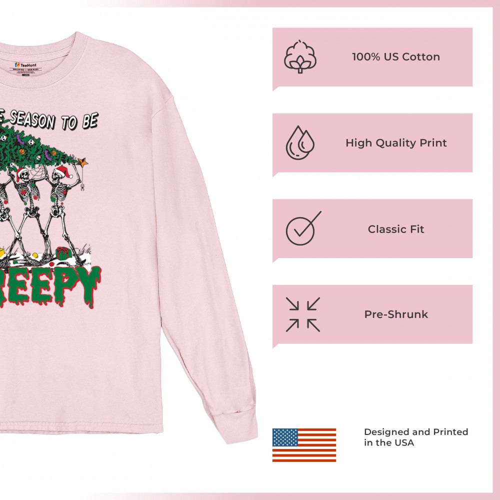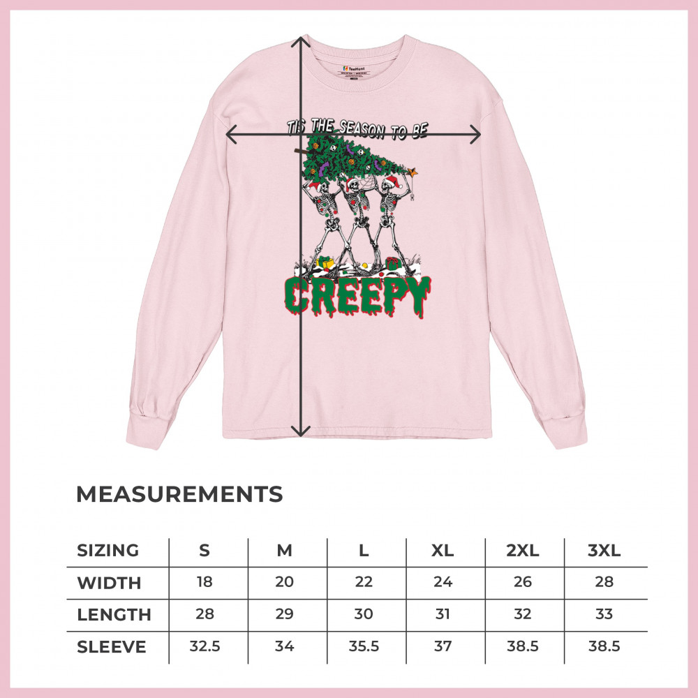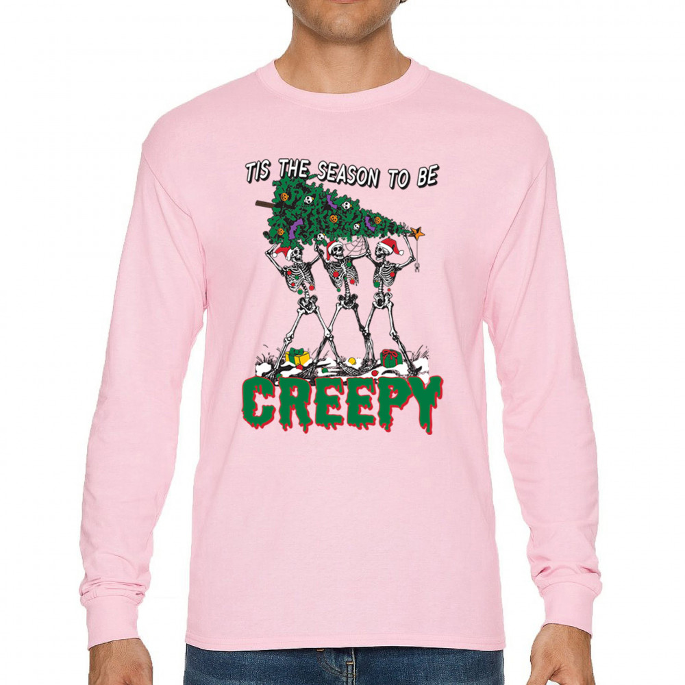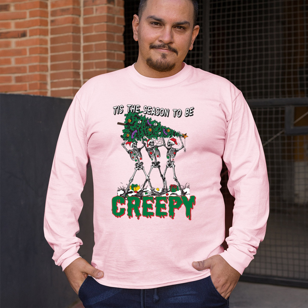 "Tis the Season to Be Creepy" combines holiday cheer with a hauntingly fun twist. This creative design features skeletons donning Santa hats as they carry a spooky Christmas tree decorated with eerie ornaments. Perfect for holiday gatherings, Secret Santa gifts, or themed parties, this design celebrates the festive and the macabre. Embrace the jolliest and creepiest bunch this season with this standout apparel.