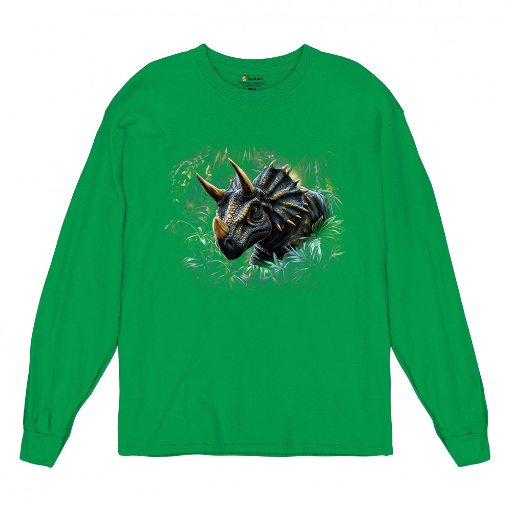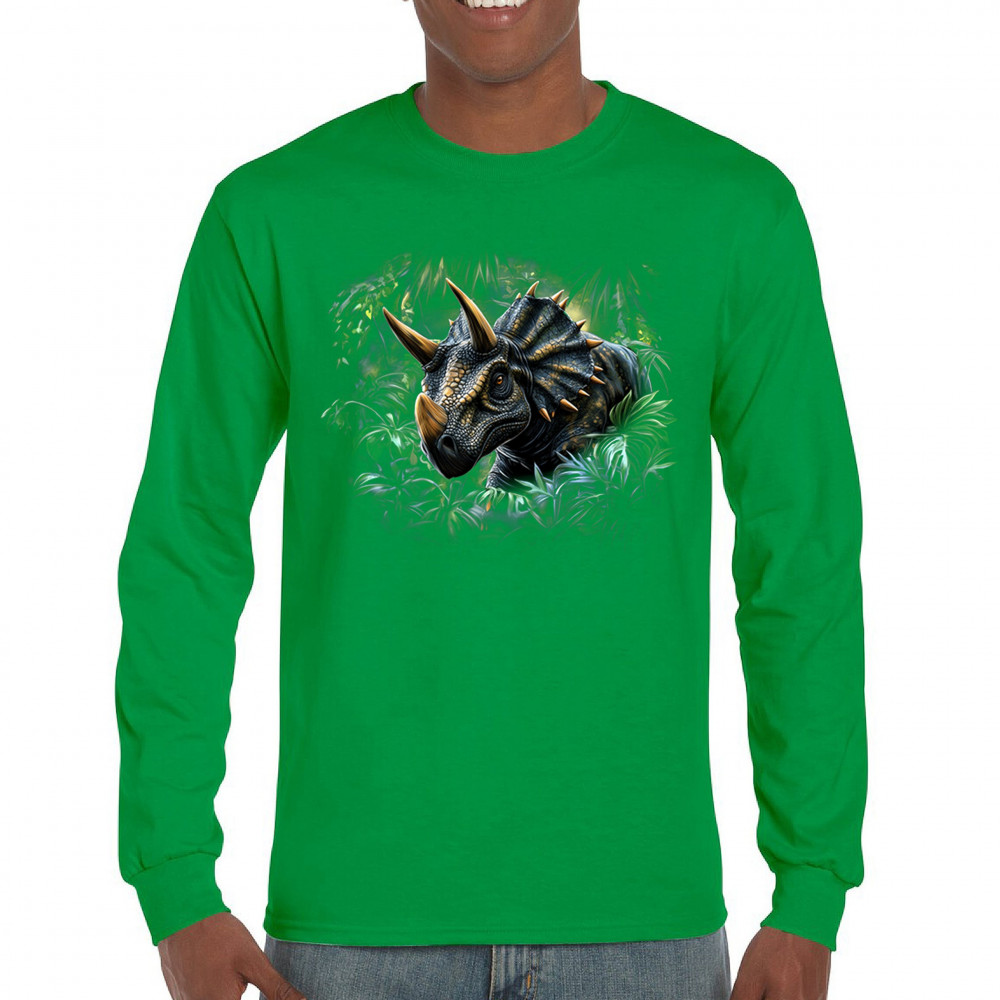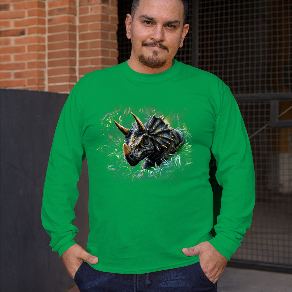 Charge into the past with this vivid triceratops design. Featuring a hyper-detailed horned dinosaur surrounded by jungle leaves, this design is perfect for dino lovers, fossil enthusiasts, and anyone fascinated by prehistoric beasts. Great for Jurassic parties, safari parks, or museum visits, it brings ancient strength to life.