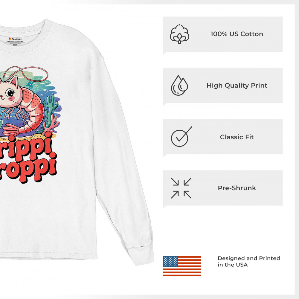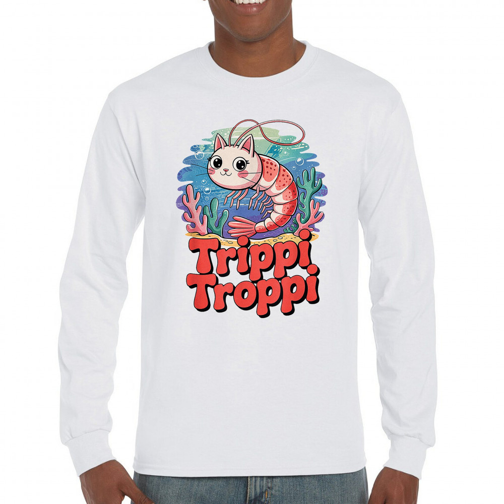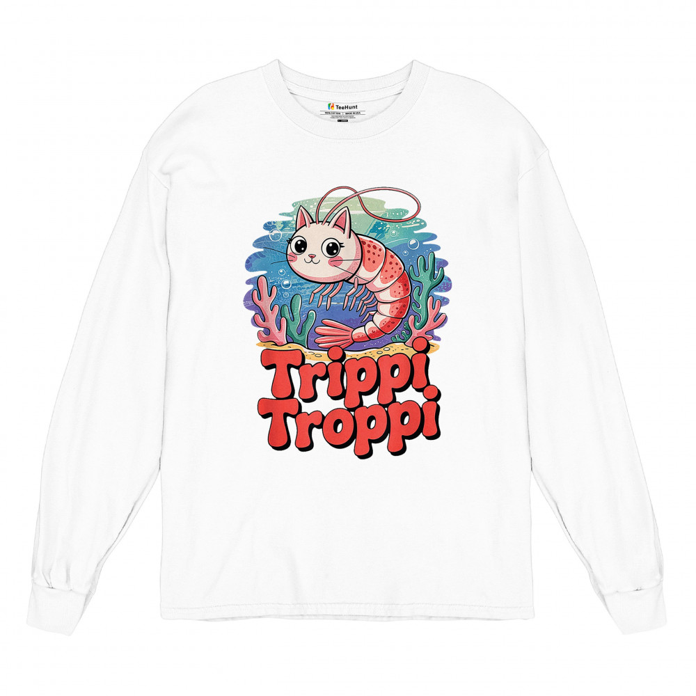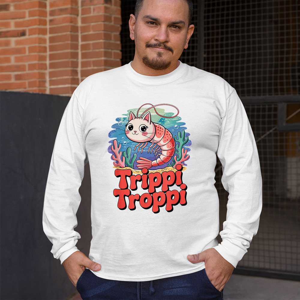 Dive deep into absurdity with Trippi Troppi—a surreal shrimp-cat fusion straight out of Italian Brainrot territory. This design captures cursed animal chaos, weirdcore visuals, TikTok meme culture, and underwater fever dream aesthetics. Made for Gen Z humor addicts, ocean meme fans, and ironic fashion lovers alike.