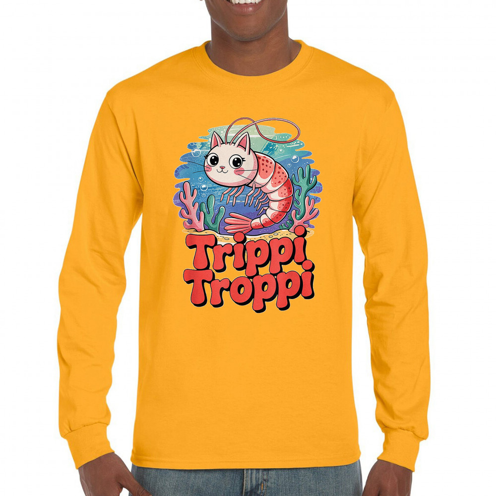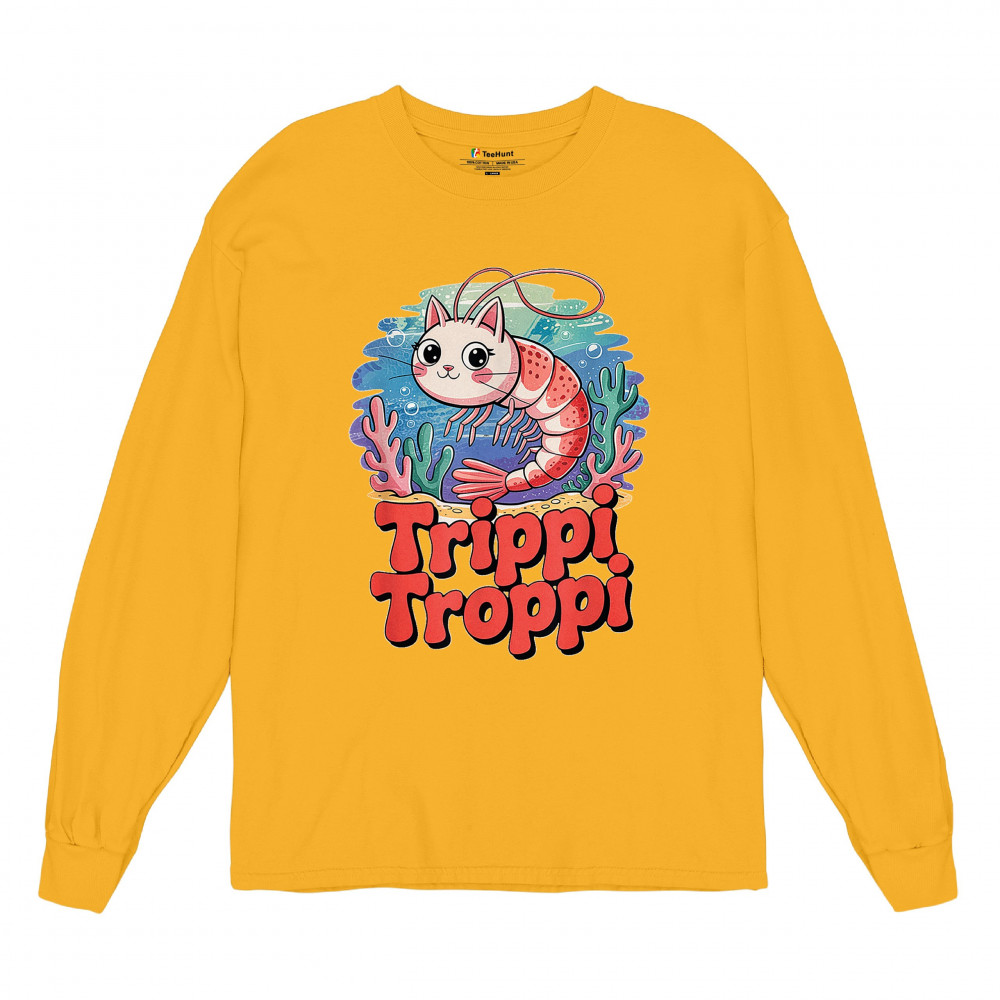 Dive deep into absurdity with Trippi Troppi—a surreal shrimp-cat fusion straight out of Italian Brainrot territory. This design captures cursed animal chaos, weirdcore visuals, TikTok meme culture, and underwater fever dream aesthetics. Made for Gen Z humor addicts, ocean meme fans, and ironic fashion lovers alike.