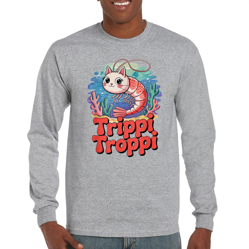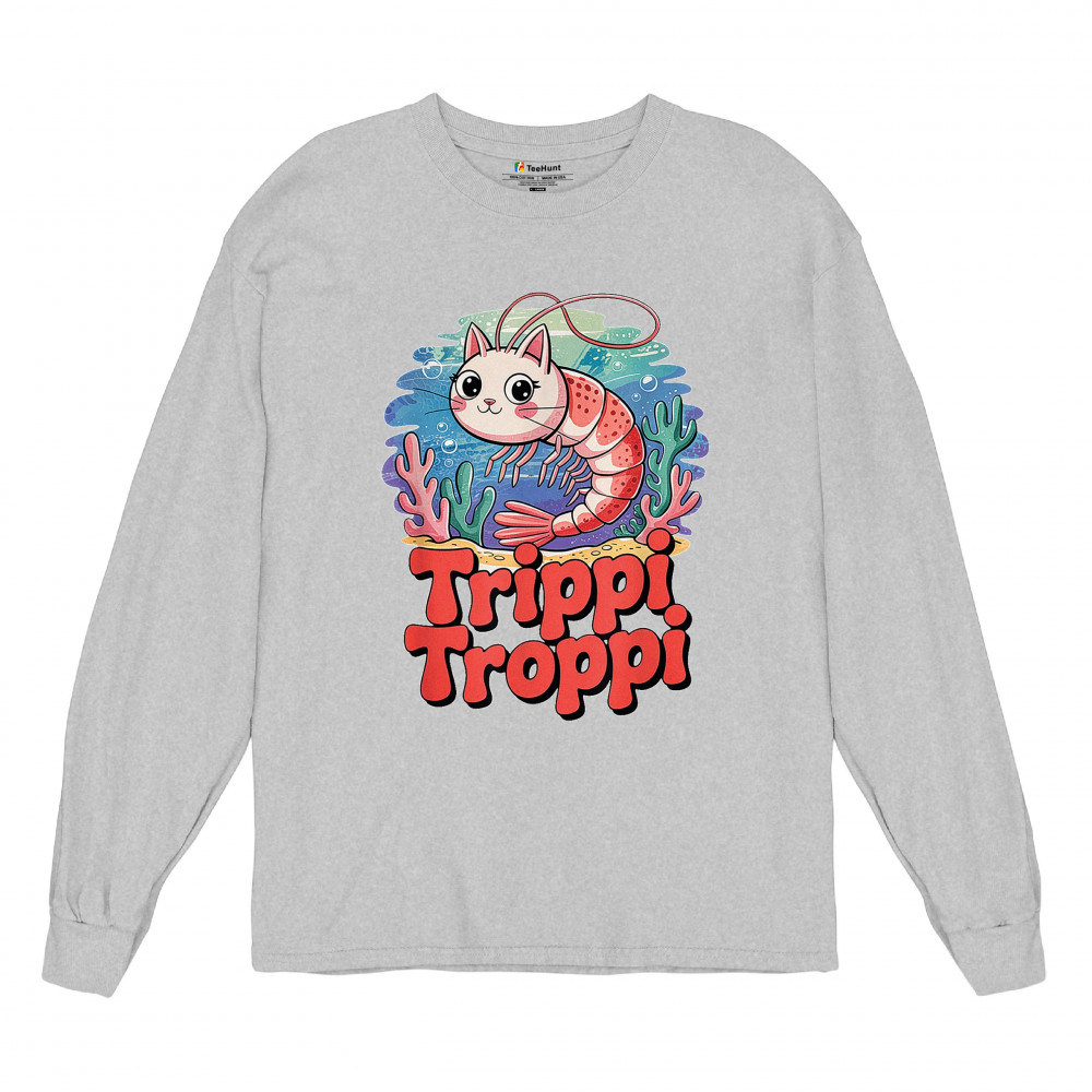 Dive deep into absurdity with Trippi Troppi—a surreal shrimp-cat fusion straight out of Italian Brainrot territory. This design captures cursed animal chaos, weirdcore visuals, TikTok meme culture, and underwater fever dream aesthetics. Made for Gen Z humor addicts, ocean meme fans, and ironic fashion lovers alike.