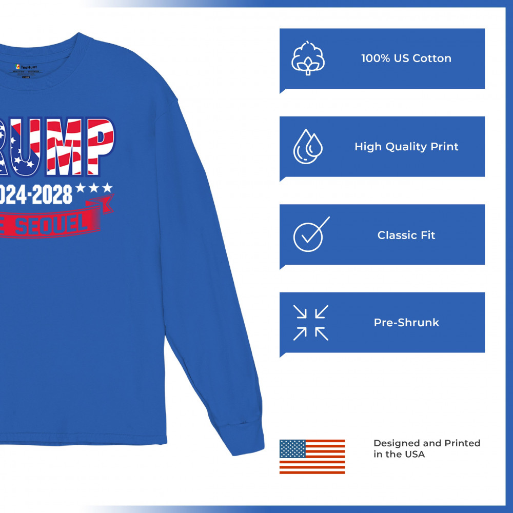 Stand with Trump for 2024-2028 in "The Sequel" design, celebrating America First, conservative values, and 4 more years of patriotic vision.