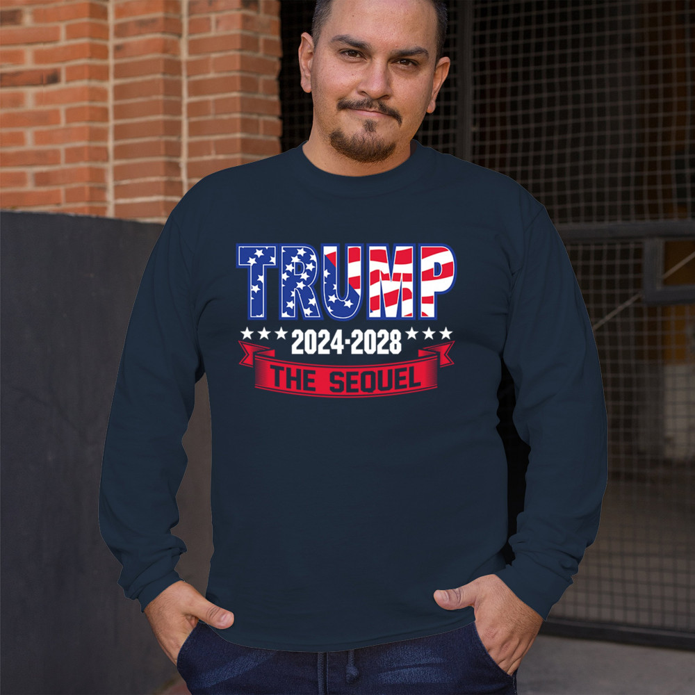 Stand with Trump for 2024-2028 in "The Sequel" design, celebrating America First, conservative values, and 4 more years of patriotic vision.