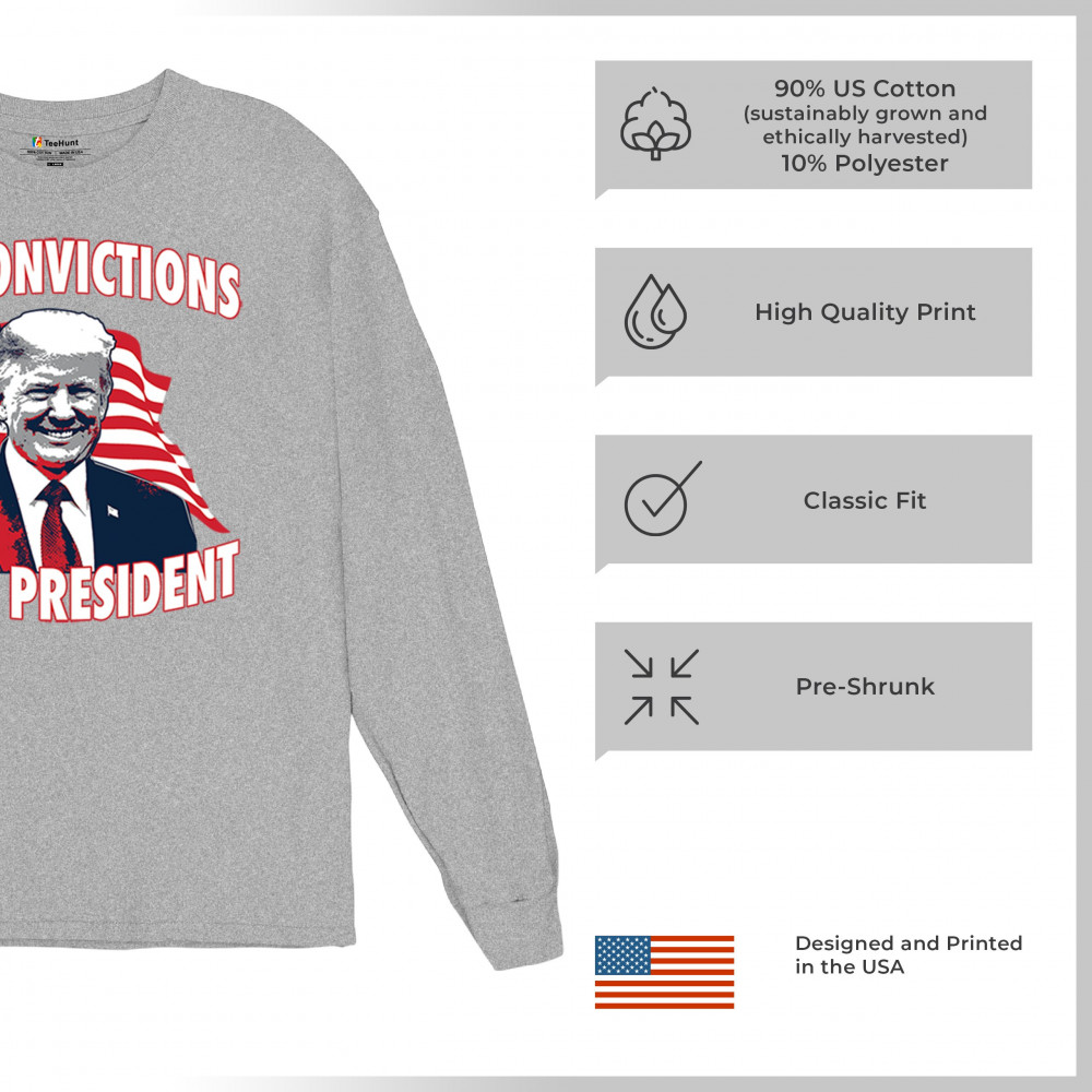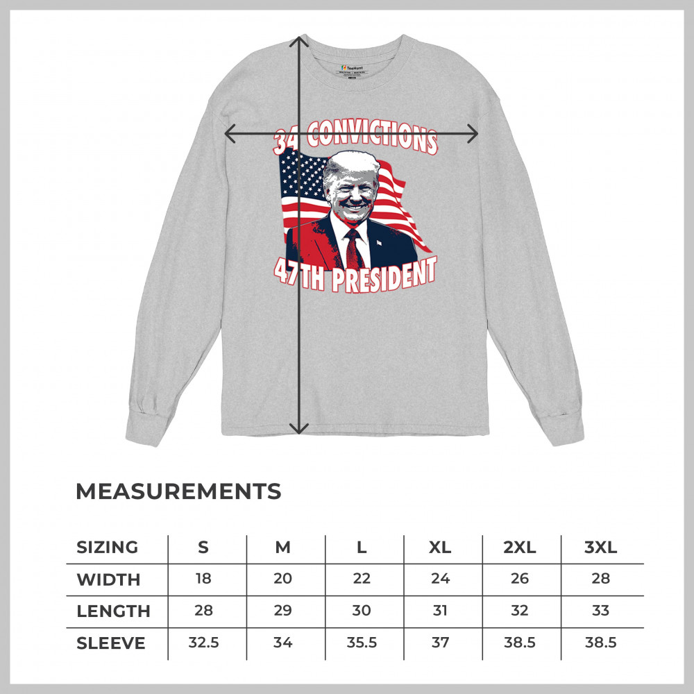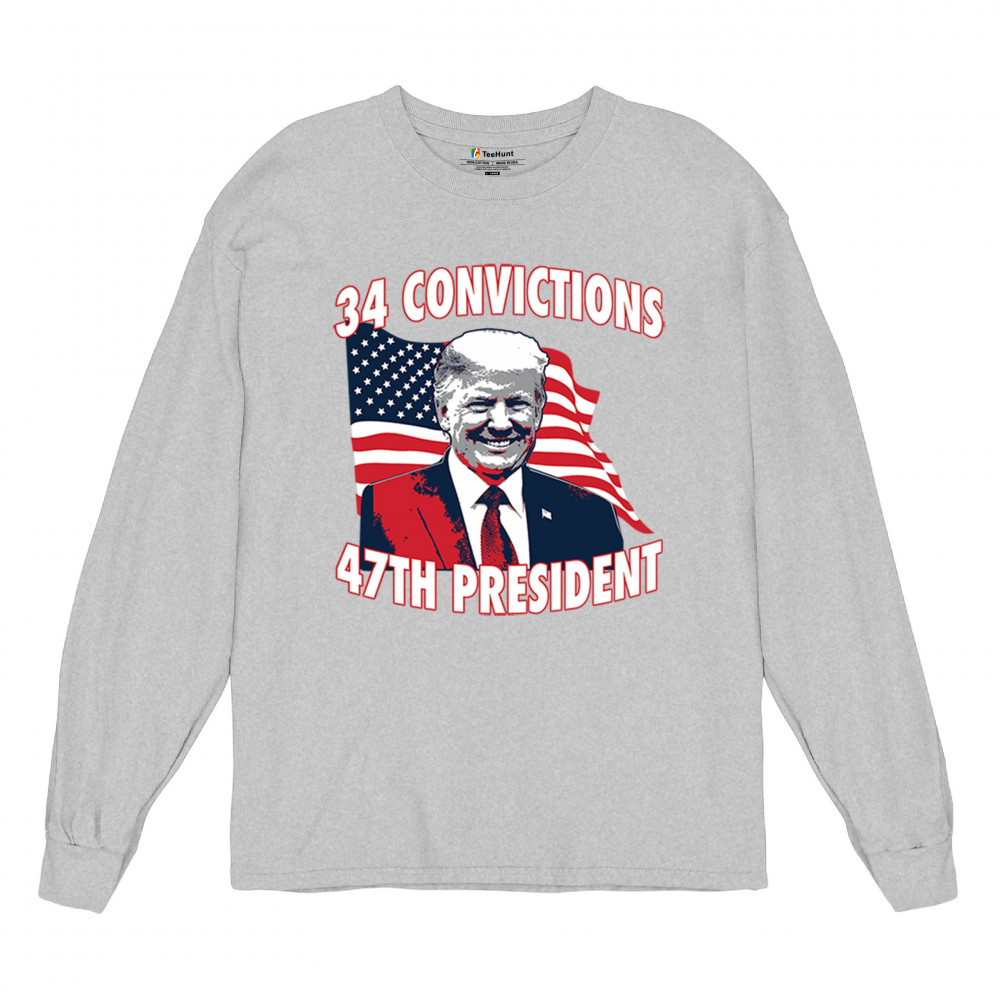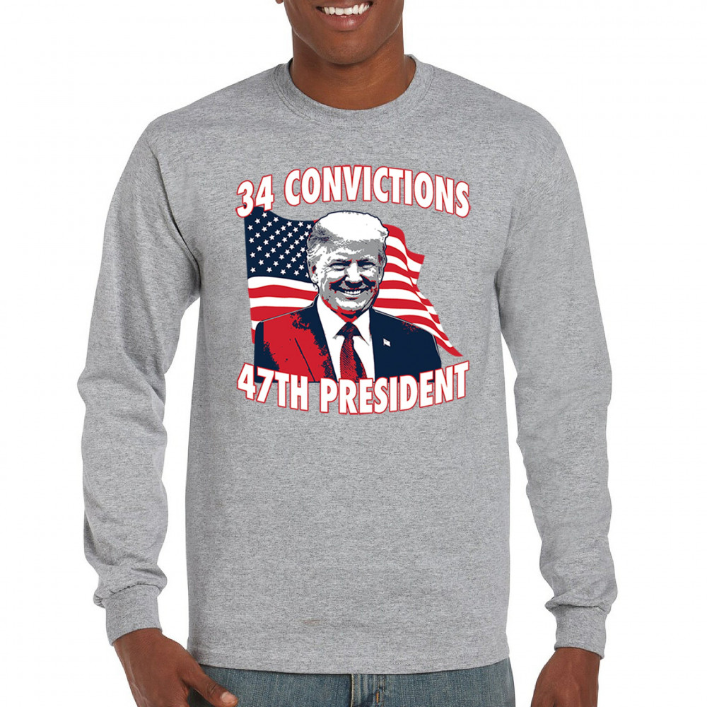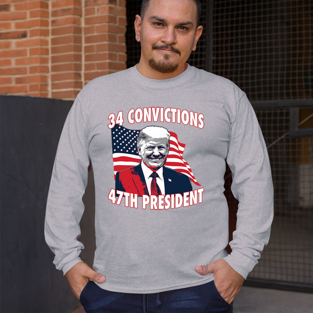 Show your support for Trump's 2024 campaign with the "34 Convictions, 47th President" design. Perfect for rallies, patriotic events, and conservative gatherings.