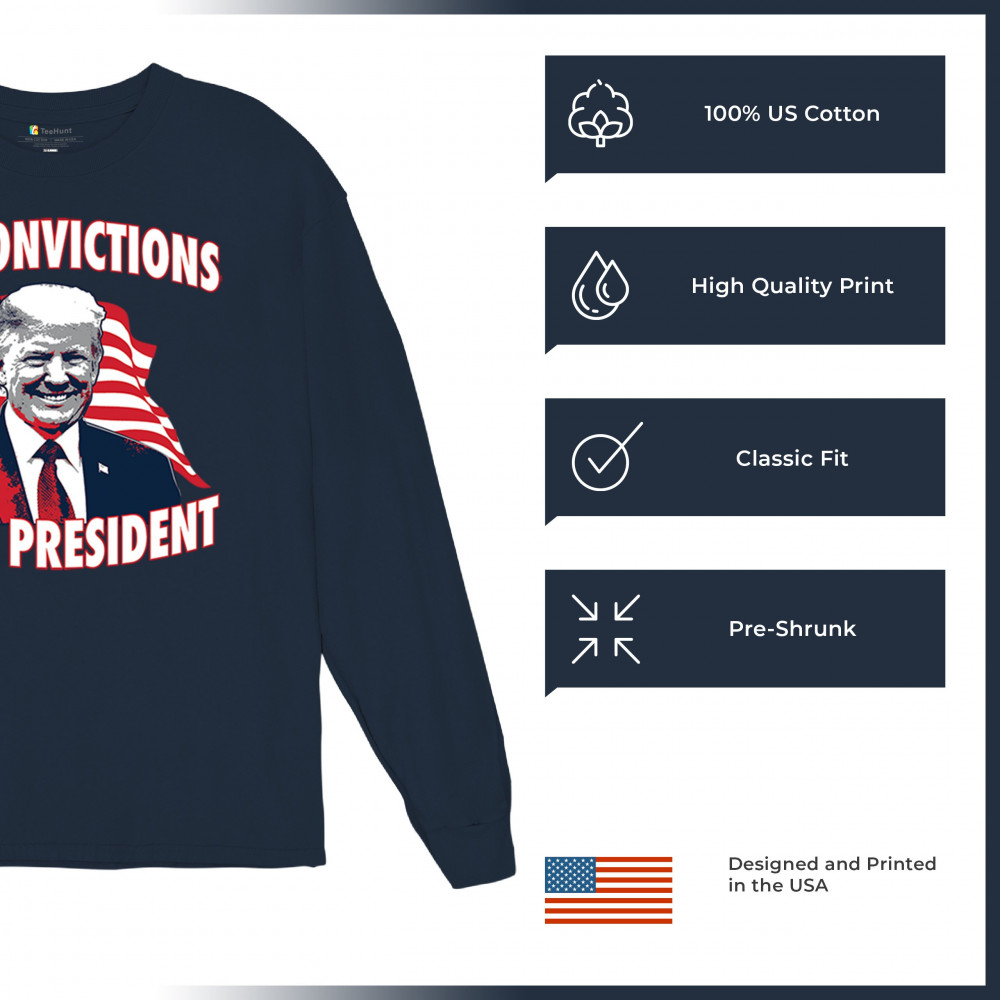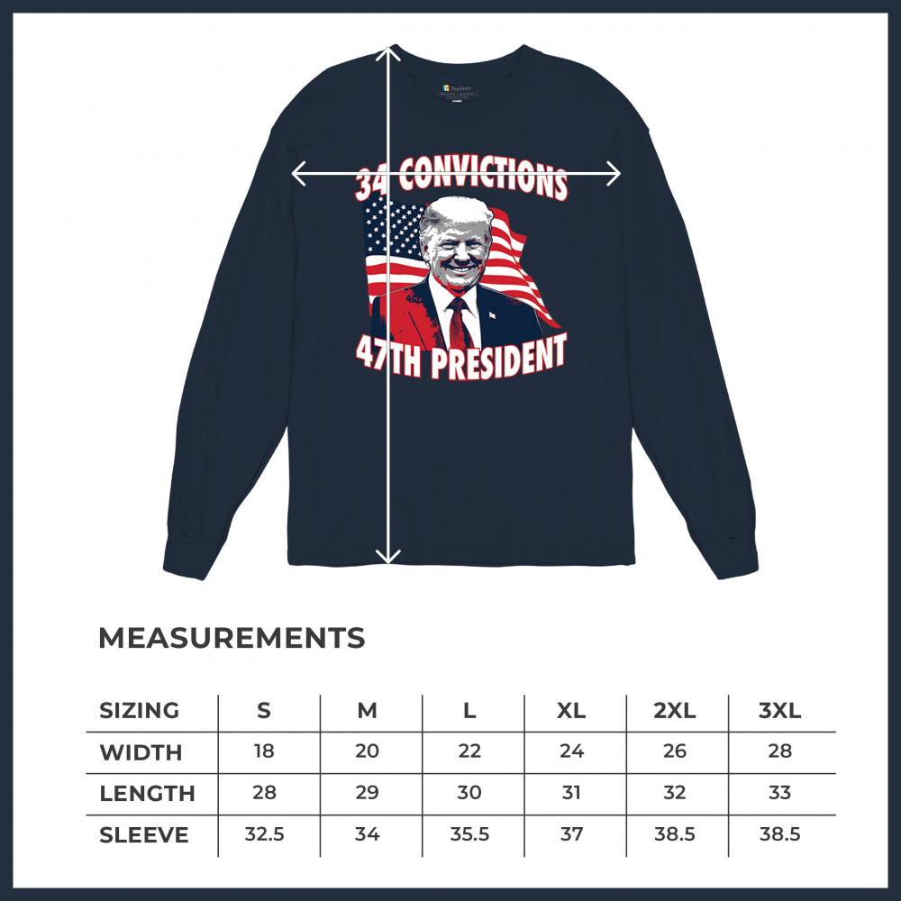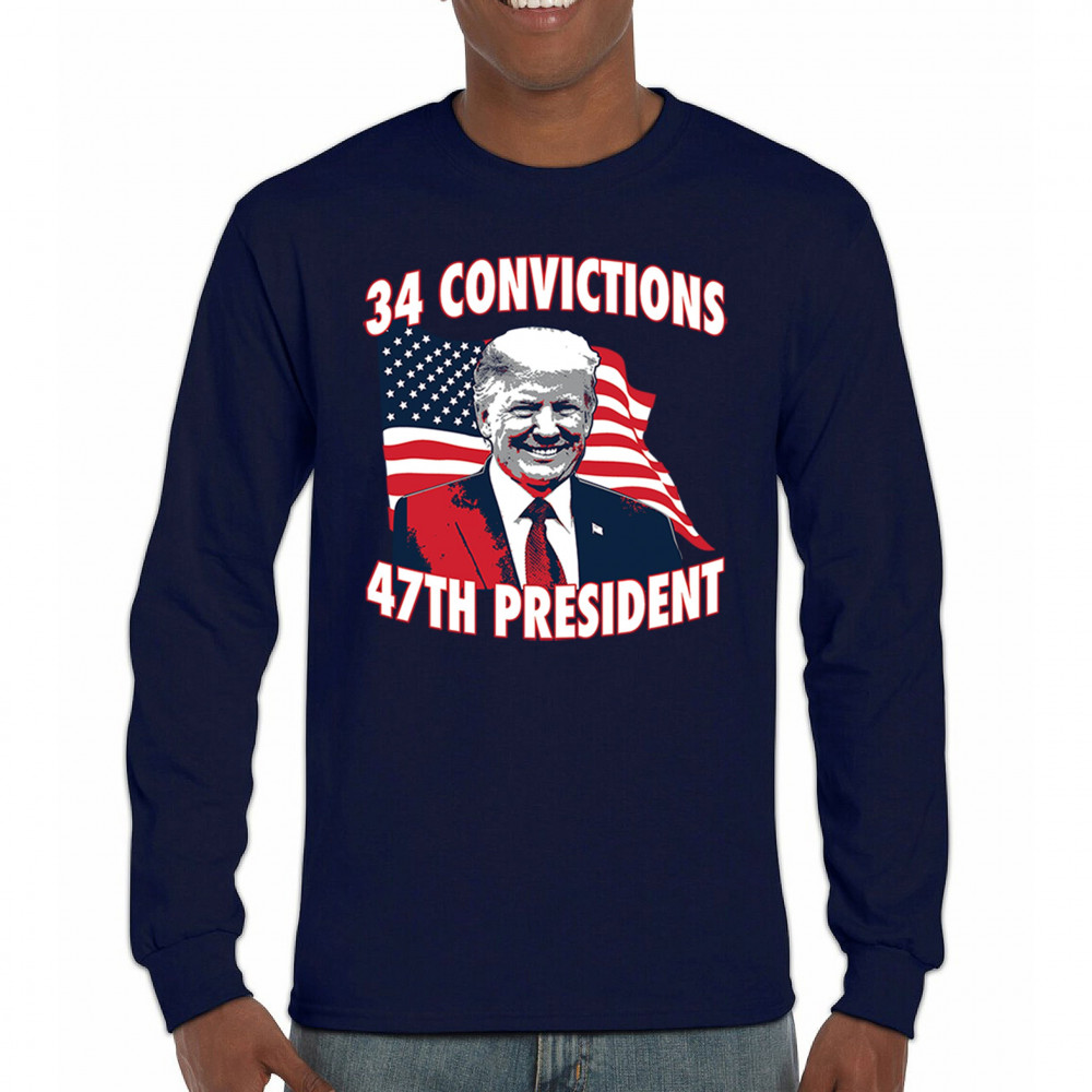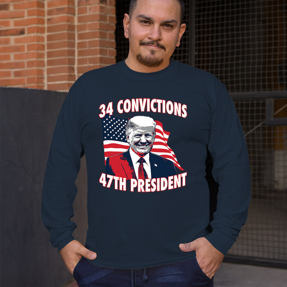 Show your support for Trump's 2024 campaign with the "34 Convictions, 47th President" design. Perfect for rallies, patriotic events, and conservative gatherings.