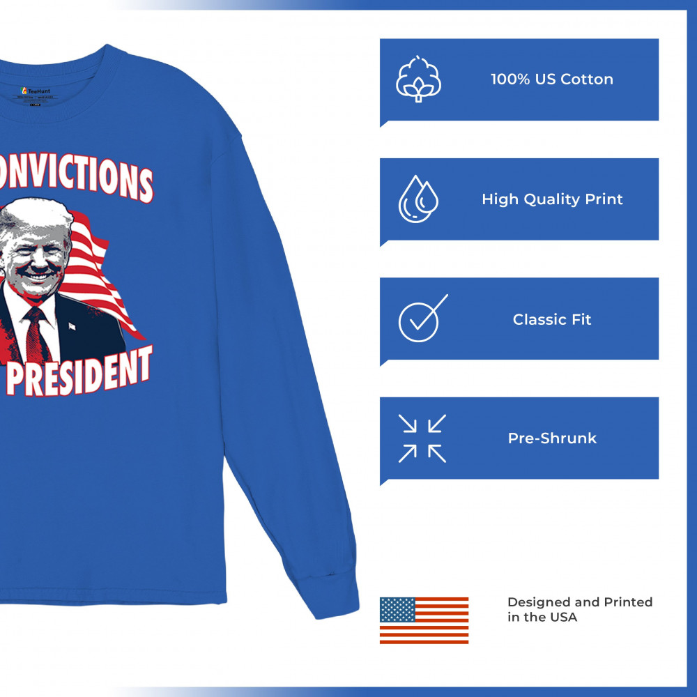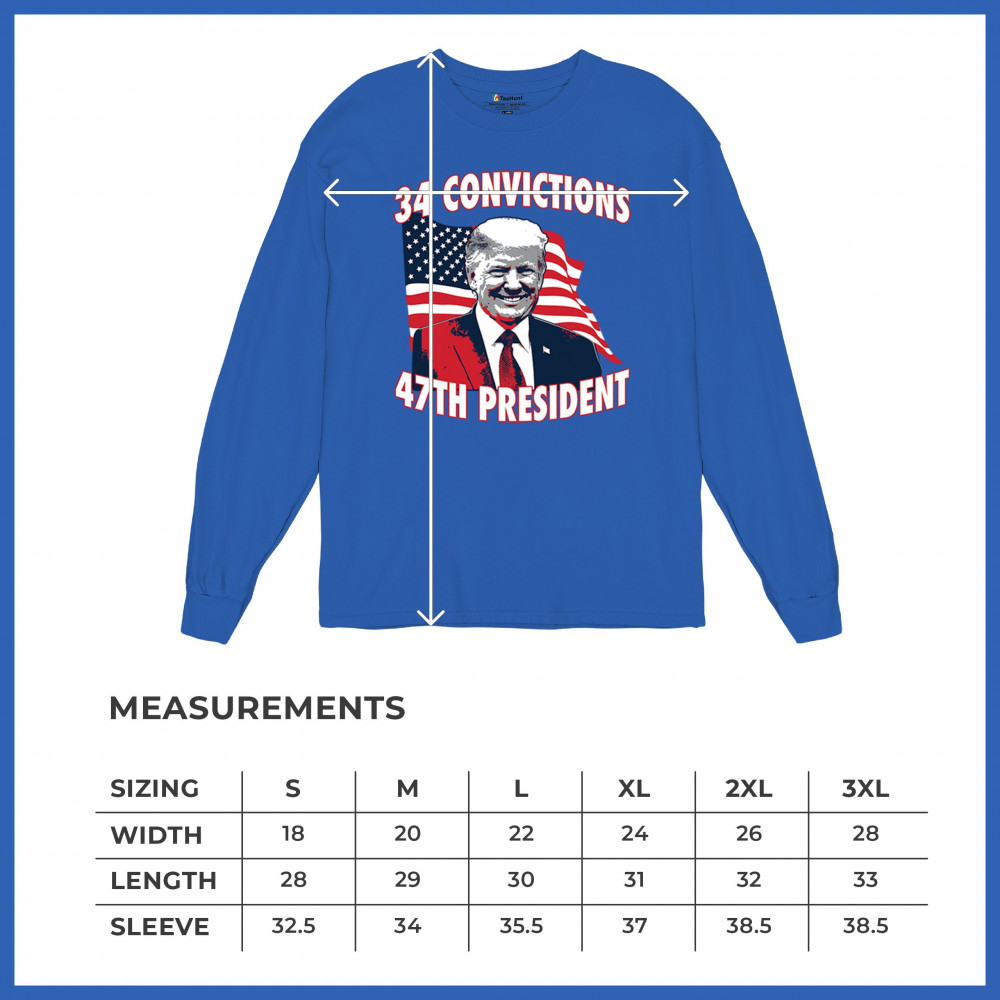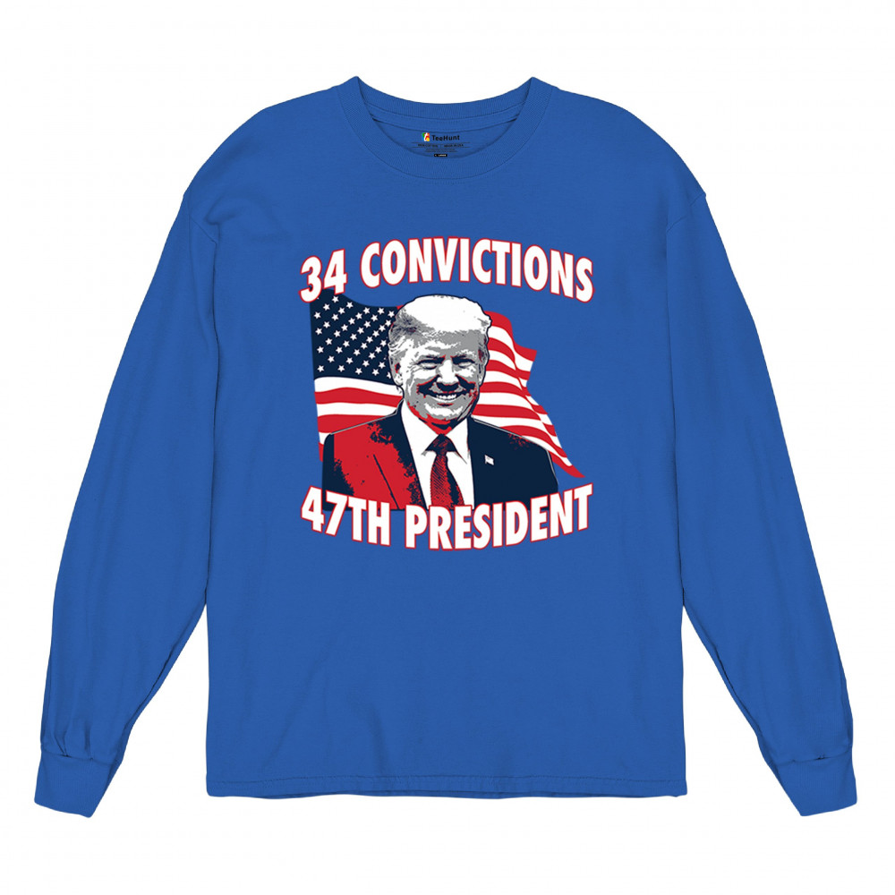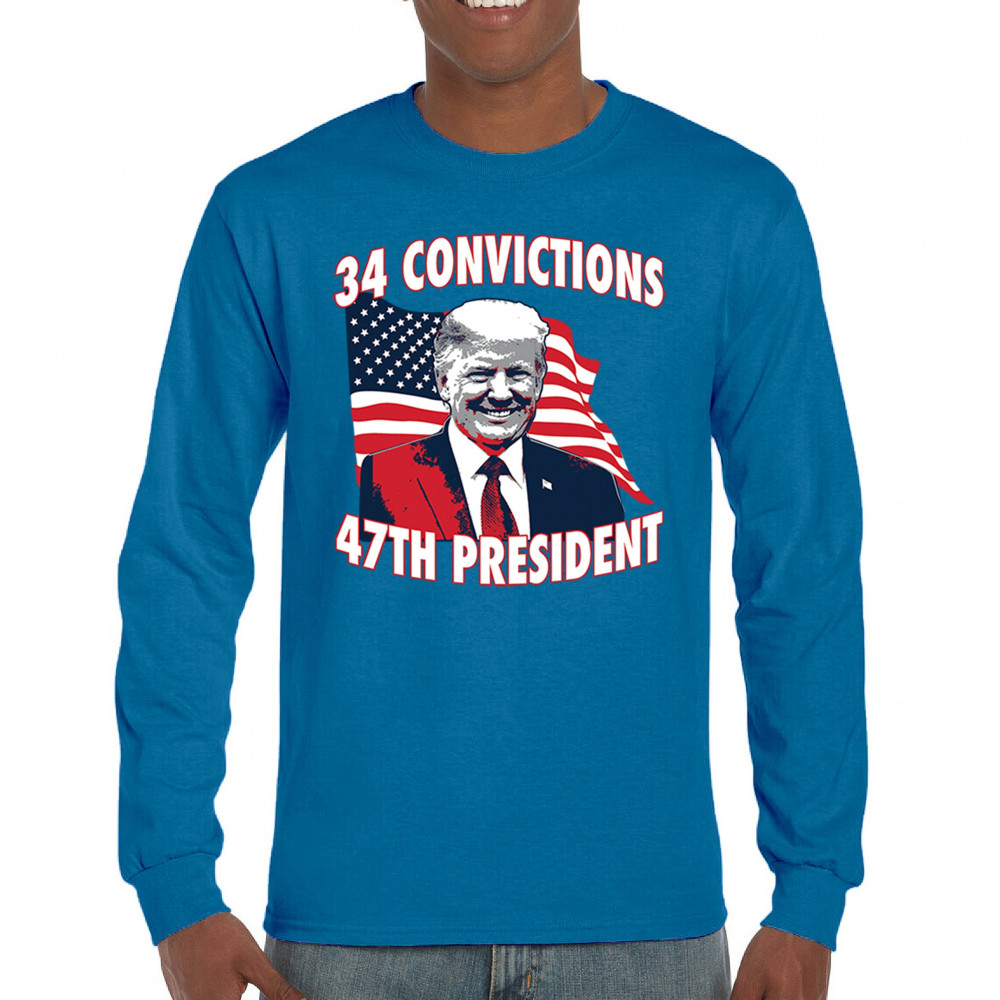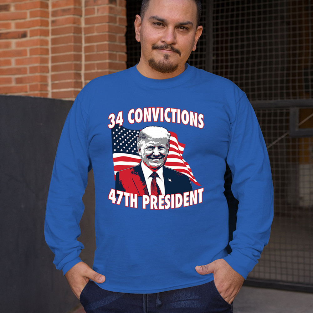 Show your support for Trump's 2024 campaign with the "34 Convictions, 47th President" design. Perfect for rallies, patriotic events, and conservative gatherings.