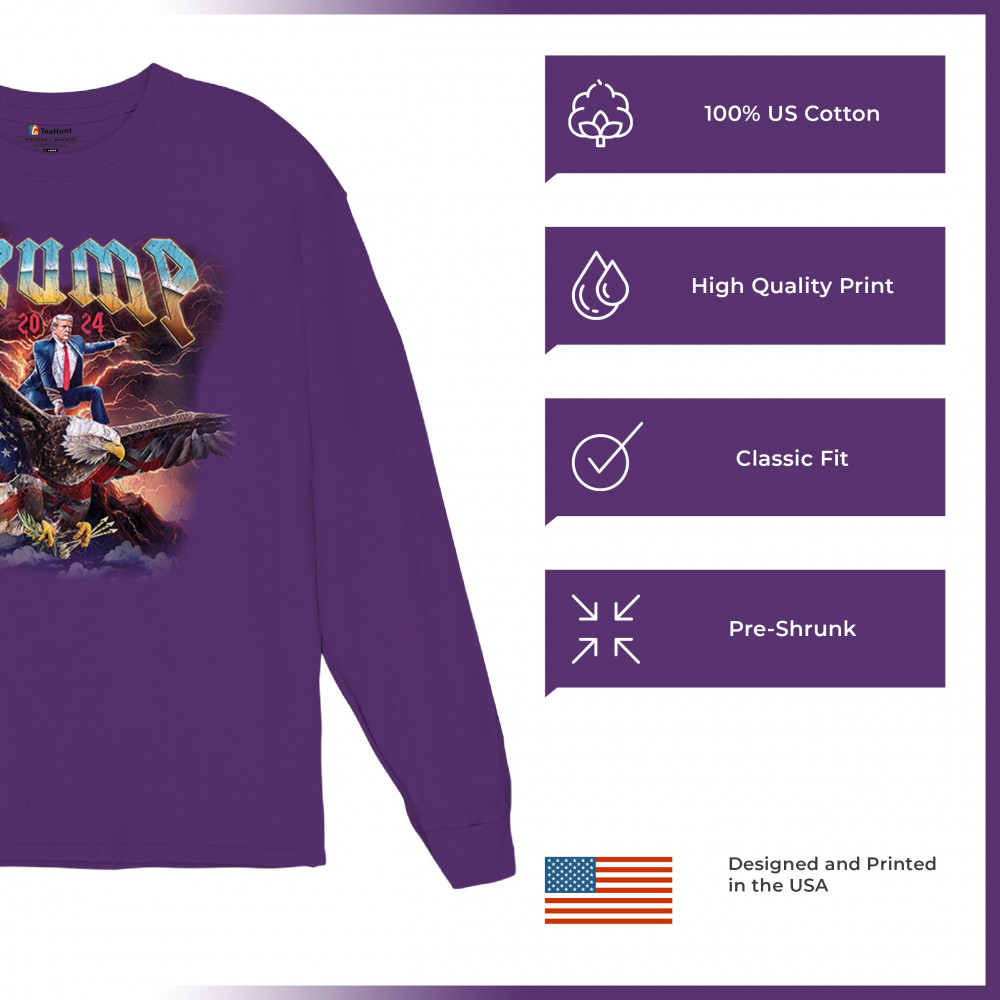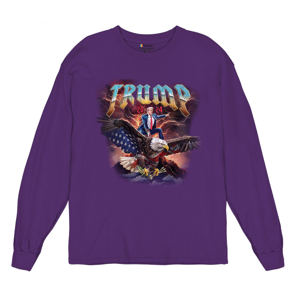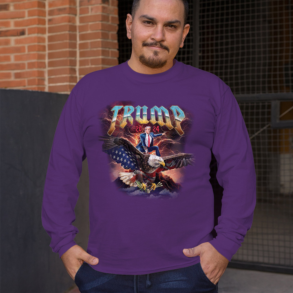 Stand out with our "Trump 2024" design featuring Trump riding an eagle. Perfect for rallies and patriotic events. Show your support with pride and confidence.