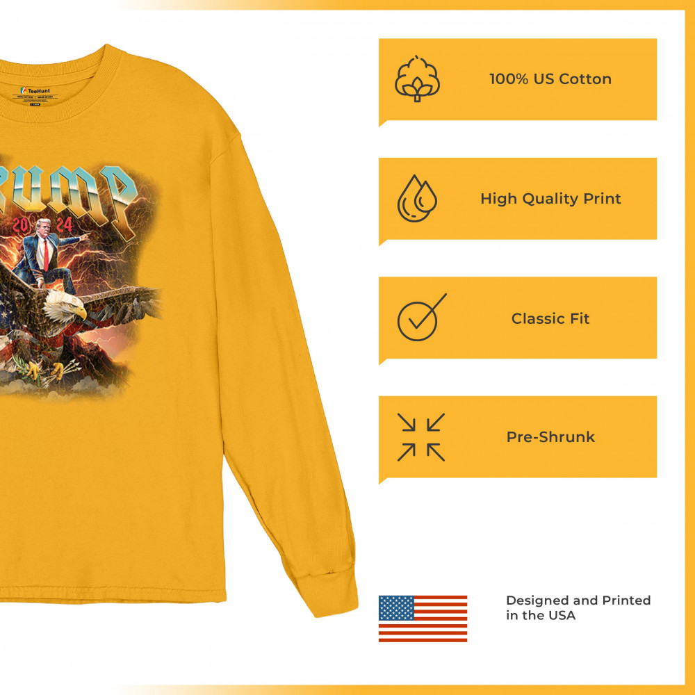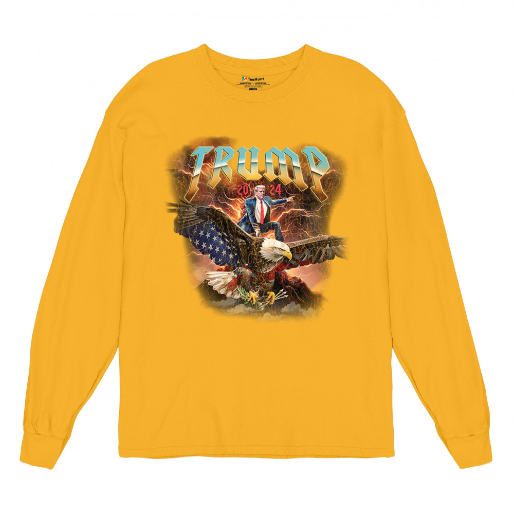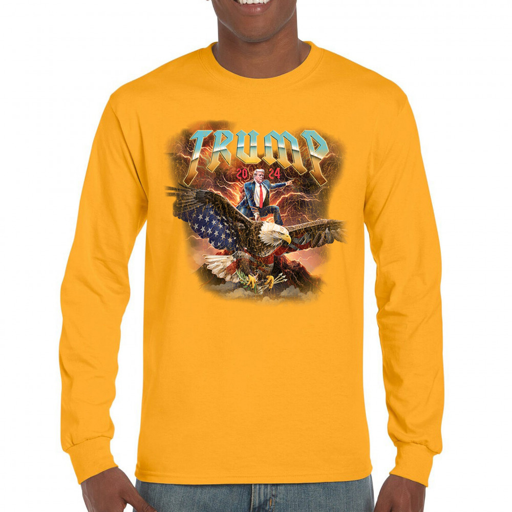 Stand out with our "Trump 2024" design featuring Trump riding an eagle. Perfect for rallies and patriotic events. Show your support with pride and confidence.