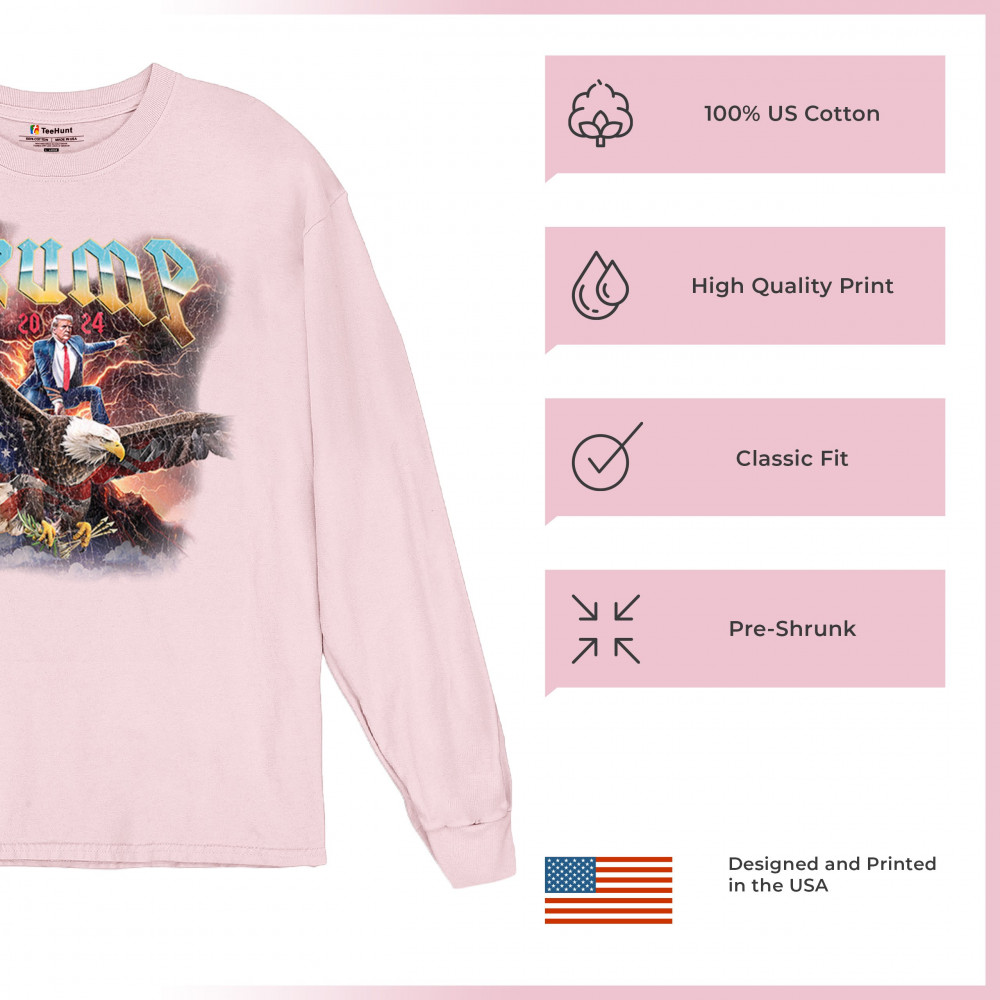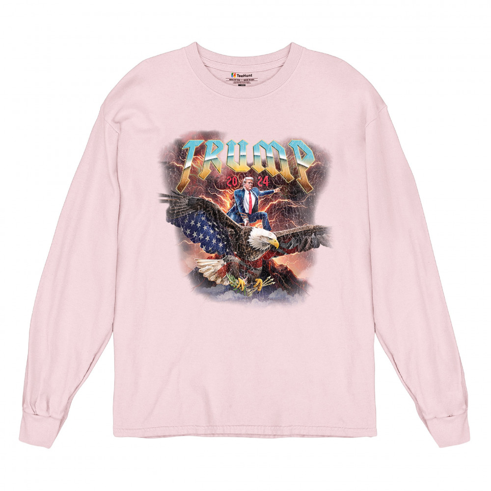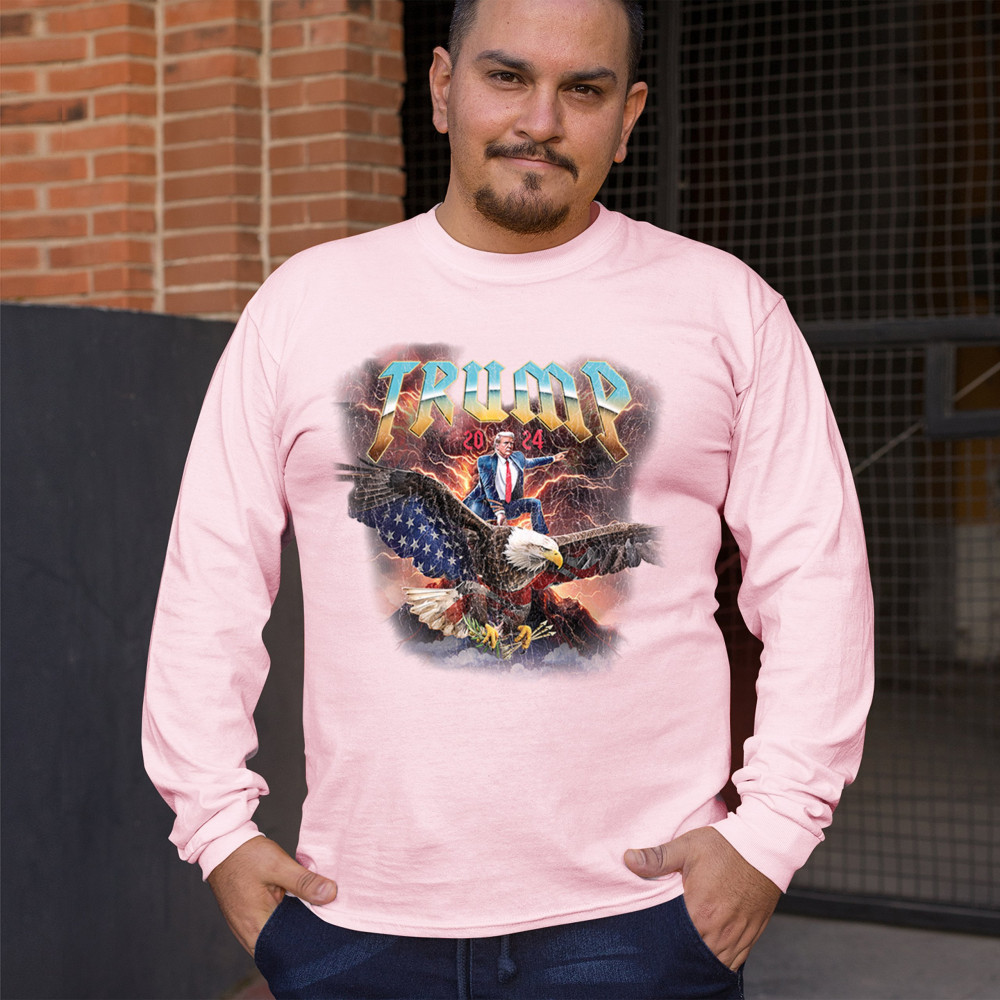 Stand out with our "Trump 2024" design featuring Trump riding an eagle. Perfect for rallies and patriotic events. Show your support with pride and confidence.