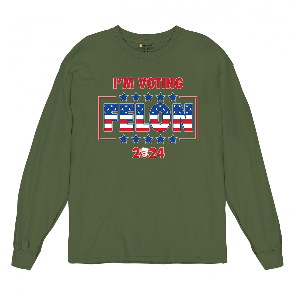 Show your support with the "I'm Voting Felon 2024" design, perfect for conservative patriots and Trump supporters. Featuring an American flag motif.