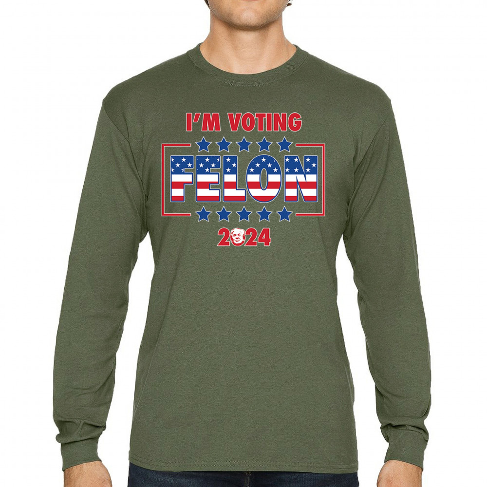 Stand out and express your political beliefs with our "I'm Voting Felon 2024" design. This bold and eye-catching design is perfect for conservative patriots and Trump supporters. Featuring a vibrant American flag motif, it’s ideal for rallies, political events, and daily wear. Show your commitment to America First and your defiance against opposition. This design is a perfect gift for like-minded friends and family who support the same values and are proud to show it.