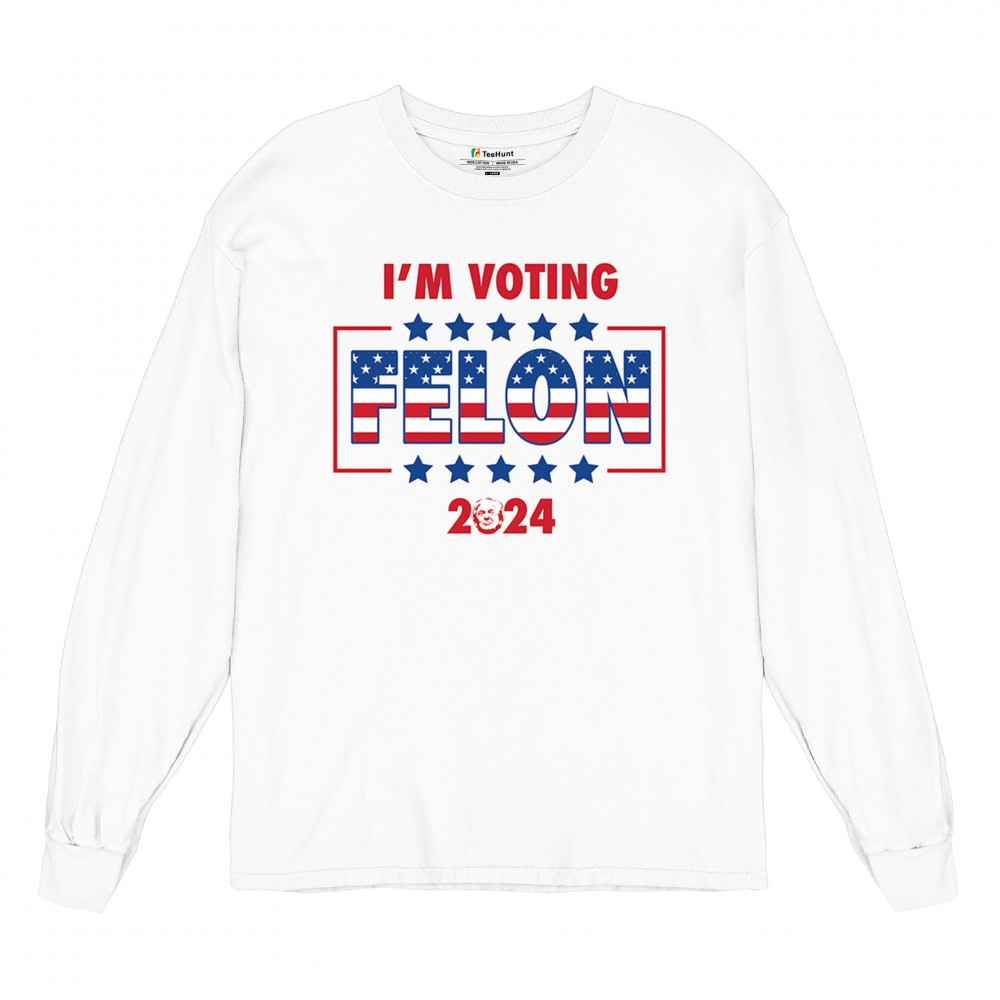 Show your support with the "I'm Voting Felon 2024" design, perfect for conservative patriots and Trump supporters. Featuring an American flag motif.