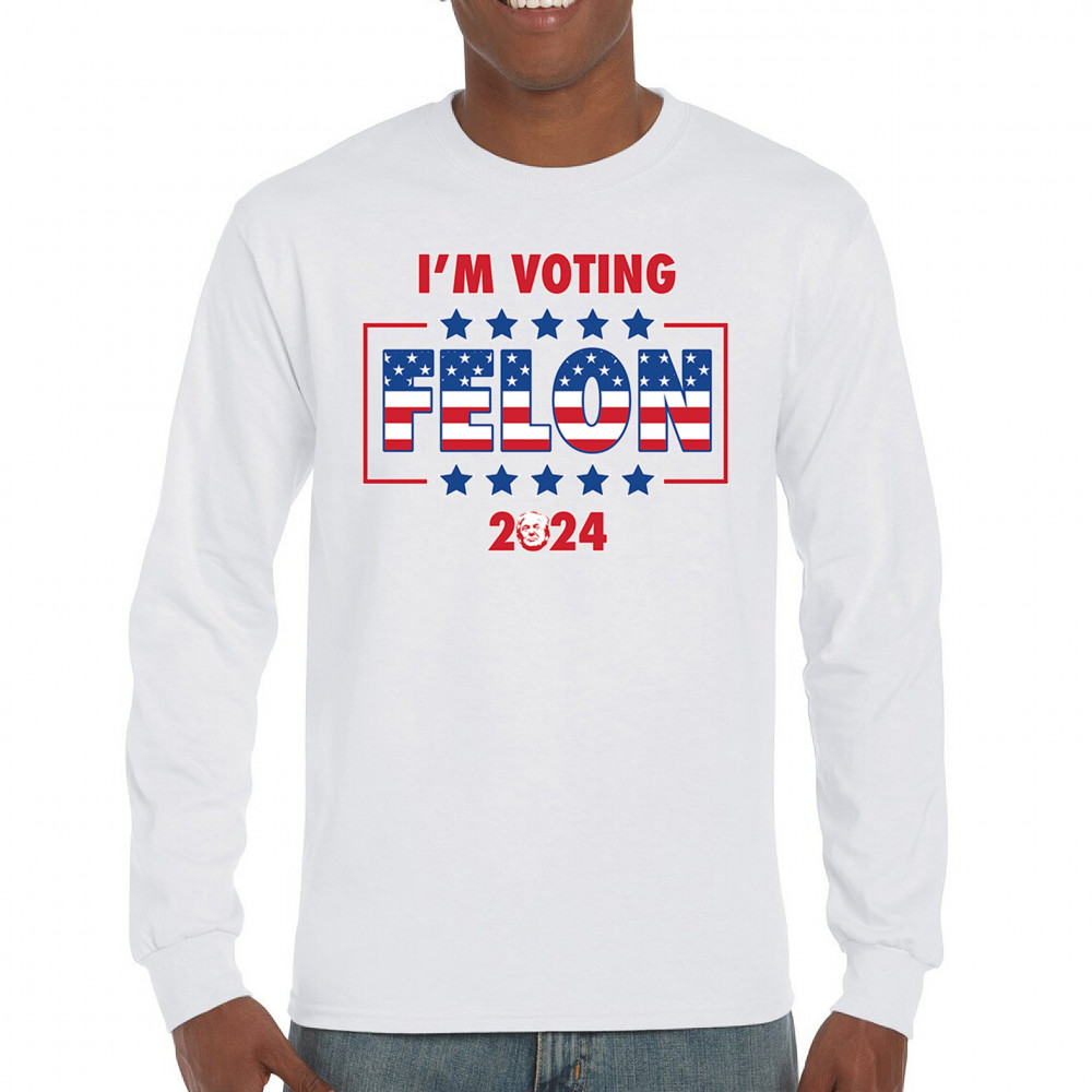 Stand out and express your political beliefs with our "I'm Voting Felon 2024" design. This bold and eye-catching design is perfect for conservative patriots and Trump supporters. Featuring a vibrant American flag motif, it’s ideal for rallies, political events, and daily wear. Show your commitment to America First and your defiance against opposition. This design is a perfect gift for like-minded friends and family who support the same values and are proud to show it.