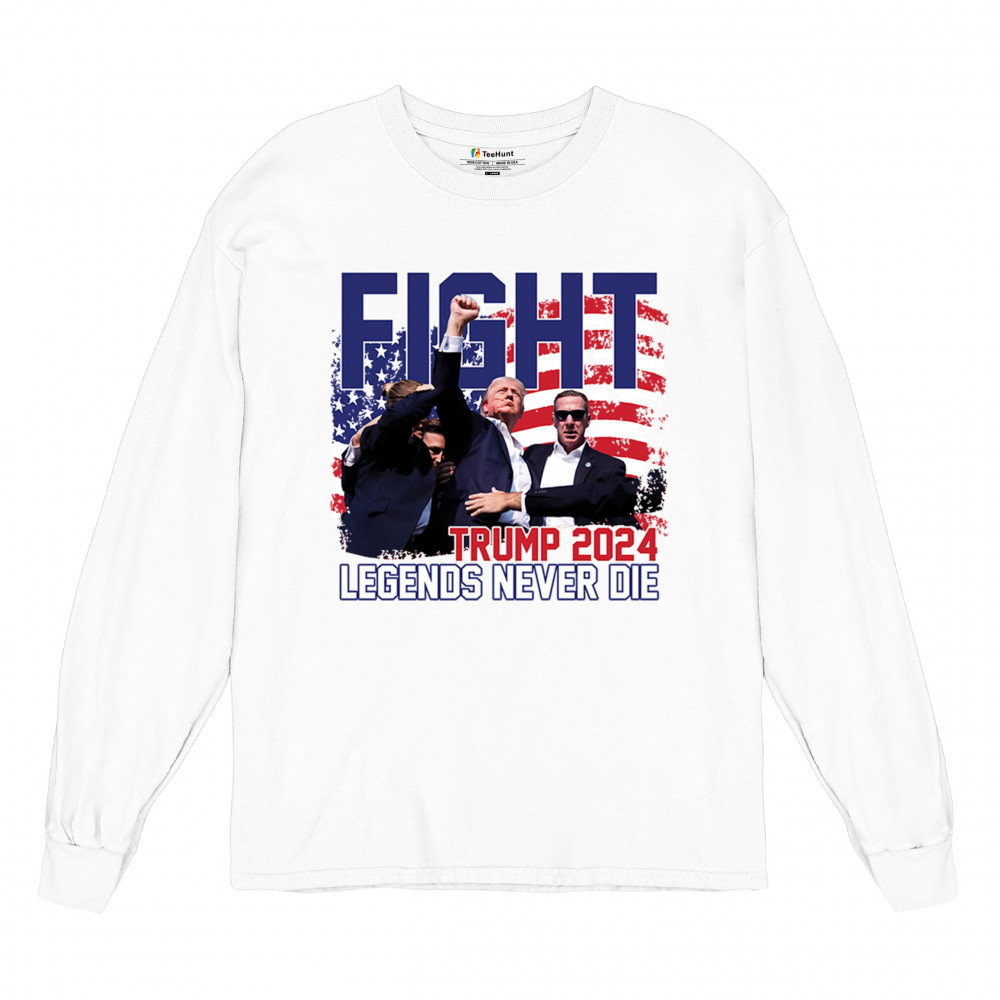 Show your Trump 2024 support with our bold "Fight" design, featuring "Legends Never Die" and a patriotic American flag. Perfect for rallies and everyday wear.