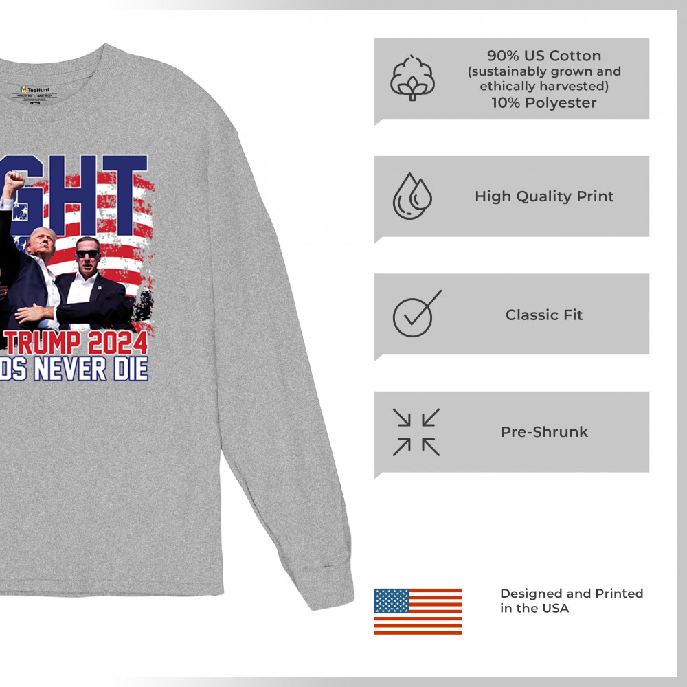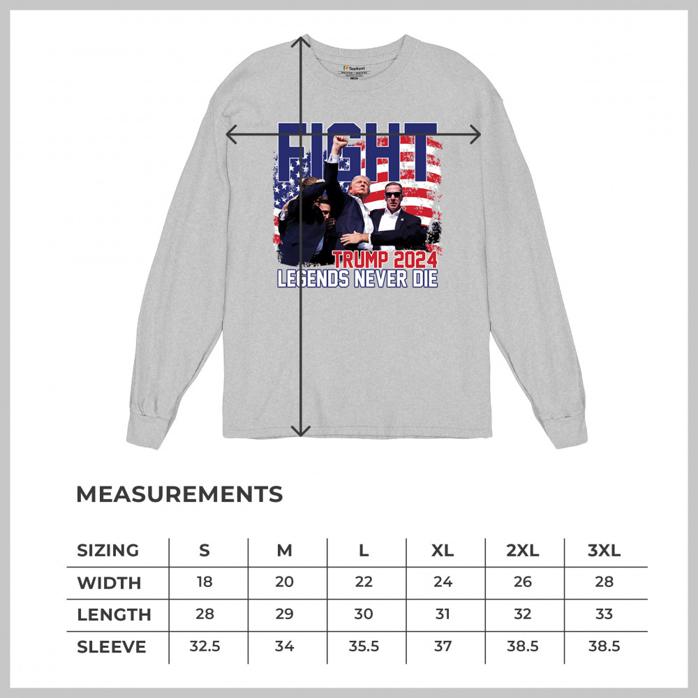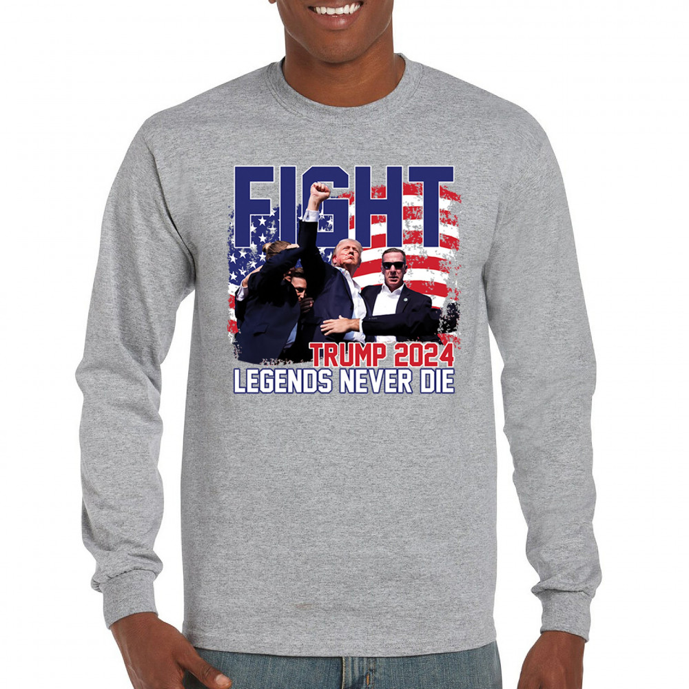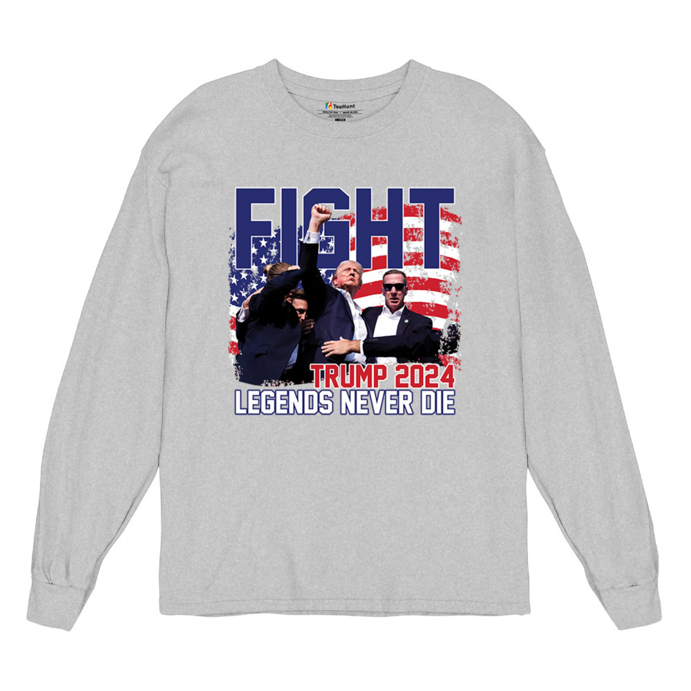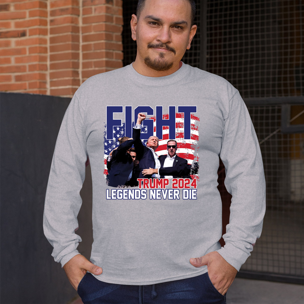 Show your Trump 2024 support with our bold "Fight" design, featuring "Legends Never Die" and a patriotic American flag. Perfect for rallies and everyday wear.