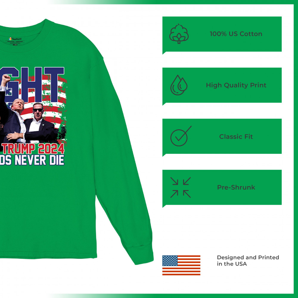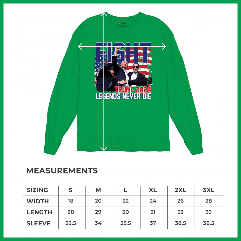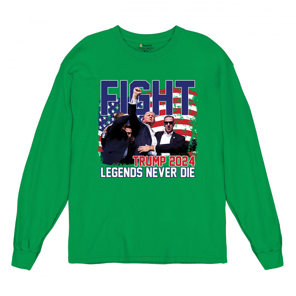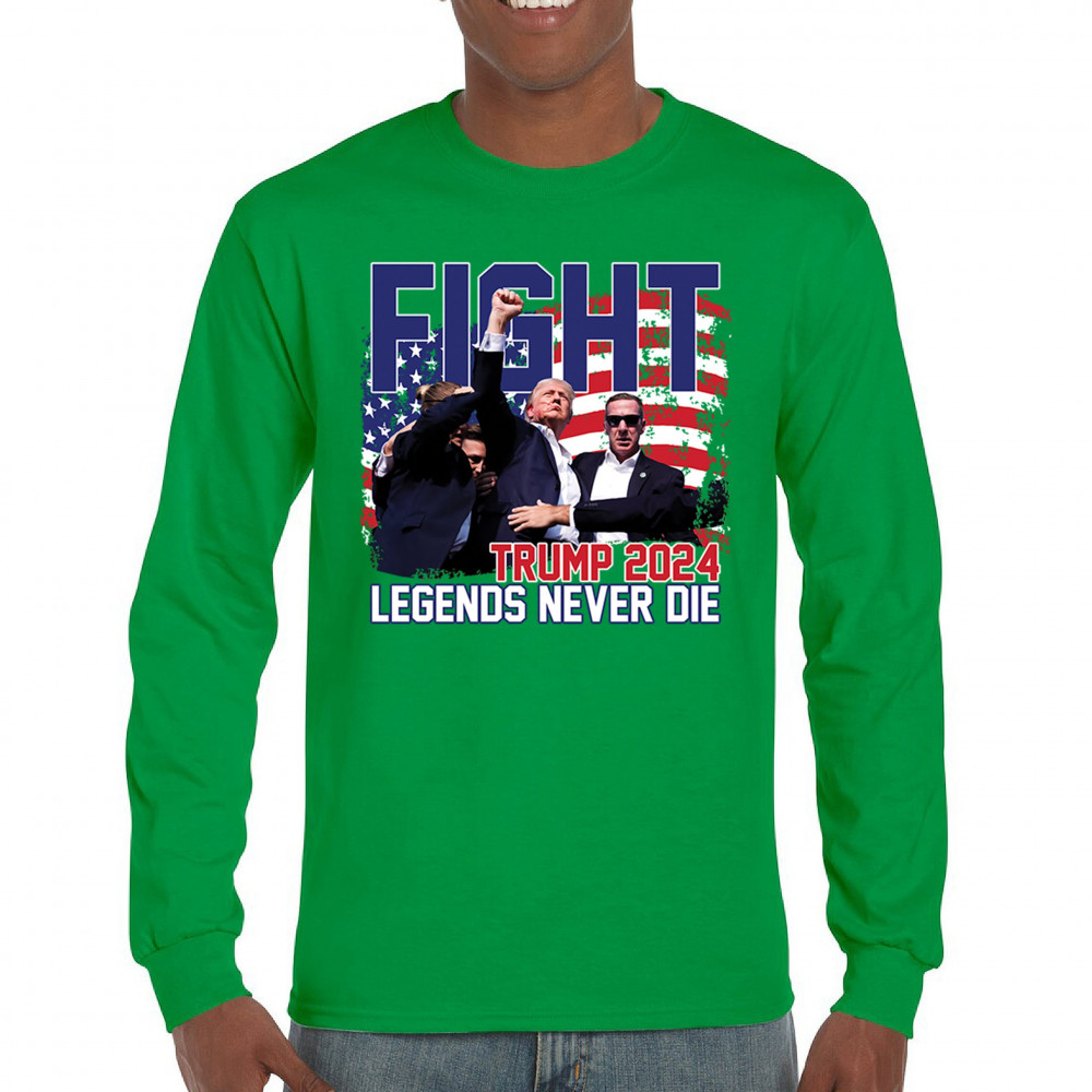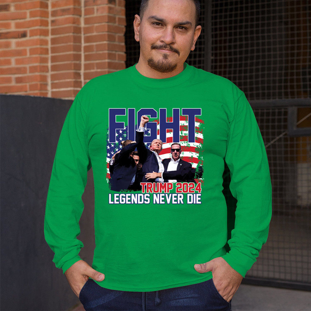 Show your Trump 2024 support with our bold "Fight" design, featuring "Legends Never Die" and a patriotic American flag. Perfect for rallies and everyday wear.