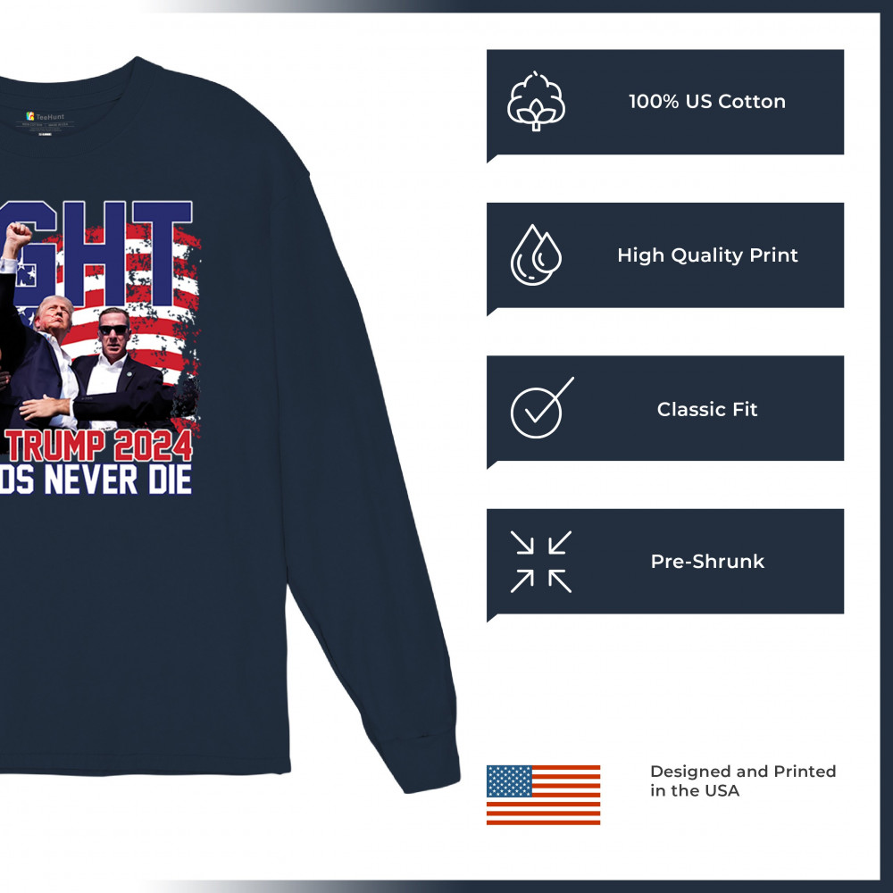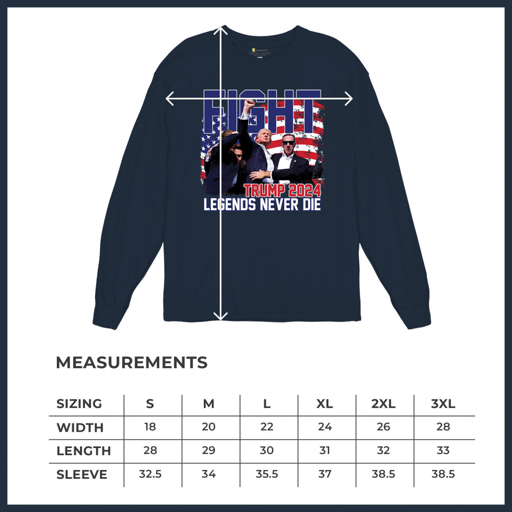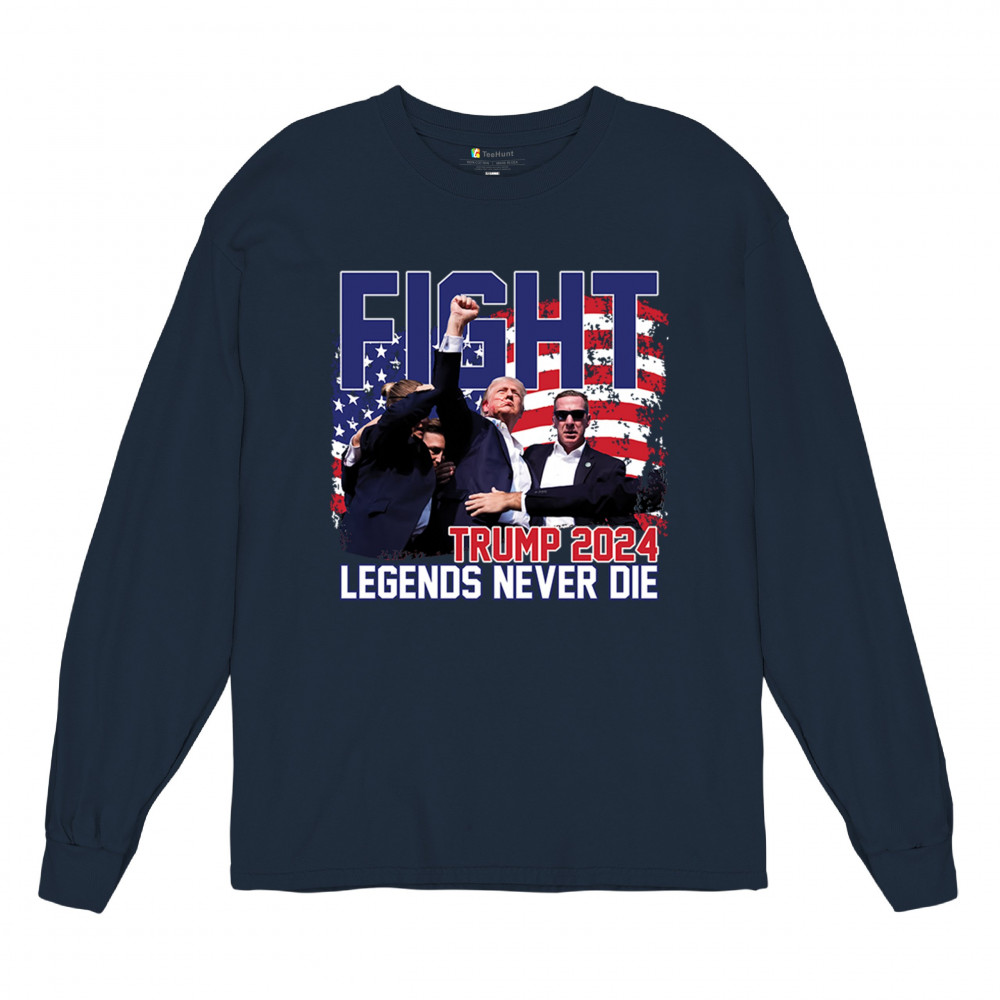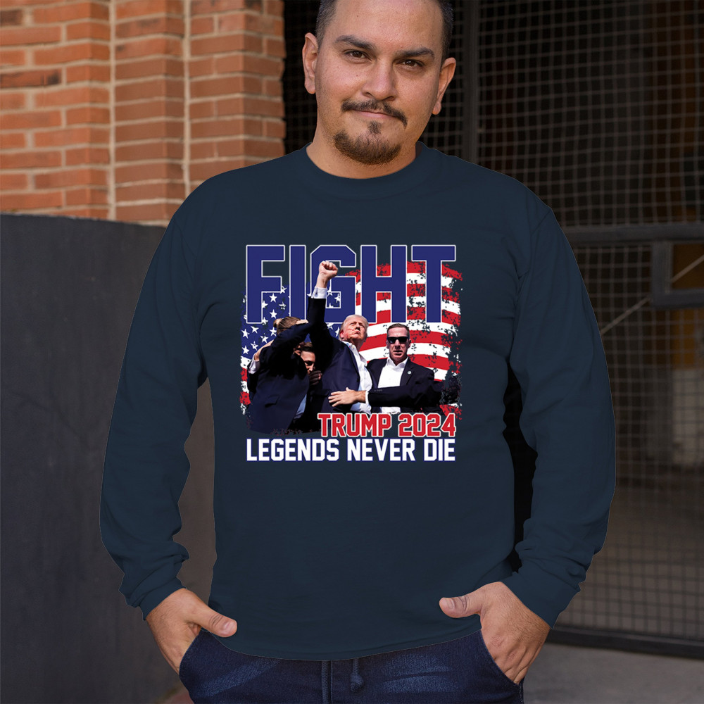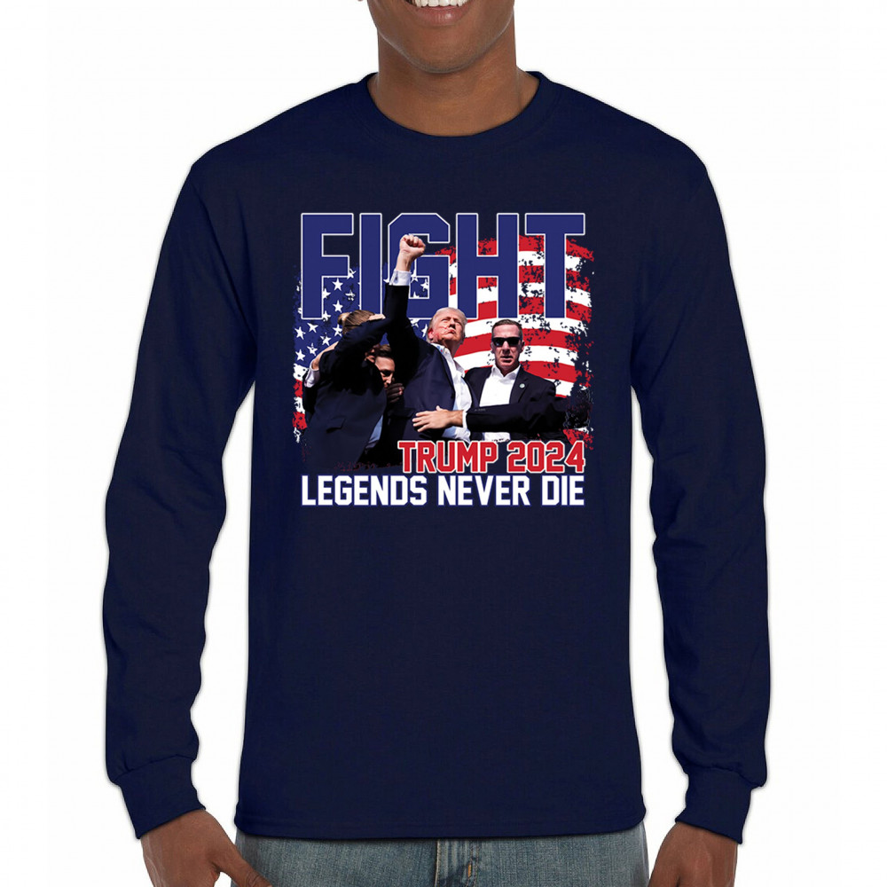Show your Trump 2024 support with our bold "Fight" design, featuring "Legends Never Die" and a patriotic American flag. Perfect for rallies and everyday wear.