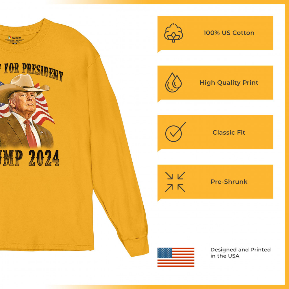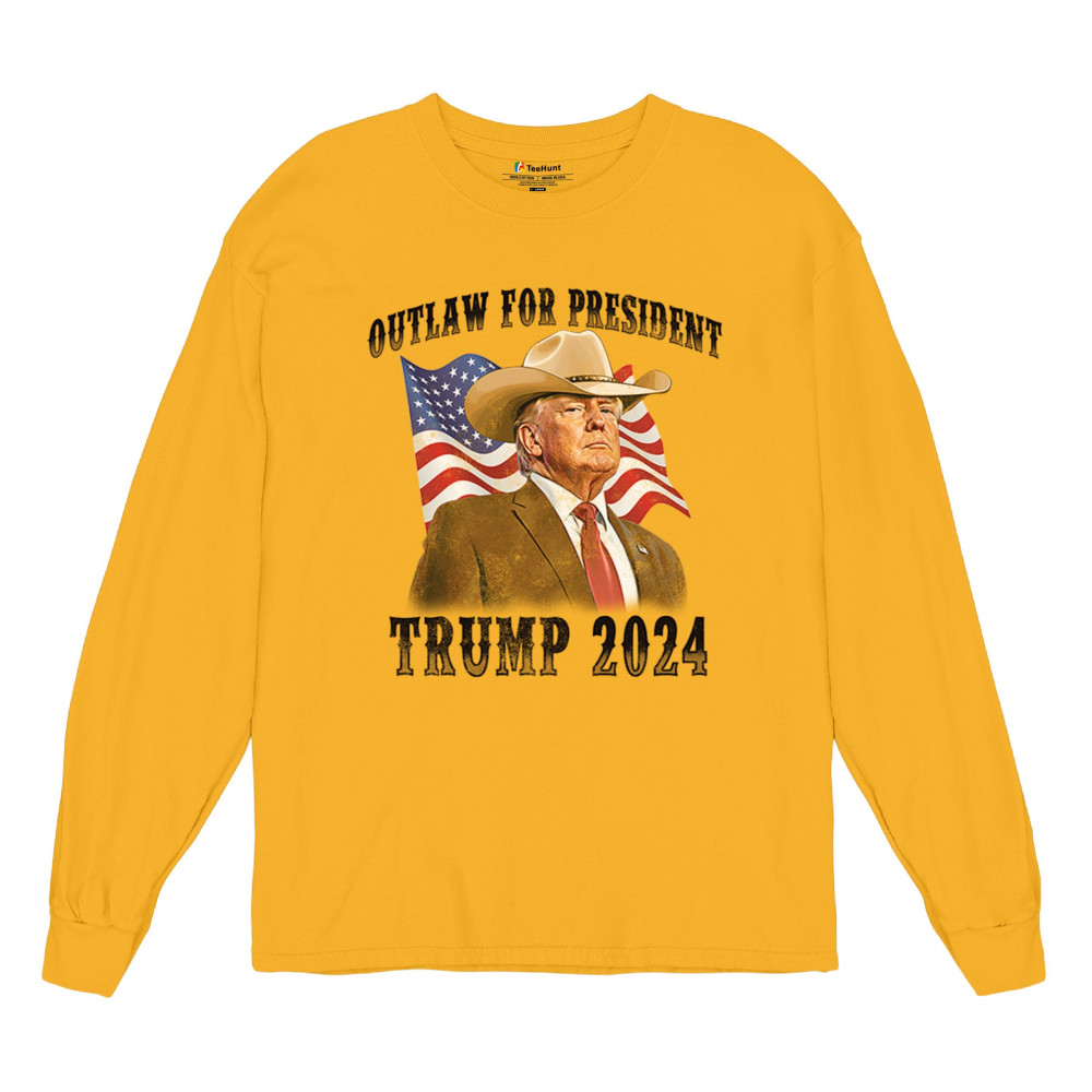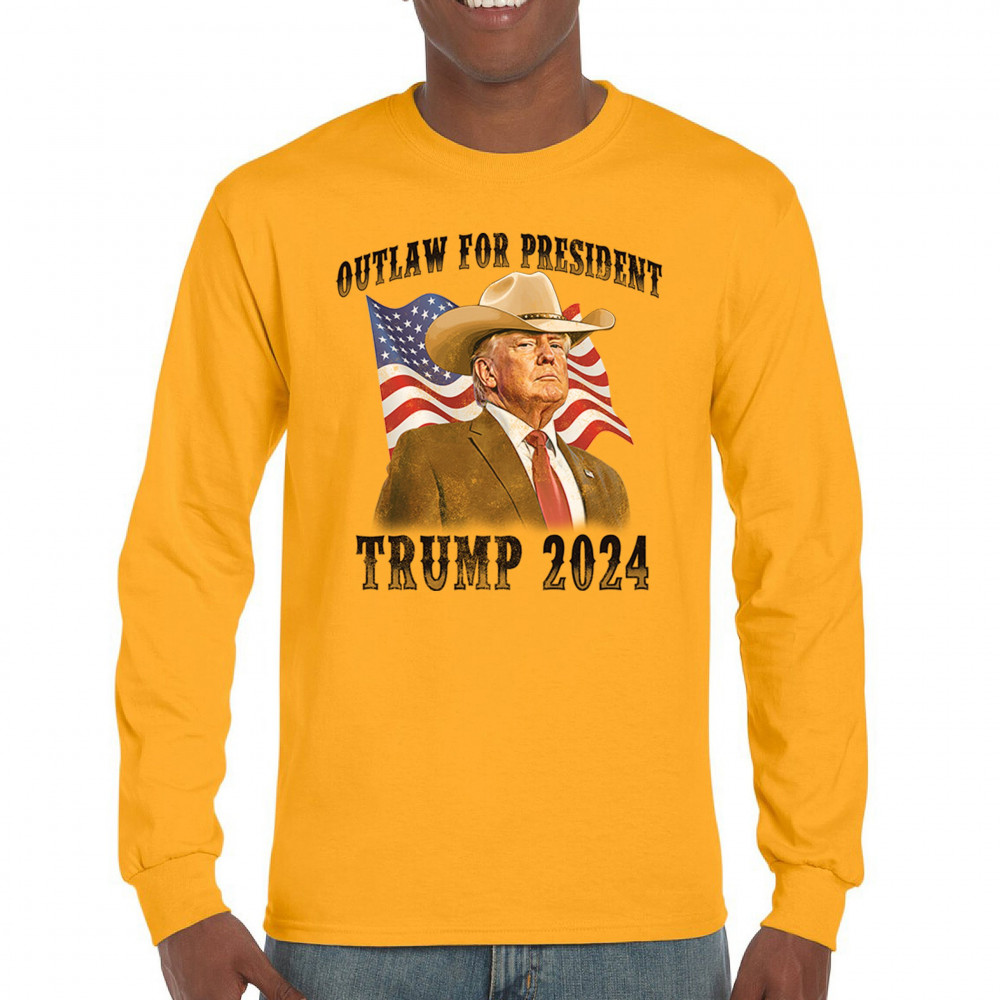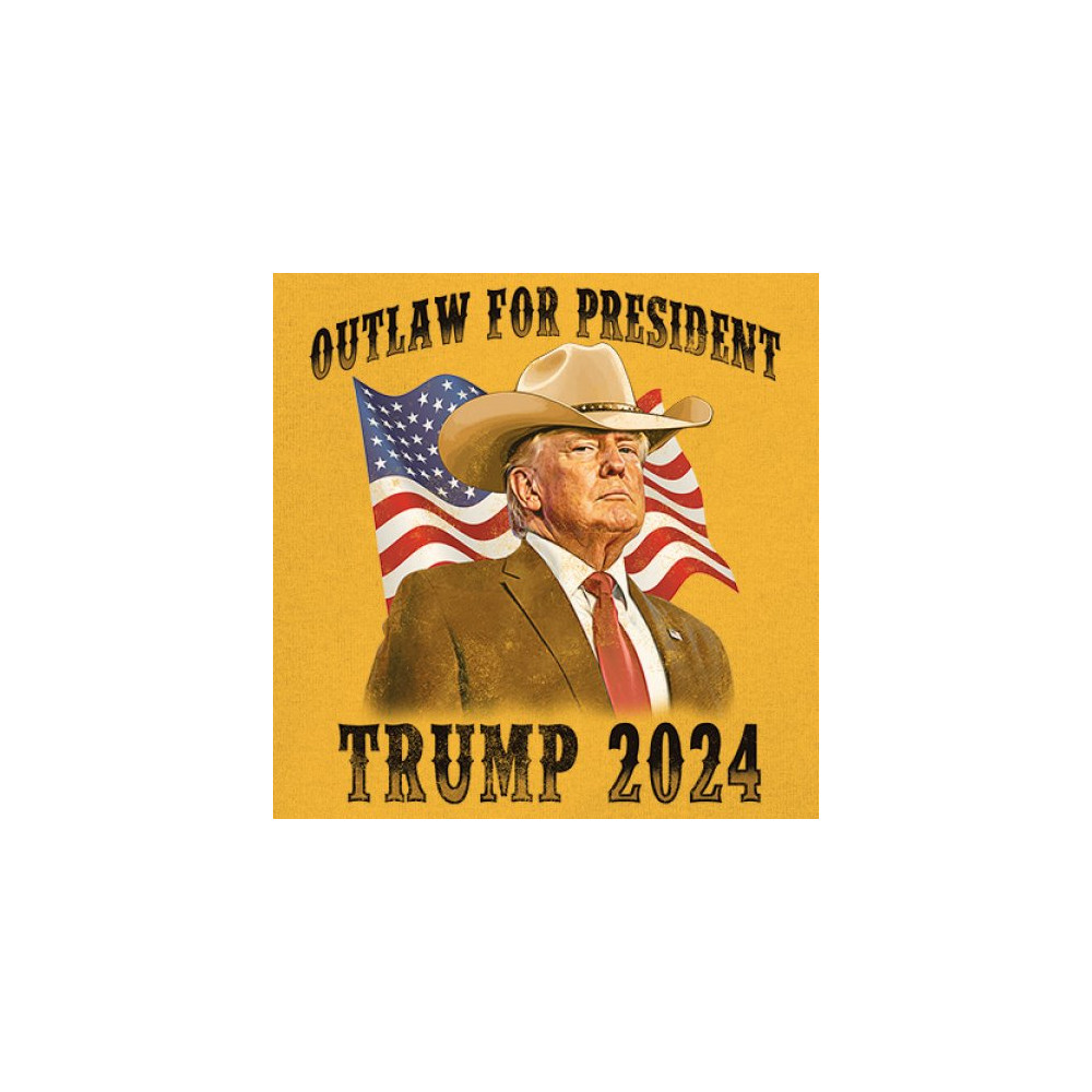 Support Trump with our "Outlaw for President" design. Featuring Trump in a cowboy hat, this piece symbolizes strength amidst political challenges. Join the fight for conservative values!