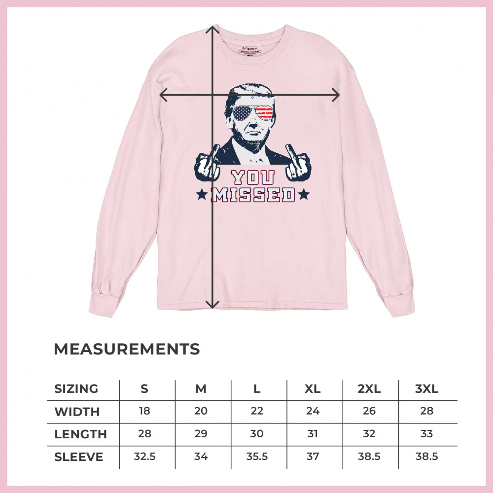 Express your patriotism and support for Donald Trump with this striking "You Missed" design, commemorating his survival of an assassination attempt during a Pennsylvania rally. The design features Trump in American flag sunglasses, defiantly flipping the bird, a bold statement of resilience. Ideal for rallies, political events, or casual wear, it symbolizes strength and unwavering support for conservative values. Show the world where you stand with this unique piece, perfect for any Trump supporter who believes in the America First agenda.
