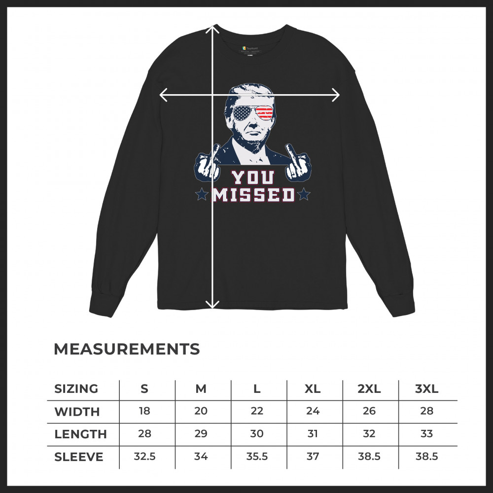 Express your patriotism and support for Donald Trump with this striking "You Missed" design, commemorating his survival of an assassination attempt during a Pennsylvania rally. The design features Trump in American flag sunglasses, defiantly flipping the bird, a bold statement of resilience. Ideal for rallies, political events, or casual wear, it symbolizes strength and unwavering support for conservative values. Show the world where you stand with this unique piece, perfect for any Trump supporter who believes in the America First agenda.