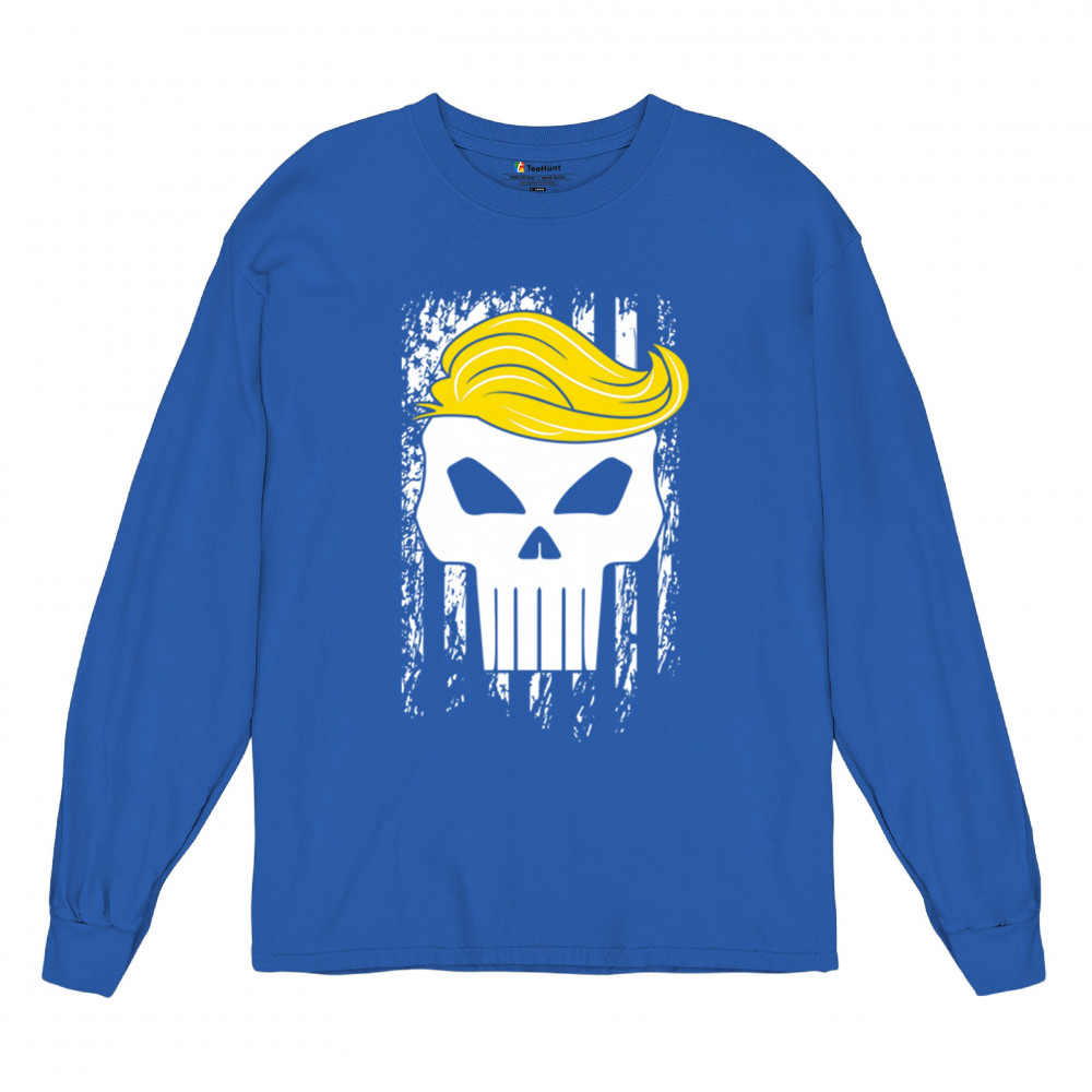 Explore our exclusive design - a symbol of unwavering support for America. Featuring a distressed flag and a skull with Trump's hair, it's perfect for patriotic conservatives