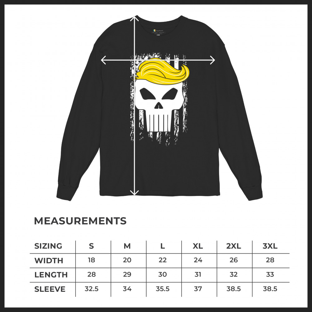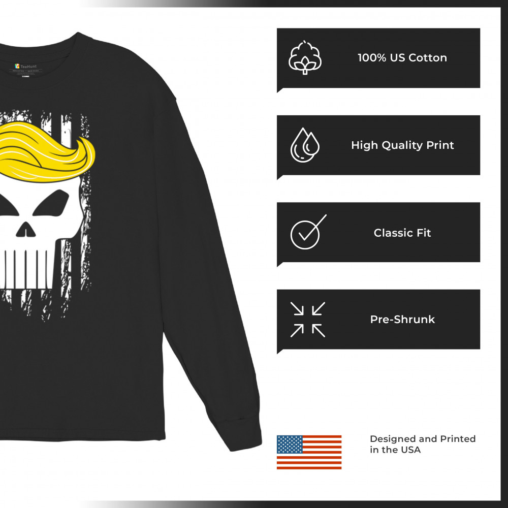 Explore our exclusive design - a symbol of unwavering support for America. Featuring a distressed flag and a skull with Trump's hair, it's perfect for patriotic conservatives
