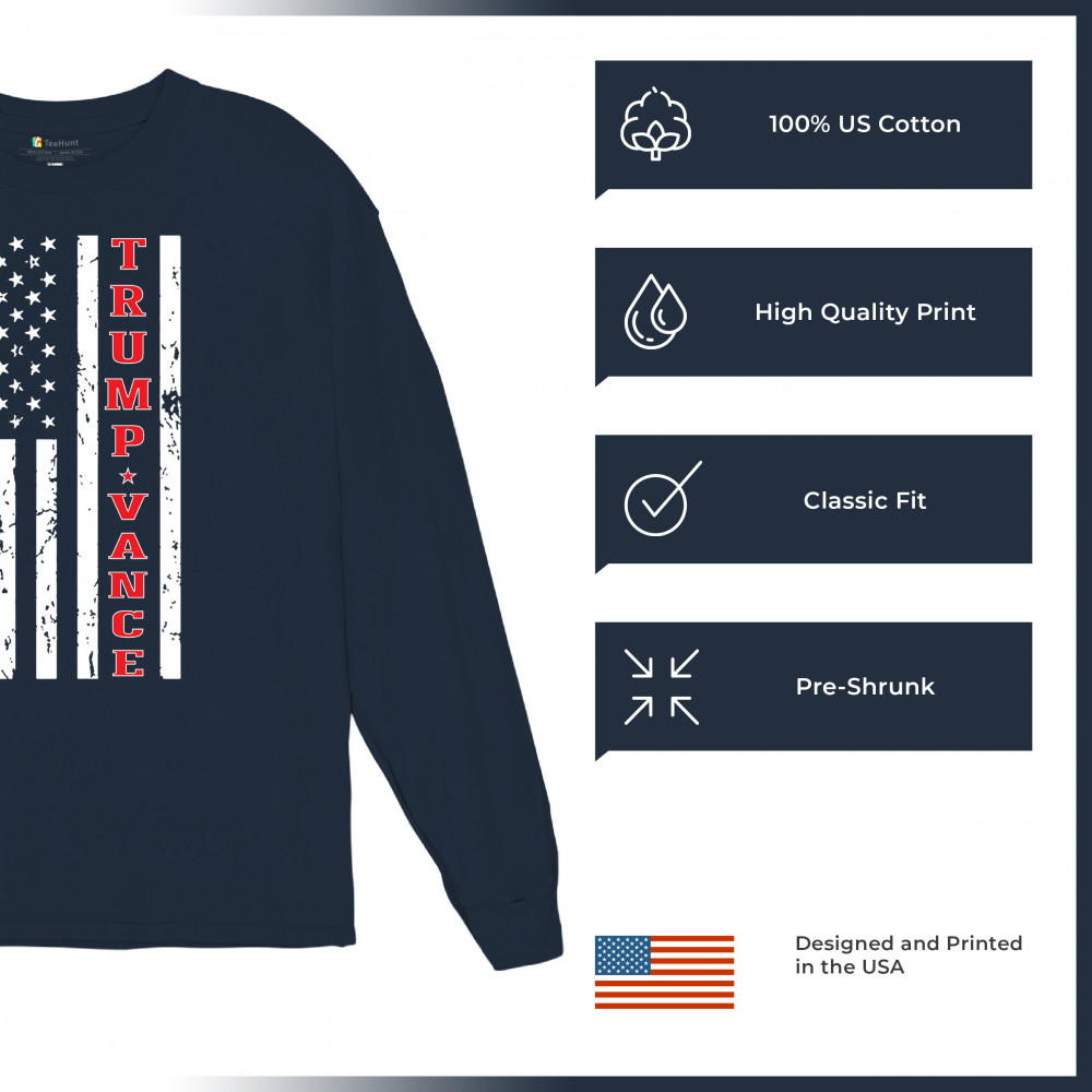 Show your support for Trump Vance 2024 with a bold, rustic American flag design. Perfect for rallies and daily wear. Patriotic and durable.