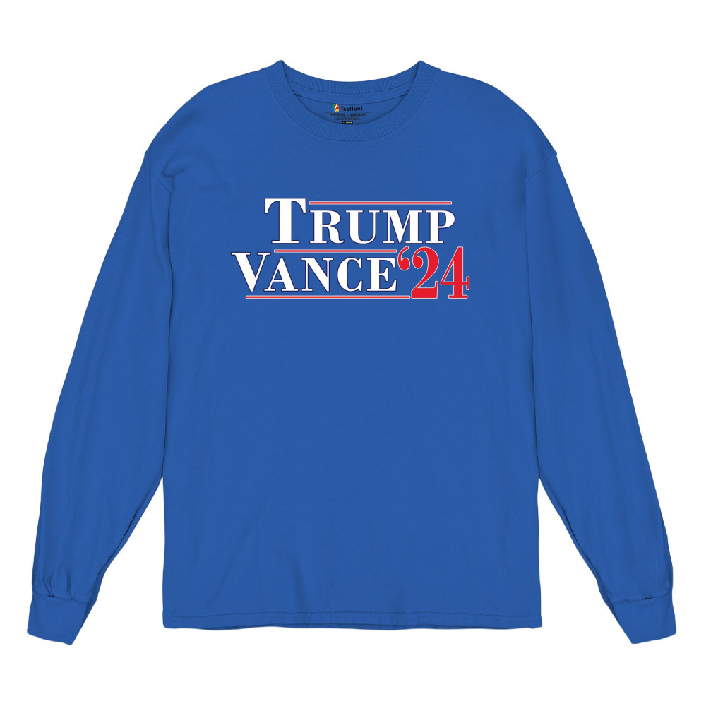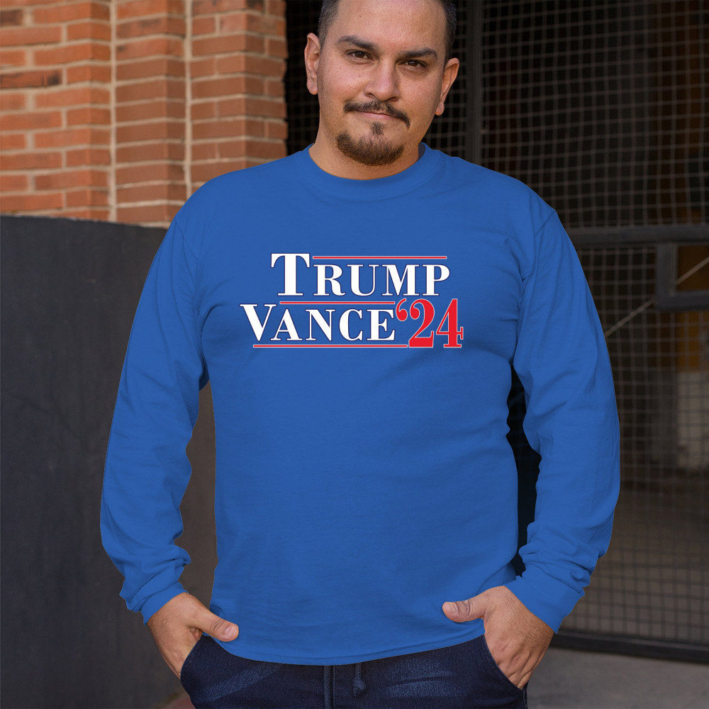 Show your support for Trump Vance 2024 with this patriotic design featuring bold red, white, and blue colors and a flag background. Perfect for rallies and conservative events.