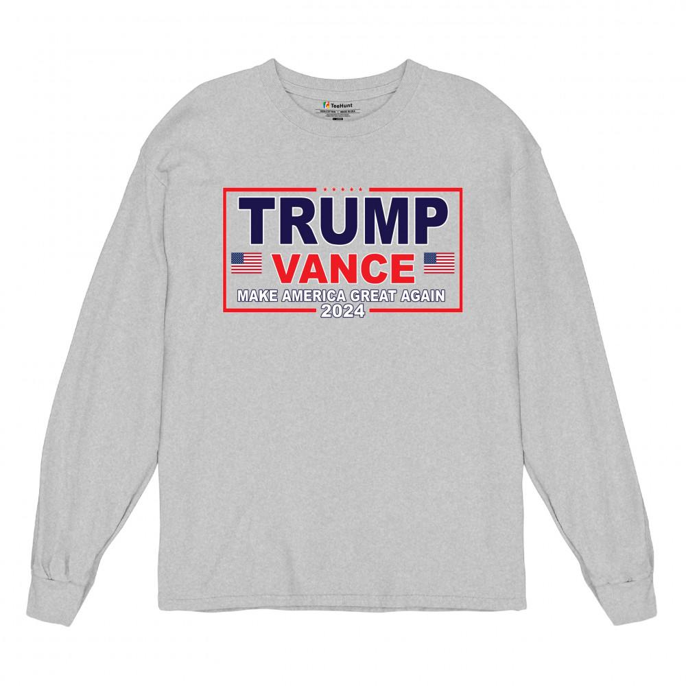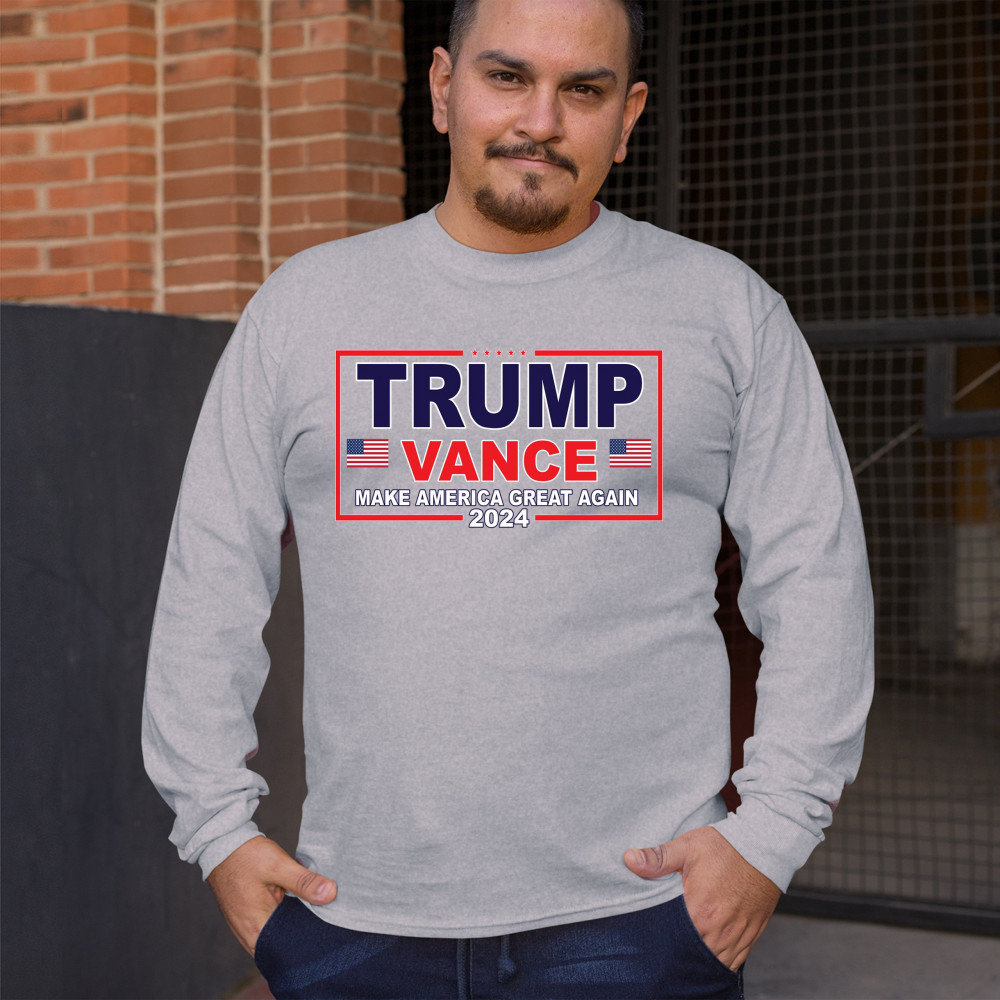 Showcase your support for the Trump-Vance 2024 campaign with this bold patriotic design featuring the American flag and "Make America Great Again" slogan.