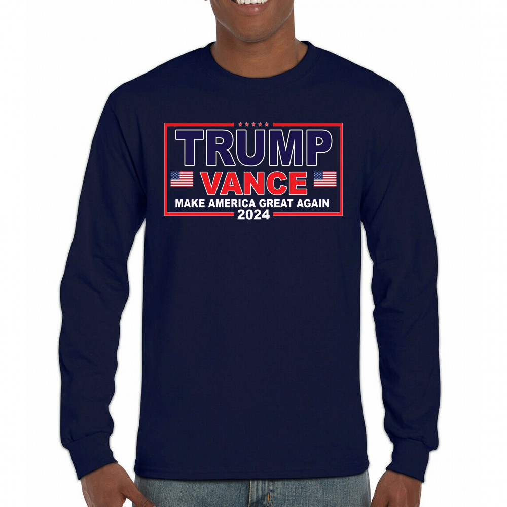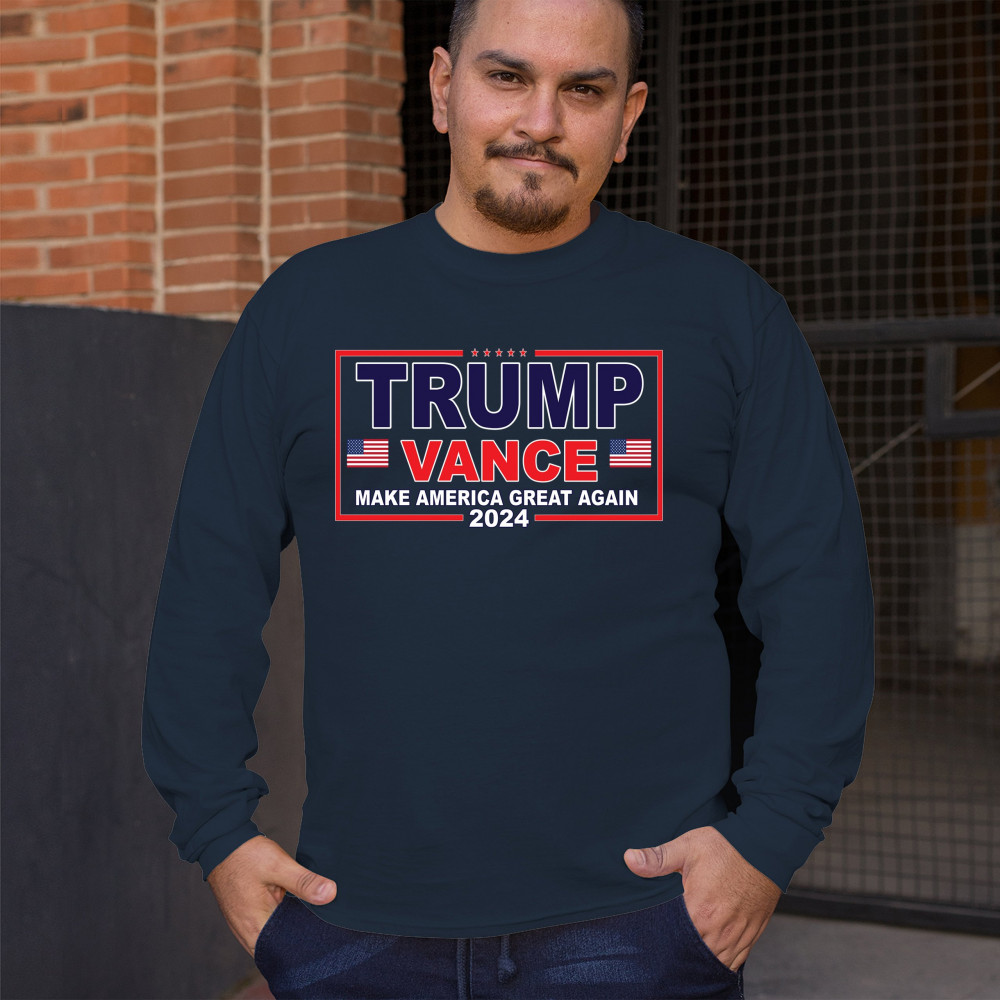 Showcase your support for the Trump-Vance 2024 campaign with this bold patriotic design featuring the American flag and "Make America Great Again" slogan.