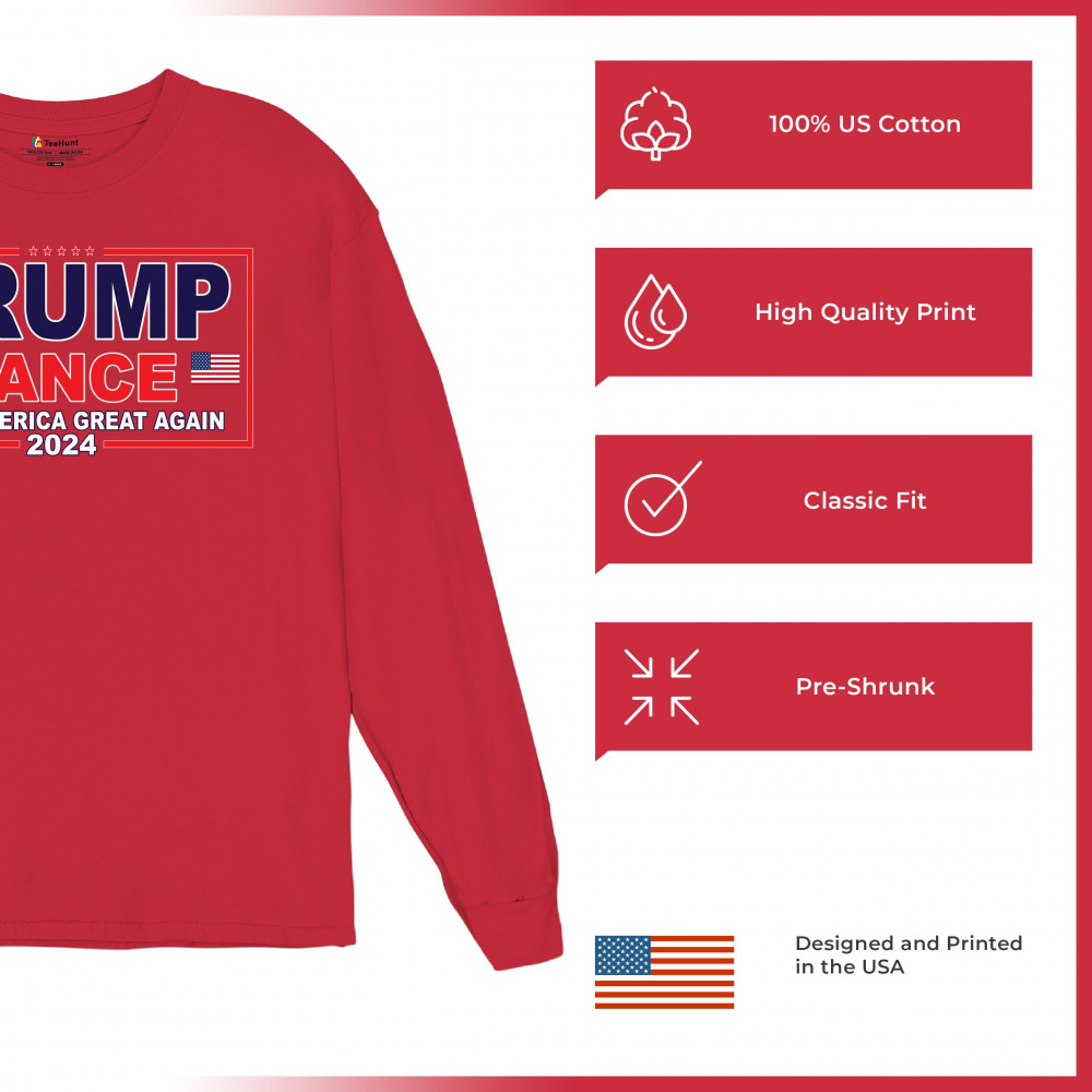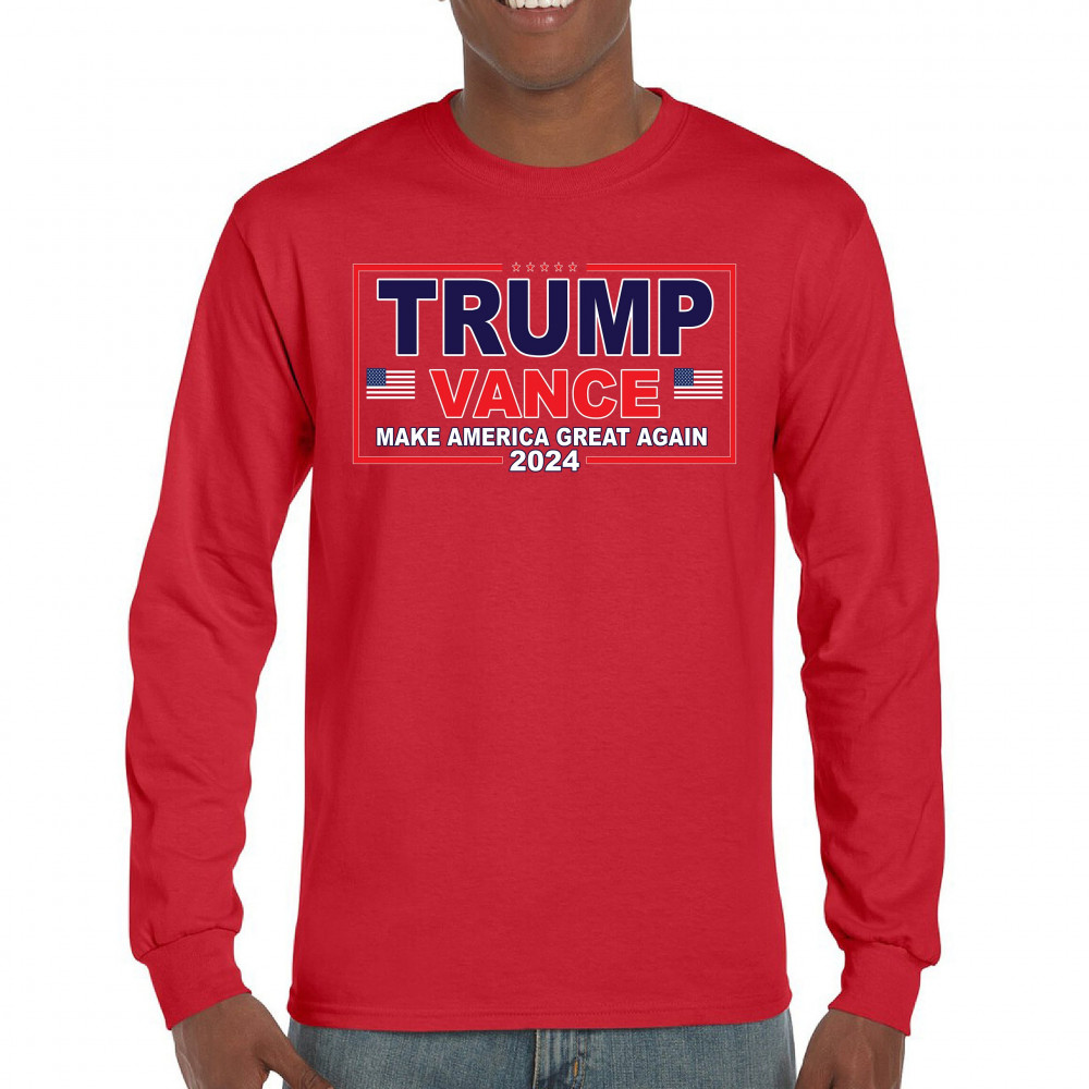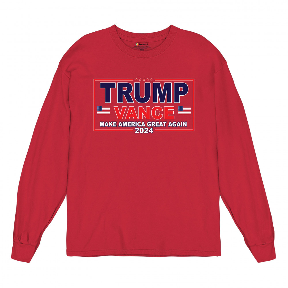 Showcase your support for the Trump-Vance 2024 campaign with this bold patriotic design featuring the American flag and "Make America Great Again" slogan.