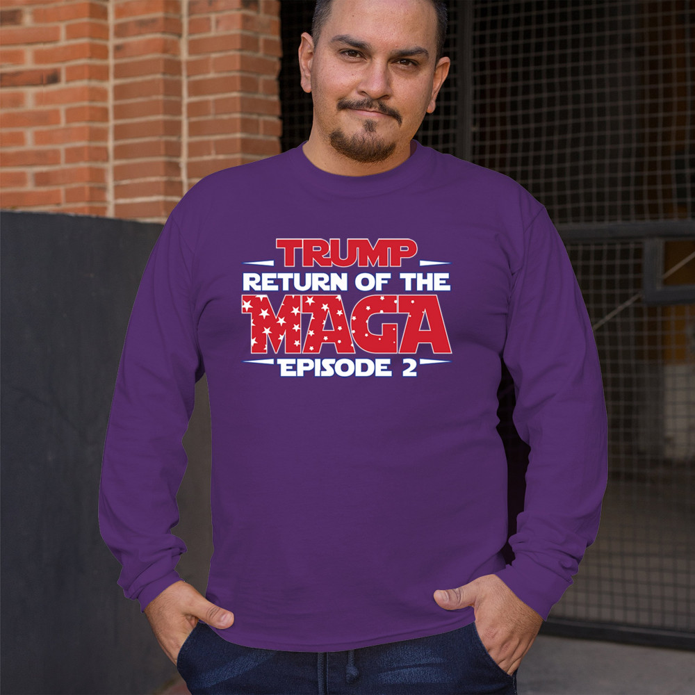 Join the "Return of the MAGA: Episode 2" movement. Celebrate Donald J. Trump, the Red Wave, and America First values with this bold design.