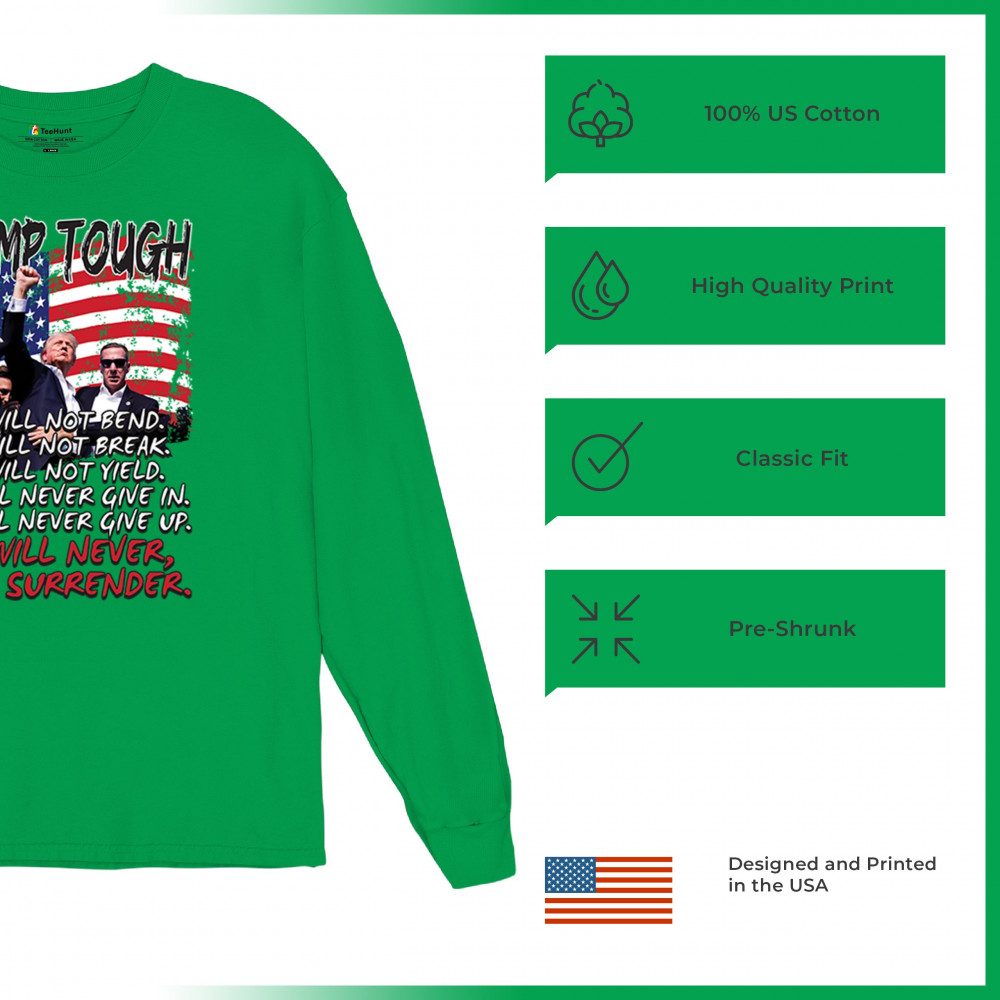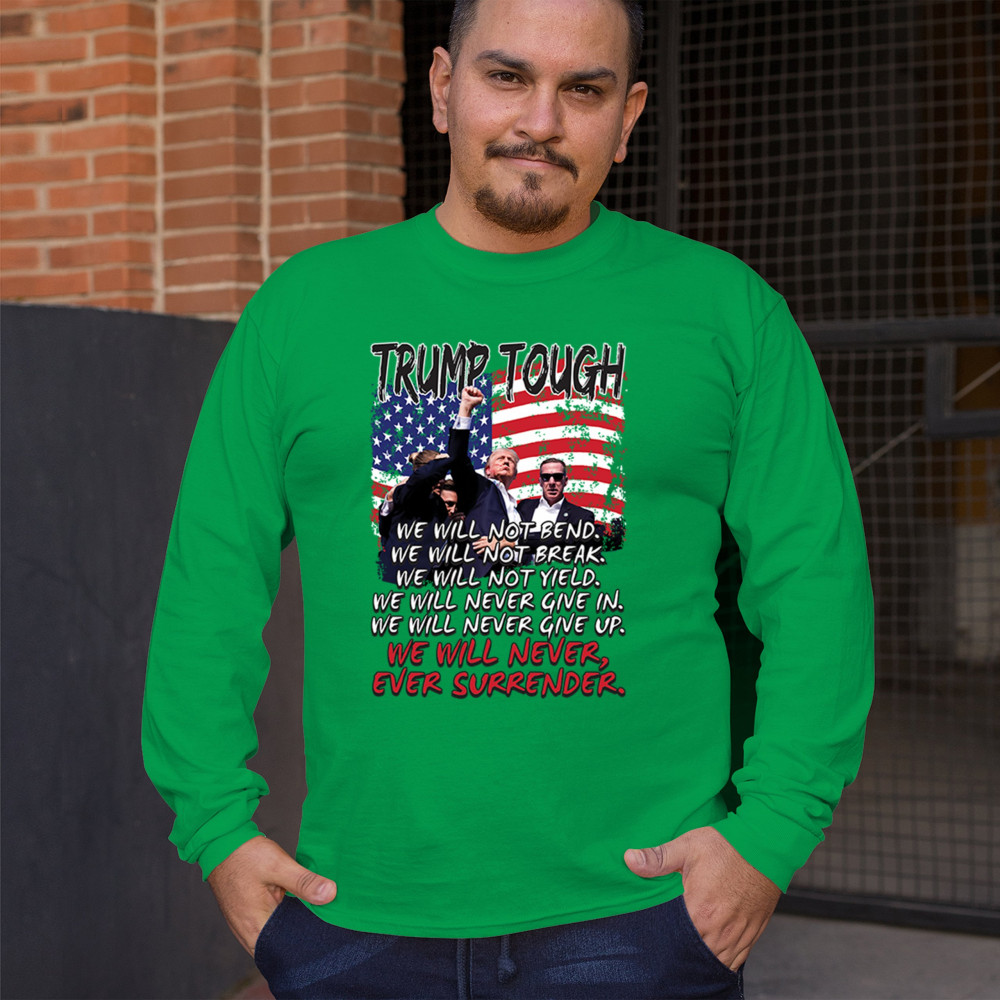 Express your support for Trump 2024 with this bold, patriotic design featuring the American flag and a powerful message. Never surrender your values.