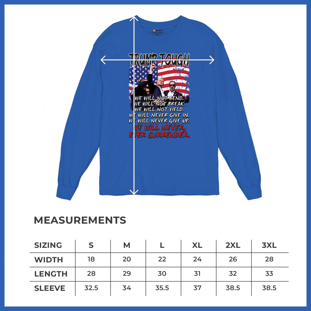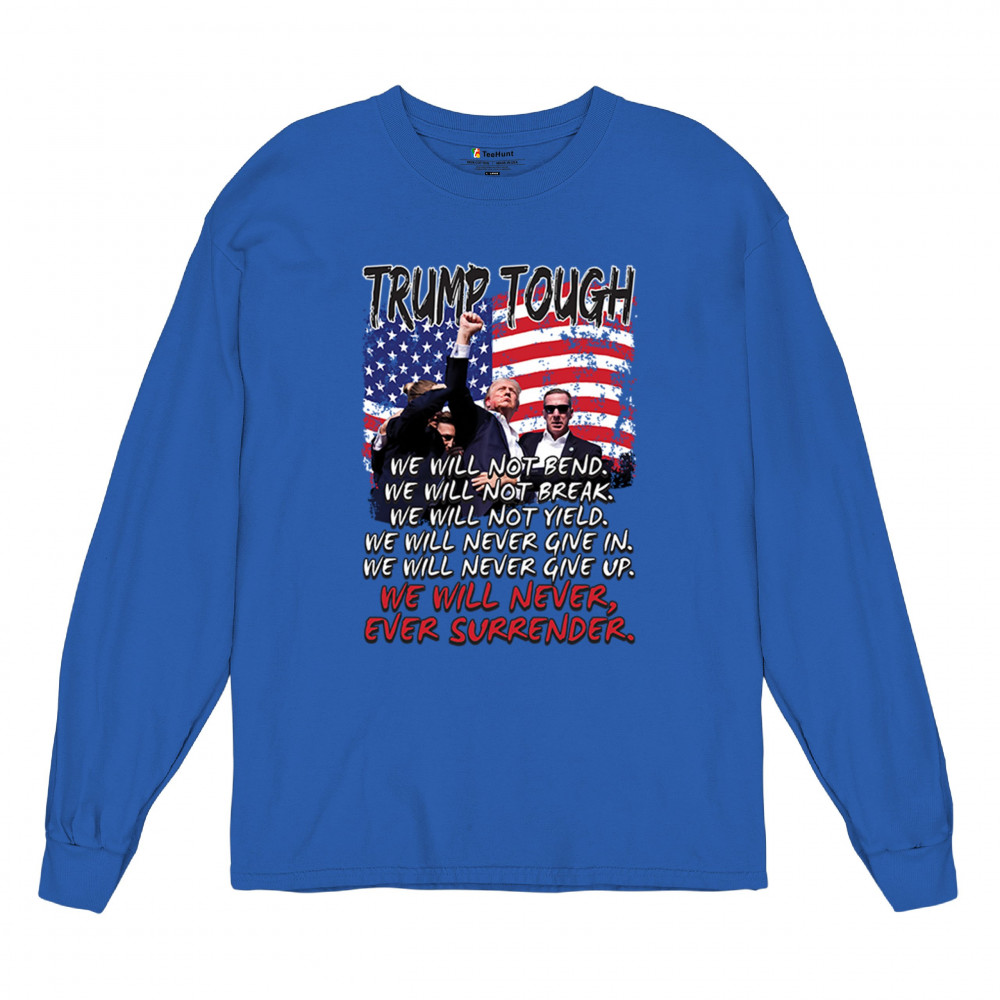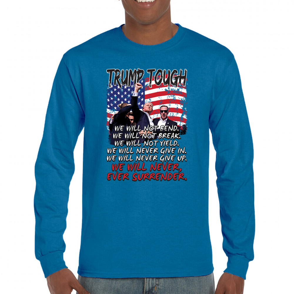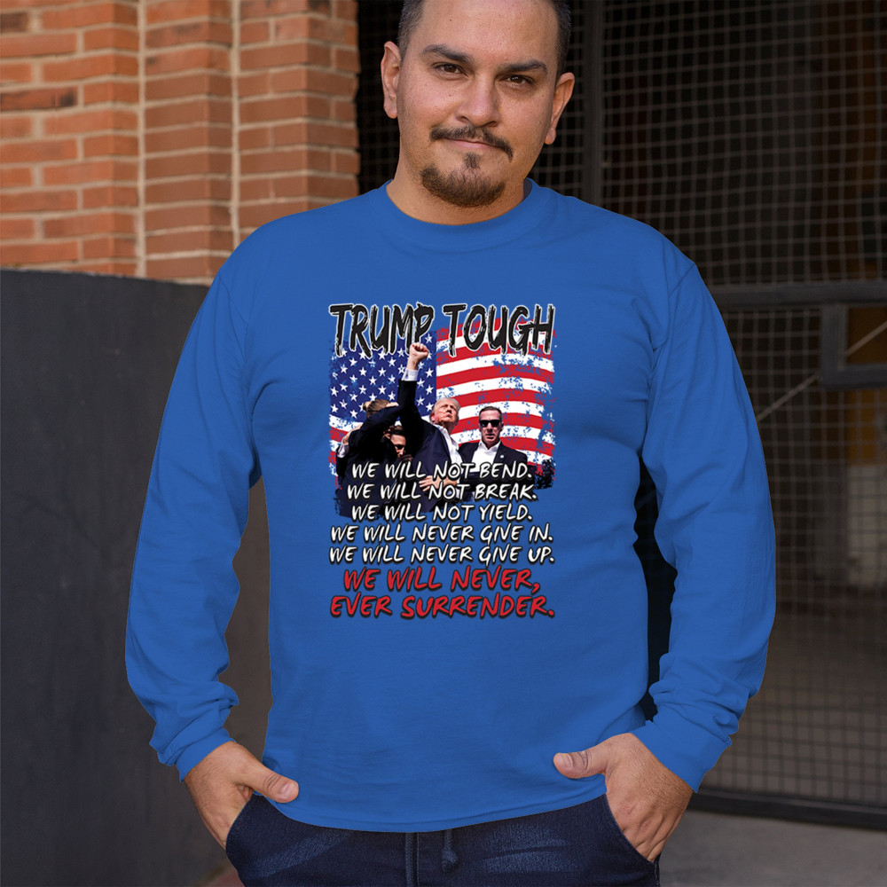 Express your support for Trump 2024 with this bold, patriotic design featuring the American flag and a powerful message. Never surrender your values.