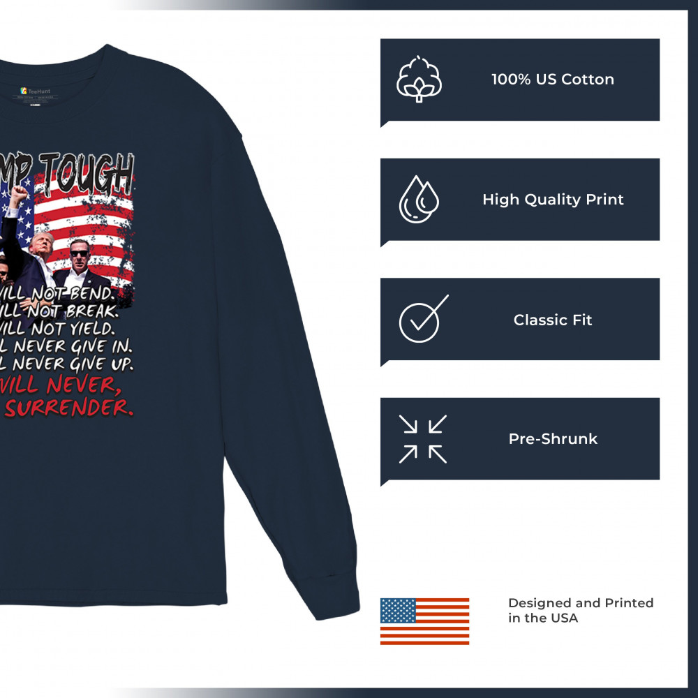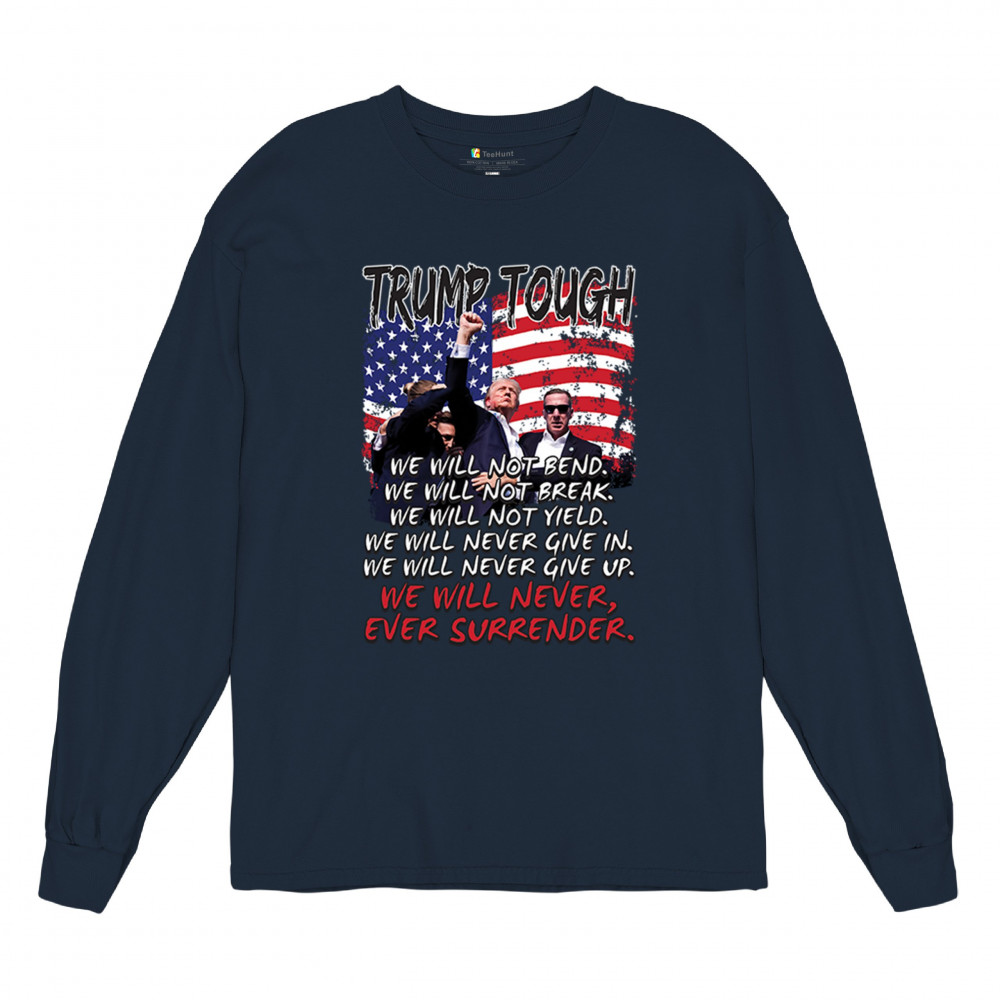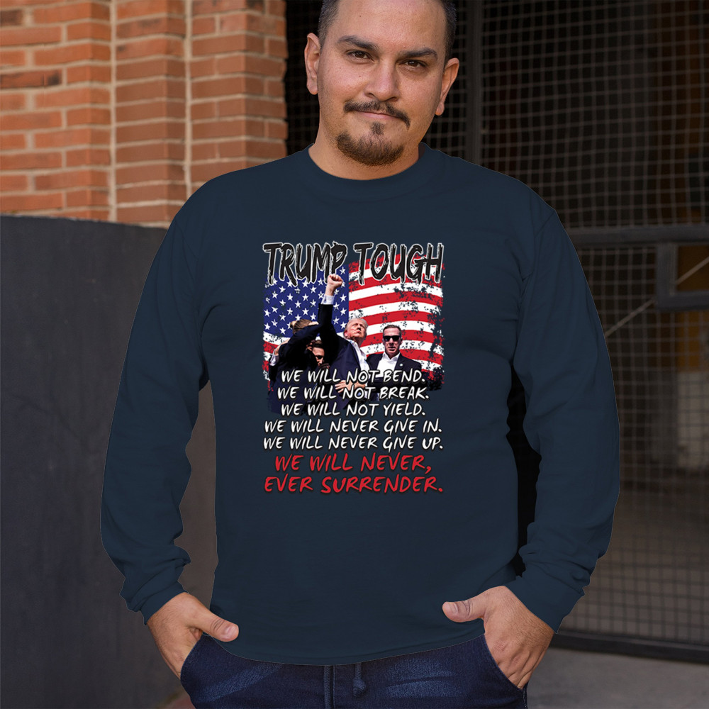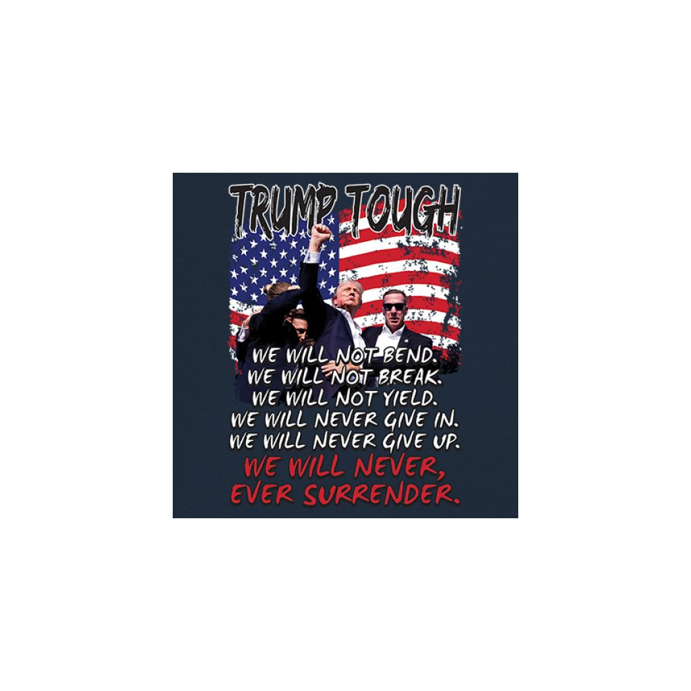 Express your support for Trump 2024 with this bold, patriotic design featuring the American flag and a powerful message. Never surrender your values.